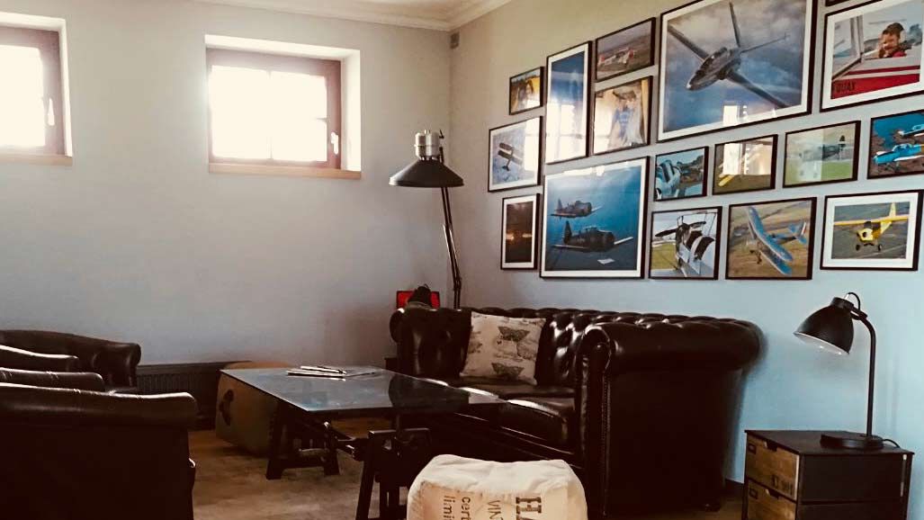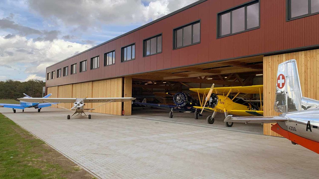 Gaststätte mit Biergarten und Verwaltungsgebäude (Büro und Konferenzräume), drei Hangars in unterschiedlicher Größe (700-1800qm), Werkstätten, Außenbereich ca. 20ha Grasflächen.