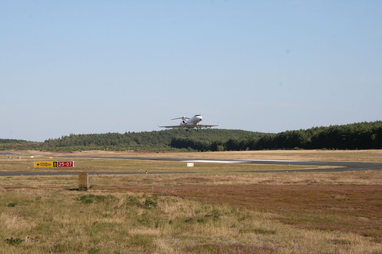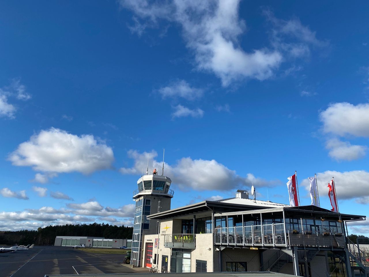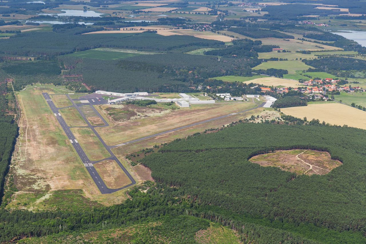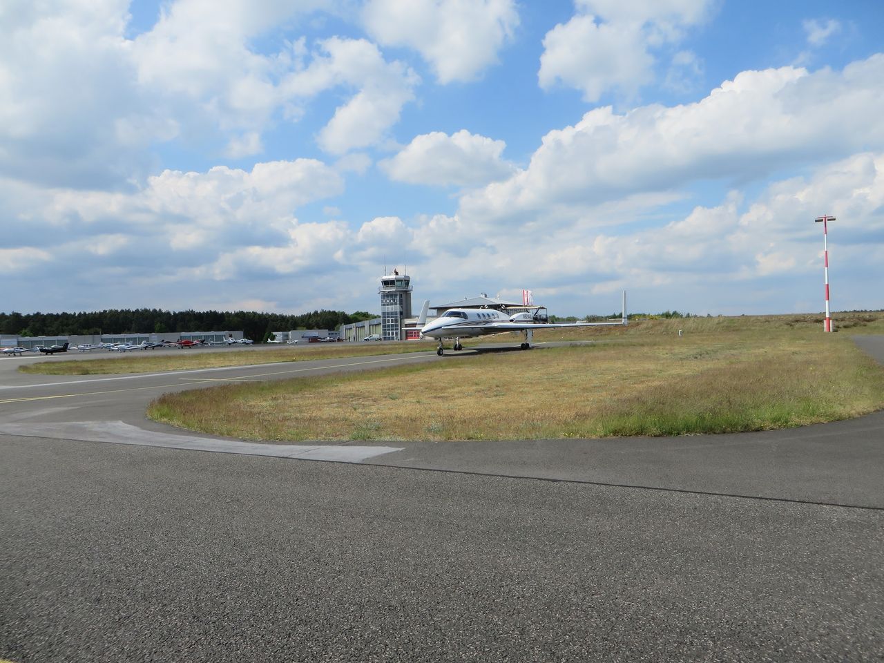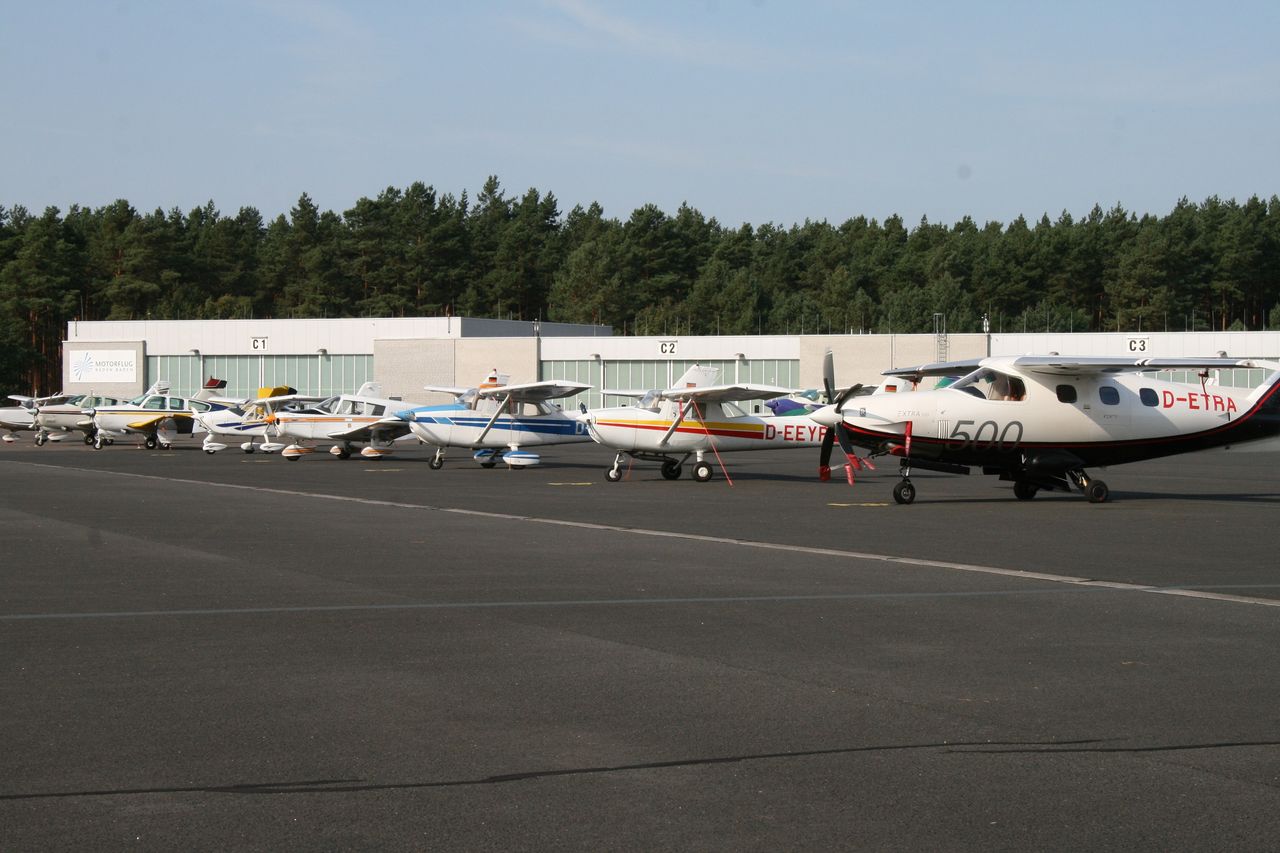 Flugplatz Schönhagen, Luftfahrtaffine Unternehmen, vom Segelflug bis zum Jet-Verkehr, Flugschulen, Luftsportclub, Charterunternehmen, an der B 246 zwischen Beelitz und Trebbin, Flachdachhalle mit grauem Kratzputz, super Restaurant und Tower.