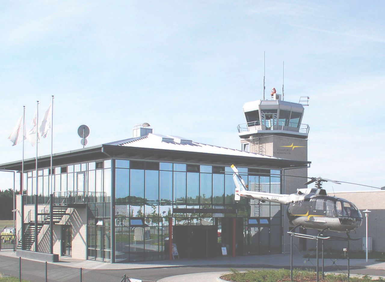 Flugplatz Schönhagen, luftfahrtaffine Unternehmen, vom Segelflug bis zum Jet-Verkehr, Flugschulen, Luftsportclub, Charterunternehmen, an der B 246 zwischen Beelitz und Trebbin, unterschiedliche Flachdachhallen mit grauem Kratzputz, oder Metall, super Restaurant im Terminal und Tower.