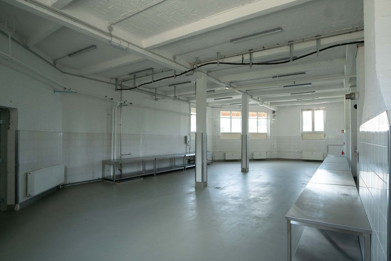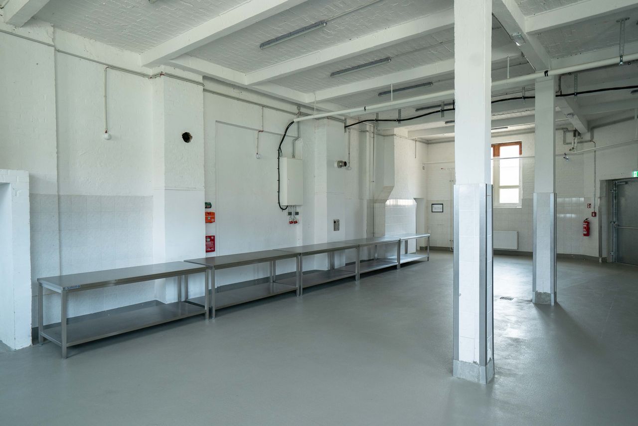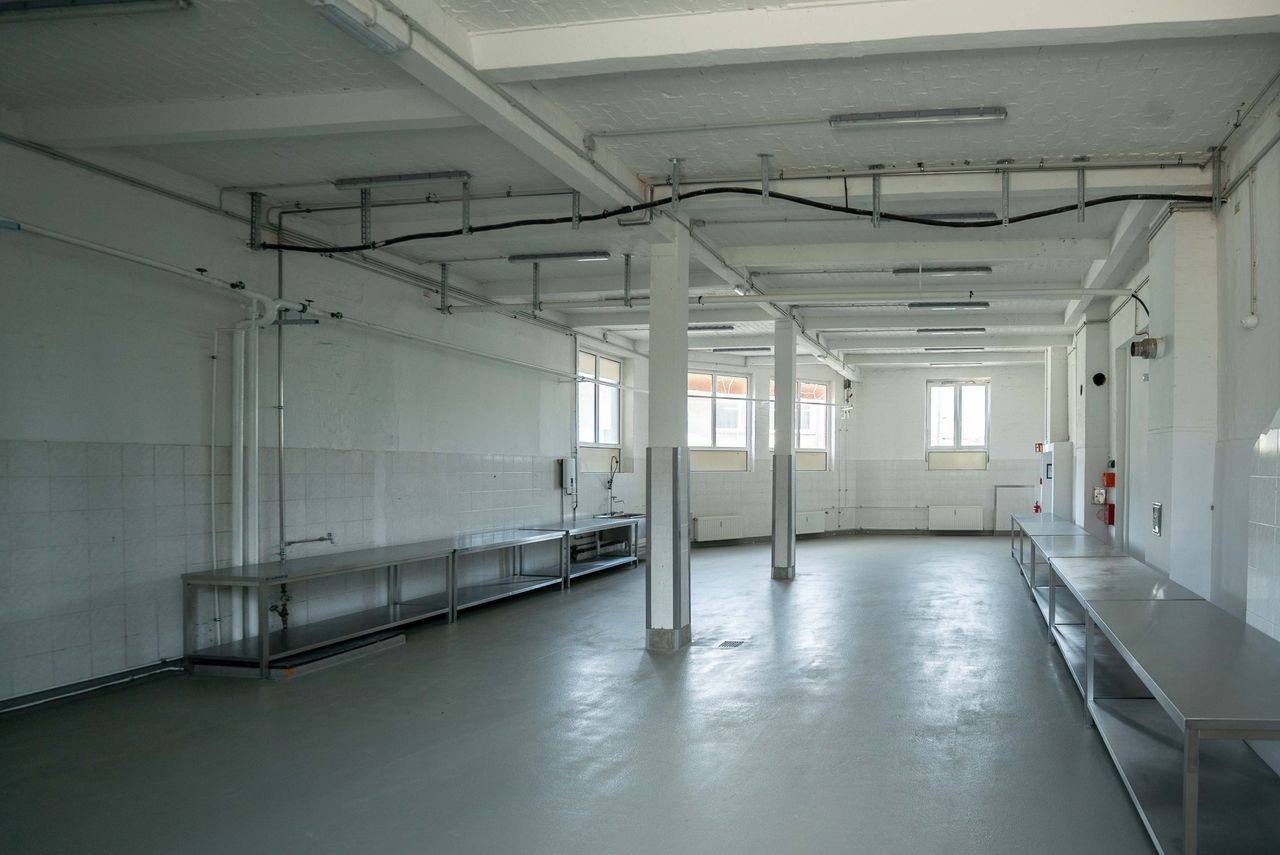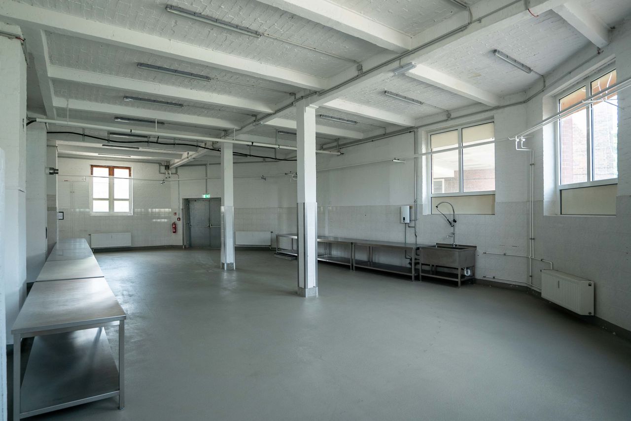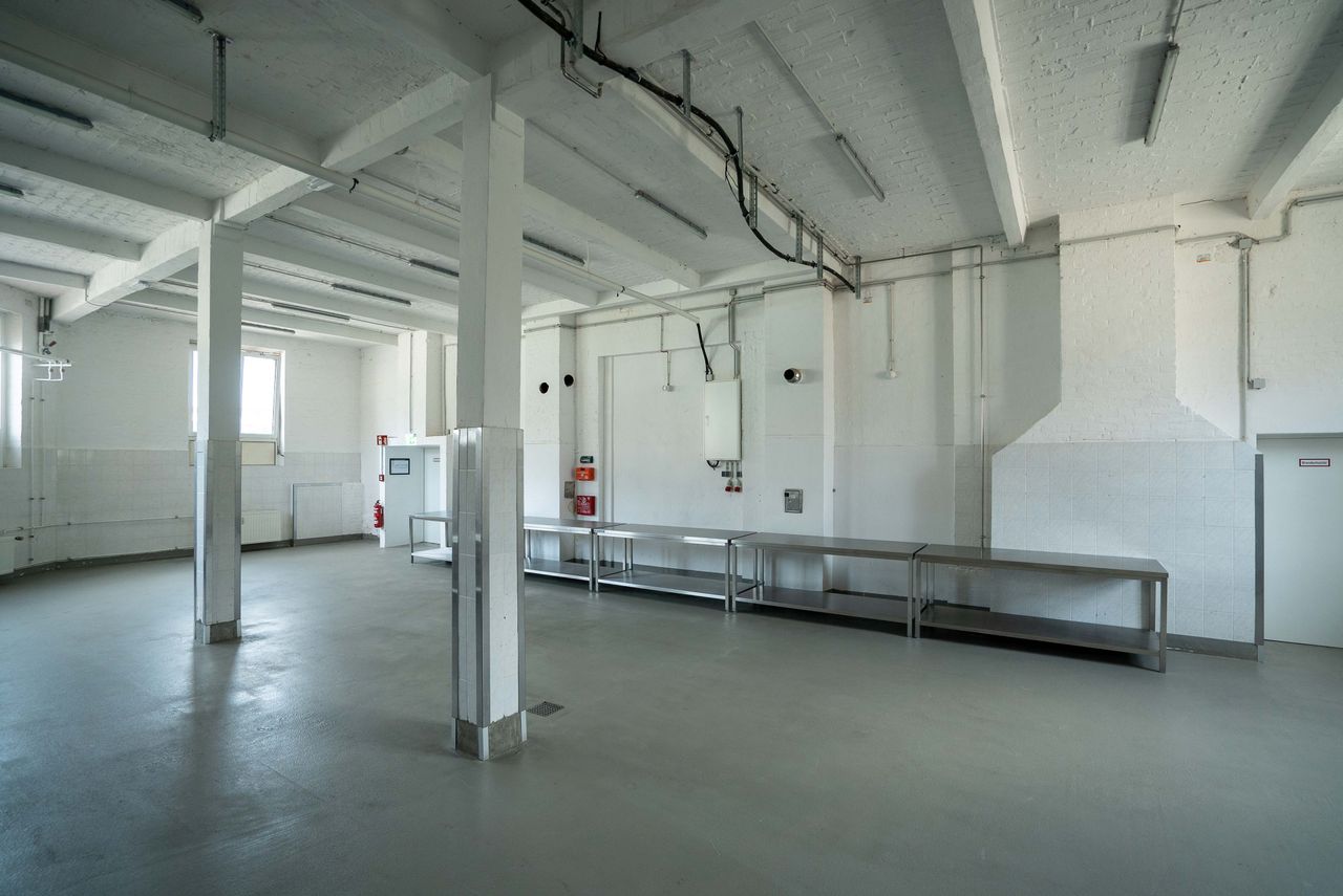 Die 200 qm große Studiofläche liegt im Erdgeschoss, angrenzend an die große Halle des Motorwerks. Der Studioboden ist aus grauem Sichtbeton, Wände und Decken sind weiß gestrichen. Der Raum ist mit Edelstahltischen ausgestattet, die - bis auf die Spüle - entfernt werden könne bzw. individuell genutzt werden können.