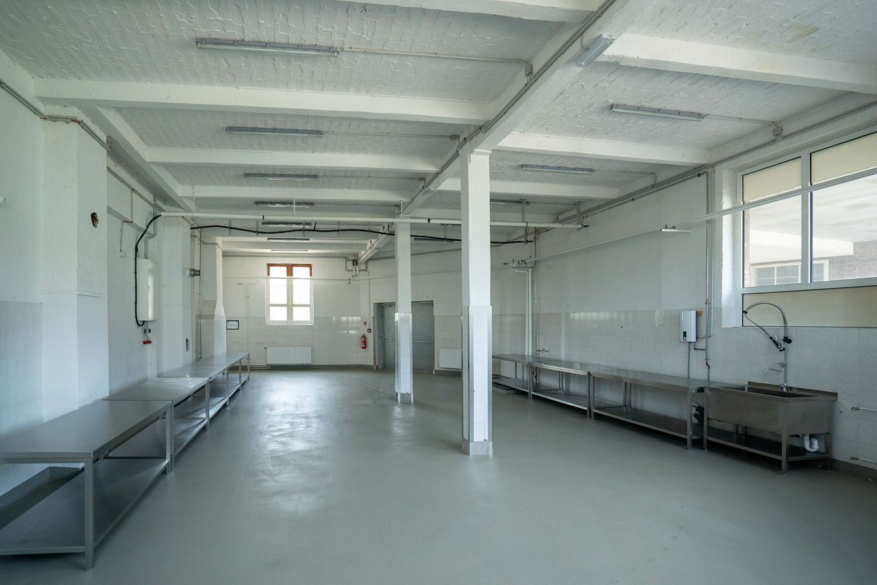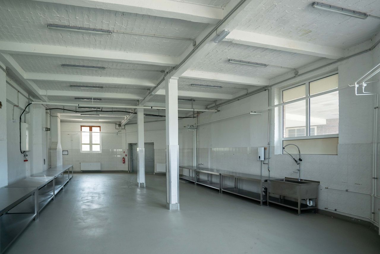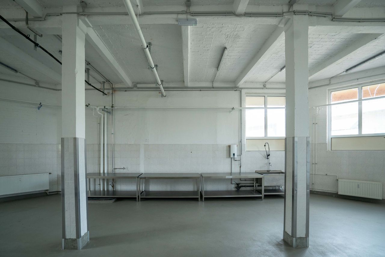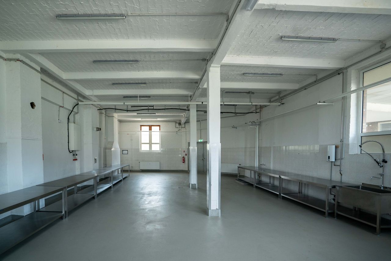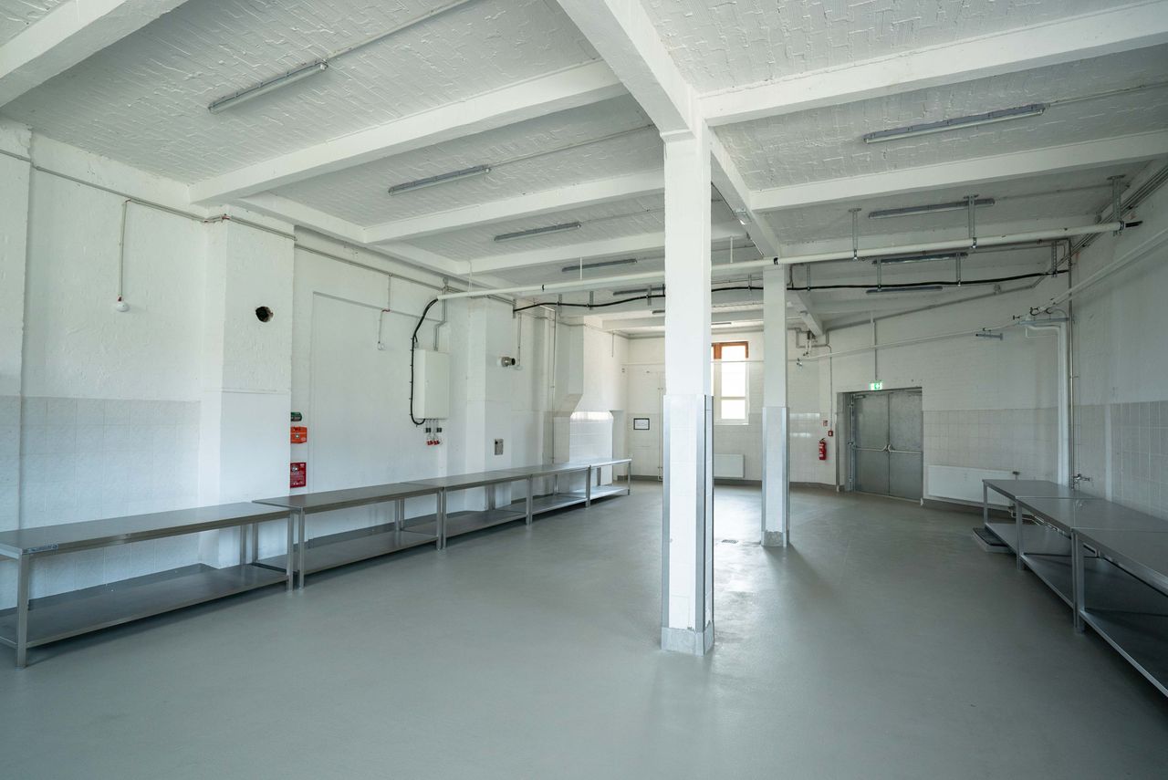 Die 200 qm große Studiofläche liegt im Erdgeschoss, angrenzend an die große Halle des Motorwerks. Der Studioboden ist aus grauem Sichtbeton, Wände und Decken sind weiß gestrichen. Der Raum ist mit Edelstahltischen ausgestattet, die - bis auf die Spüle - entfernt werden könne bzw. individuell genutzt werden können.