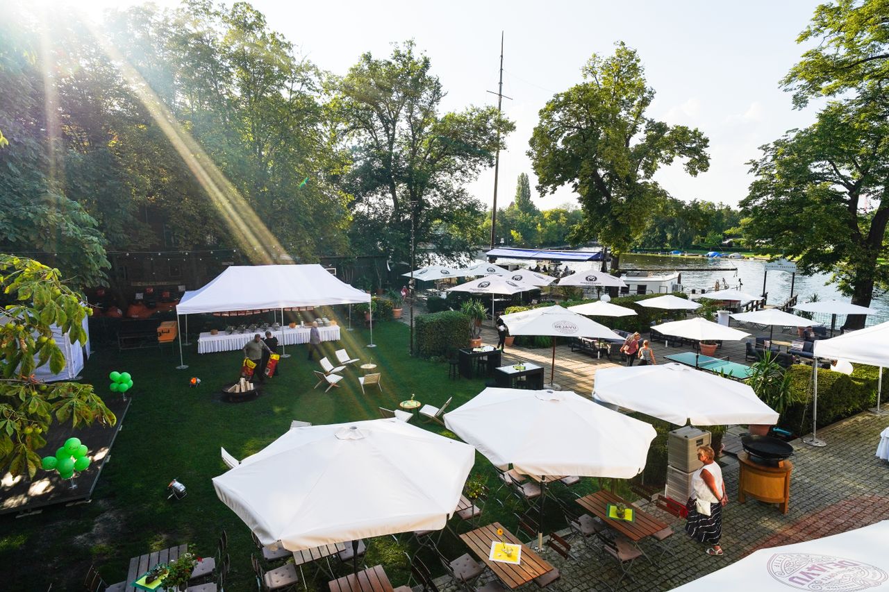 Indoor ist die alte, lichtdurchflutete Turnhalle zu einem Veranstaltungssaal umgestaltet worden.