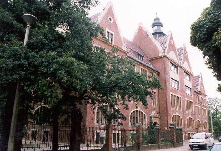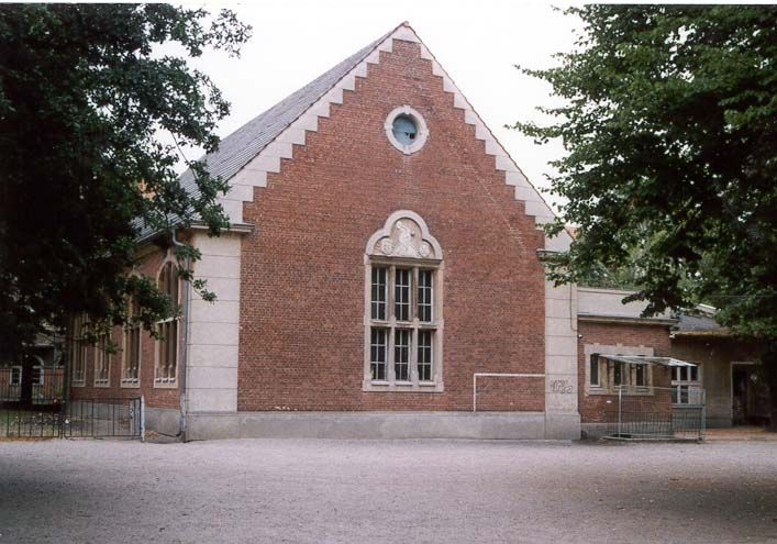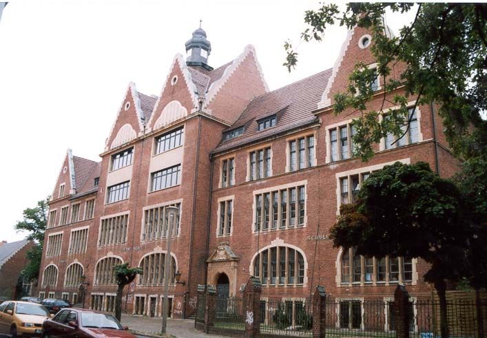 Backsteinbau von 1911 mit zwei Gebäuden, großem Schulhof und Turnhalle