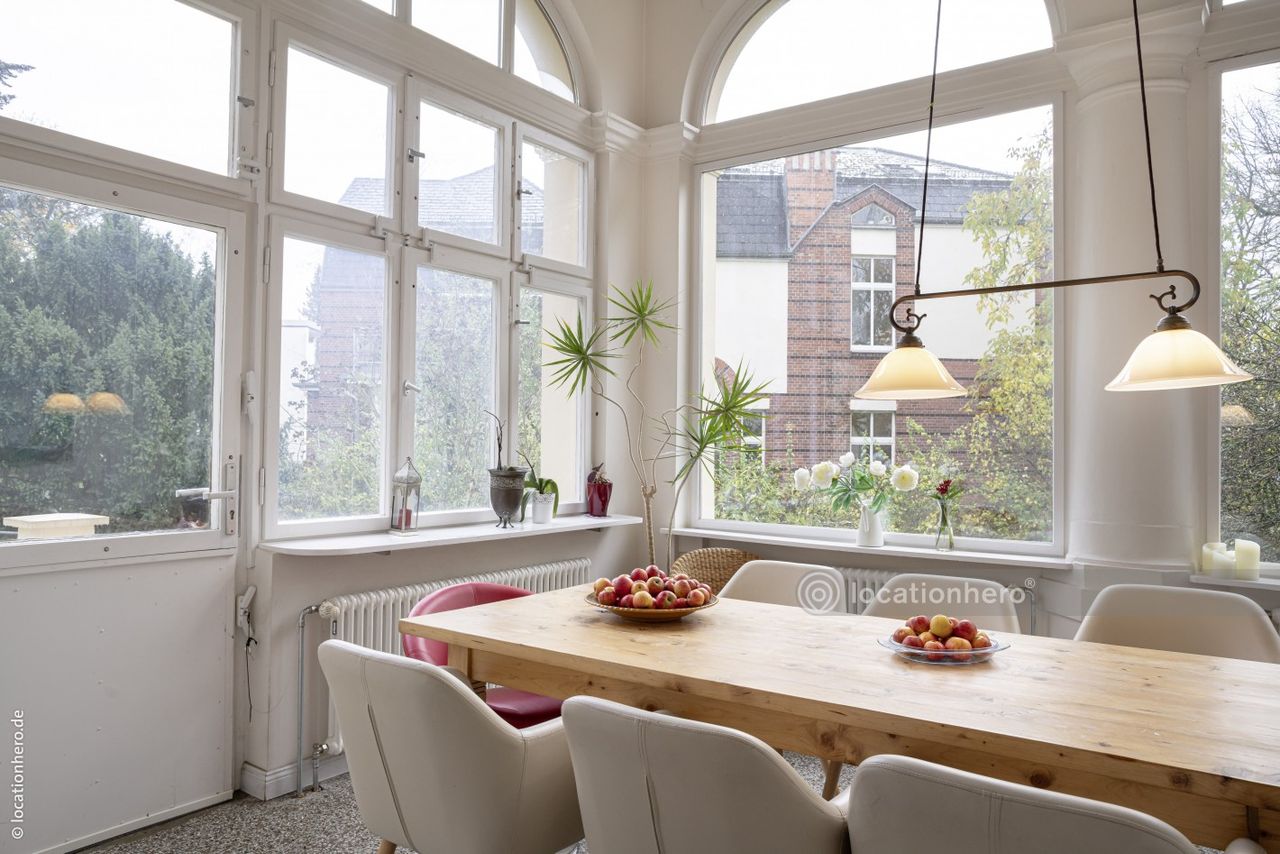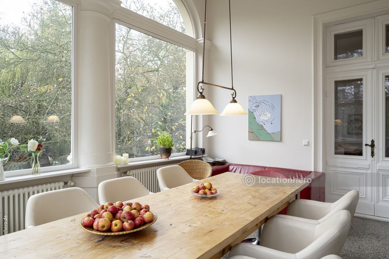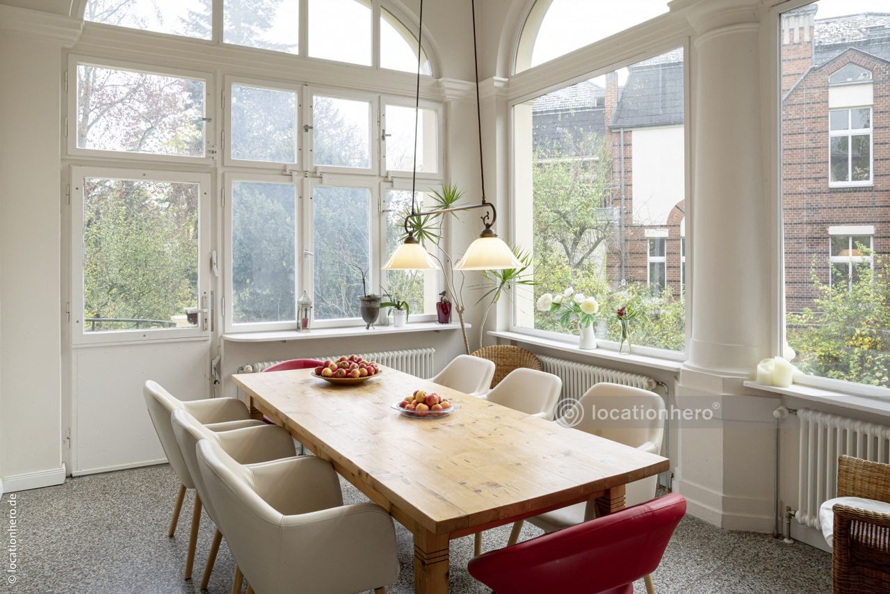 Anile ist eine stattliche Gründerzeitvilla aus dem Ende des 19.JH. Große Fenster, lange Fluchten durch mehrere Räume und breite Schiebe - b.z.w. Flügeltüren prägen dieses Haus. Viele Details wie Verglasungen und Fensteroliven sind noch original erhalten. Die ausgedehnte Terrasse bietet einen sehr schönes Blick in den 1500qm großen Garten.