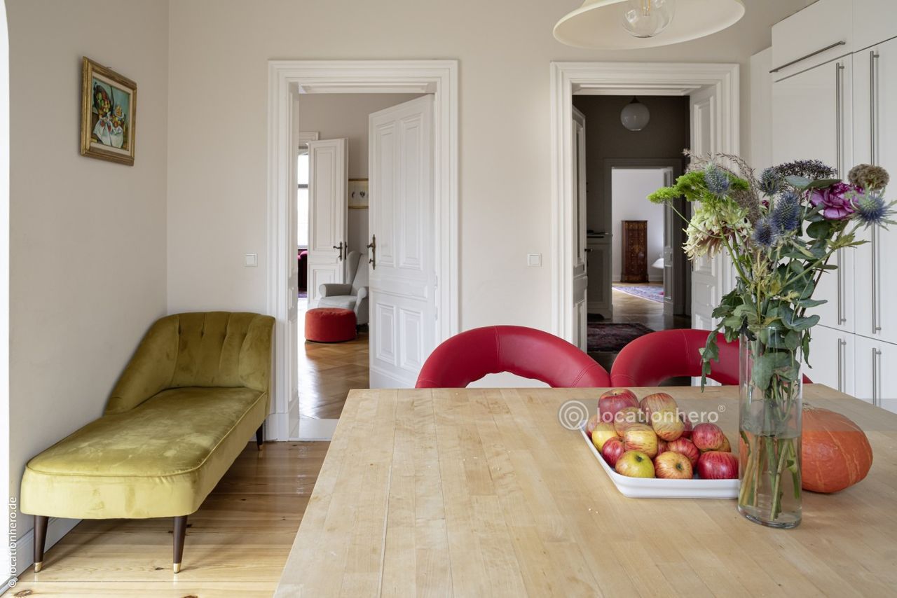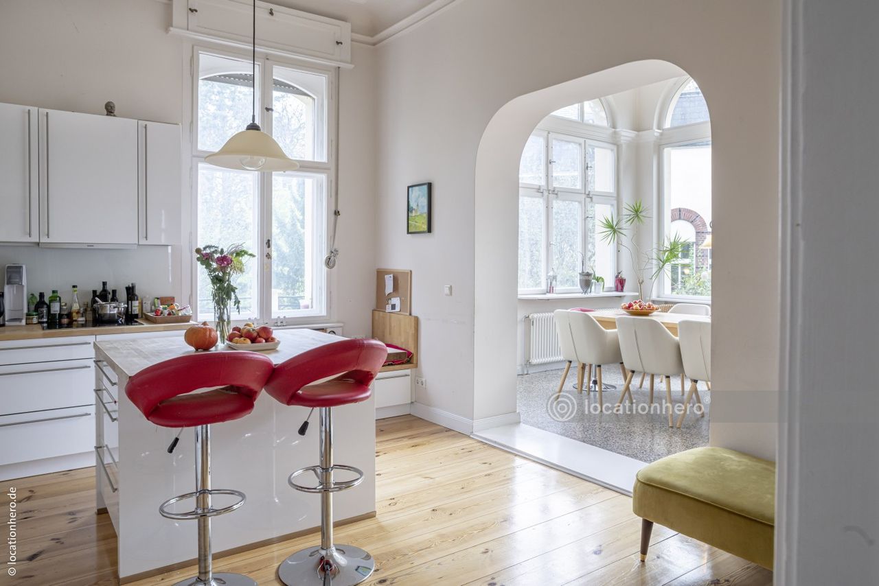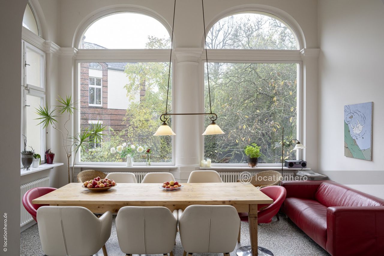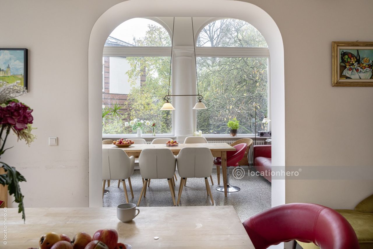 Anile ist eine stattliche Gründerzeitvilla aus dem Ende des 19.JH. Große Fenster, lange Fluchten durch mehrere Räume und breite Schiebe - b.z.w. Flügeltüren prägen dieses Haus. Viele Details wie Verglasungen und Fensteroliven sind noch original erhalten. Die ausgedehnte Terrasse bietet einen sehr schönes Blick in den 1500qm großen Garten.