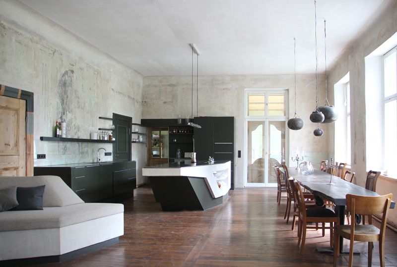Im Gutshaus befinden sich auf ca. 650 m² Nutzfläche eine große Eingangshalle mit Kamin und angrenzendem Wintergarten der zum rückwärtigen Garten hinausführt, ein Rittersaal der als Gemeinschaftsbereich zum kochen und als Kaminzimmer dient, sowie einen großen Probenraum. Neben diesen Gemeinschaftsflächen gibt es 13 privat genutzte, individuell gestaltete Schlafbereiche mit Bad und weiteren Balkons sowie einen großen renovierten Dachboden. Eine große nach Süden hin ausgerichtete Terrasse verbindet den leicht ansteigenden Park mit dem Gutshaus und bietet die Möglichkeit, im Schatten der alten Bäume mit Blick über