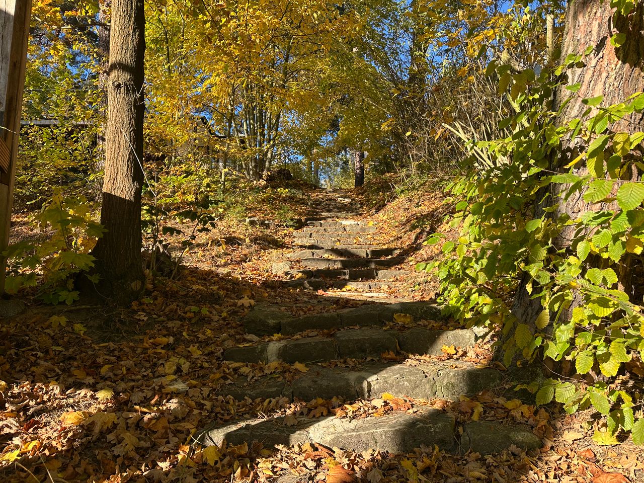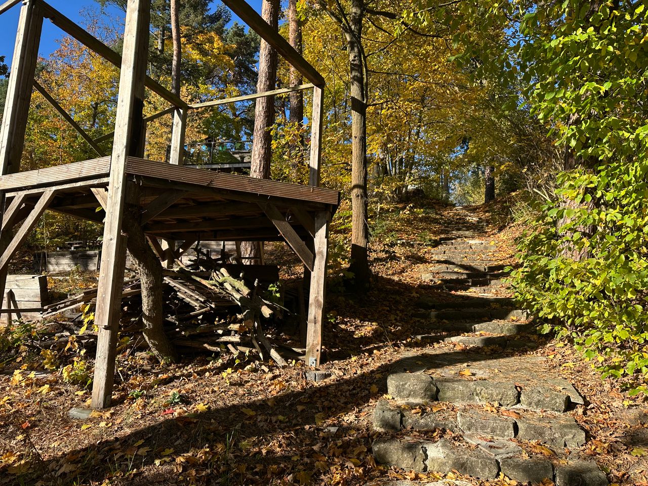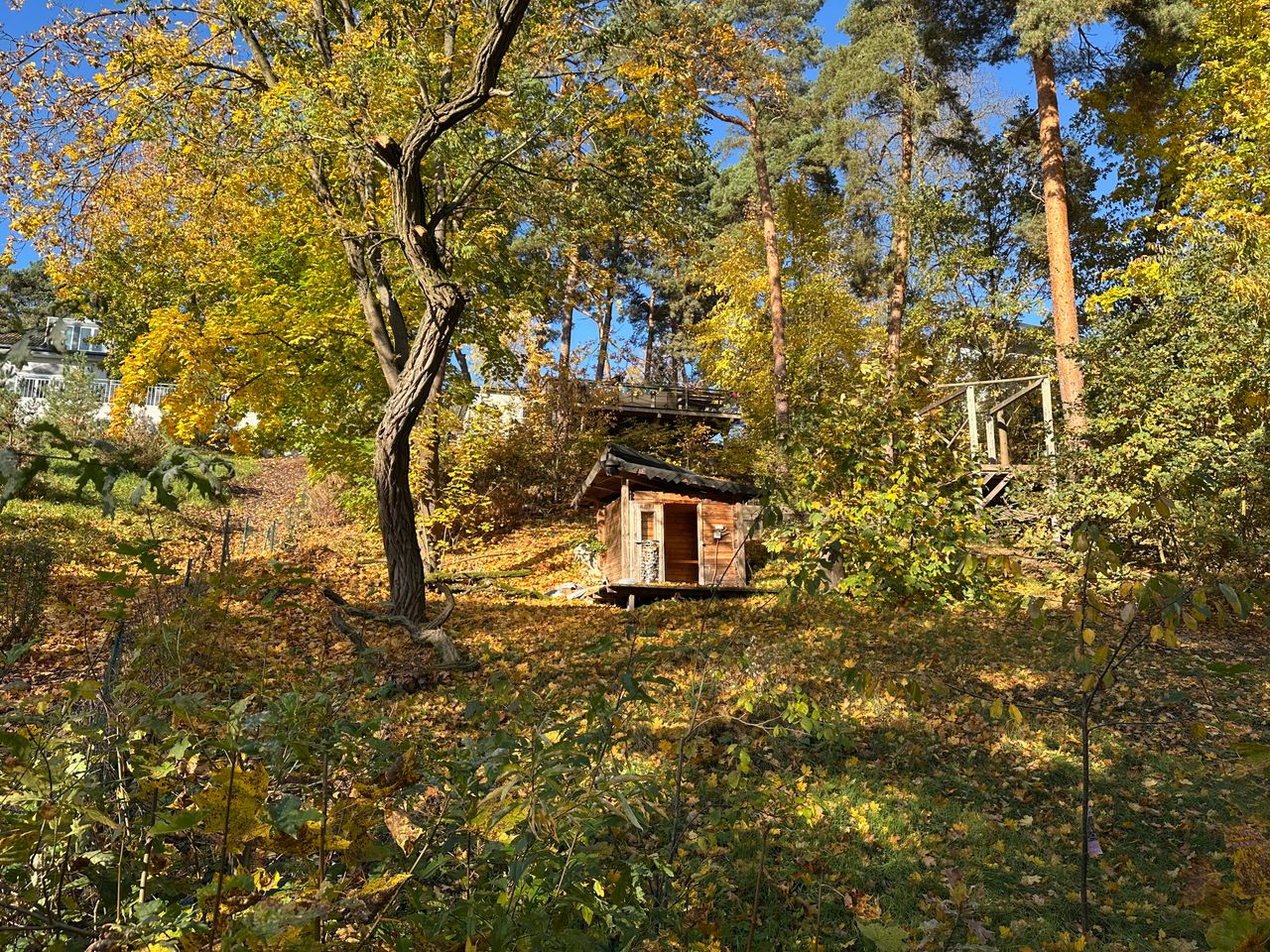 Das Grundstück ist mit 2500qm groß, am Hang gelegen, abfallend zum See mit Privatstrand. Am Hang steht eine freistehende Sauna. Die Kombination aus kleinem, historischem Häuschen und großem Panoramafenster neben 100 Jahre alten Doppelfenstern ist einmalig. Der Boden ist großteils original aus den 20er Jahren – Stein-Klinker und Holzdielen.