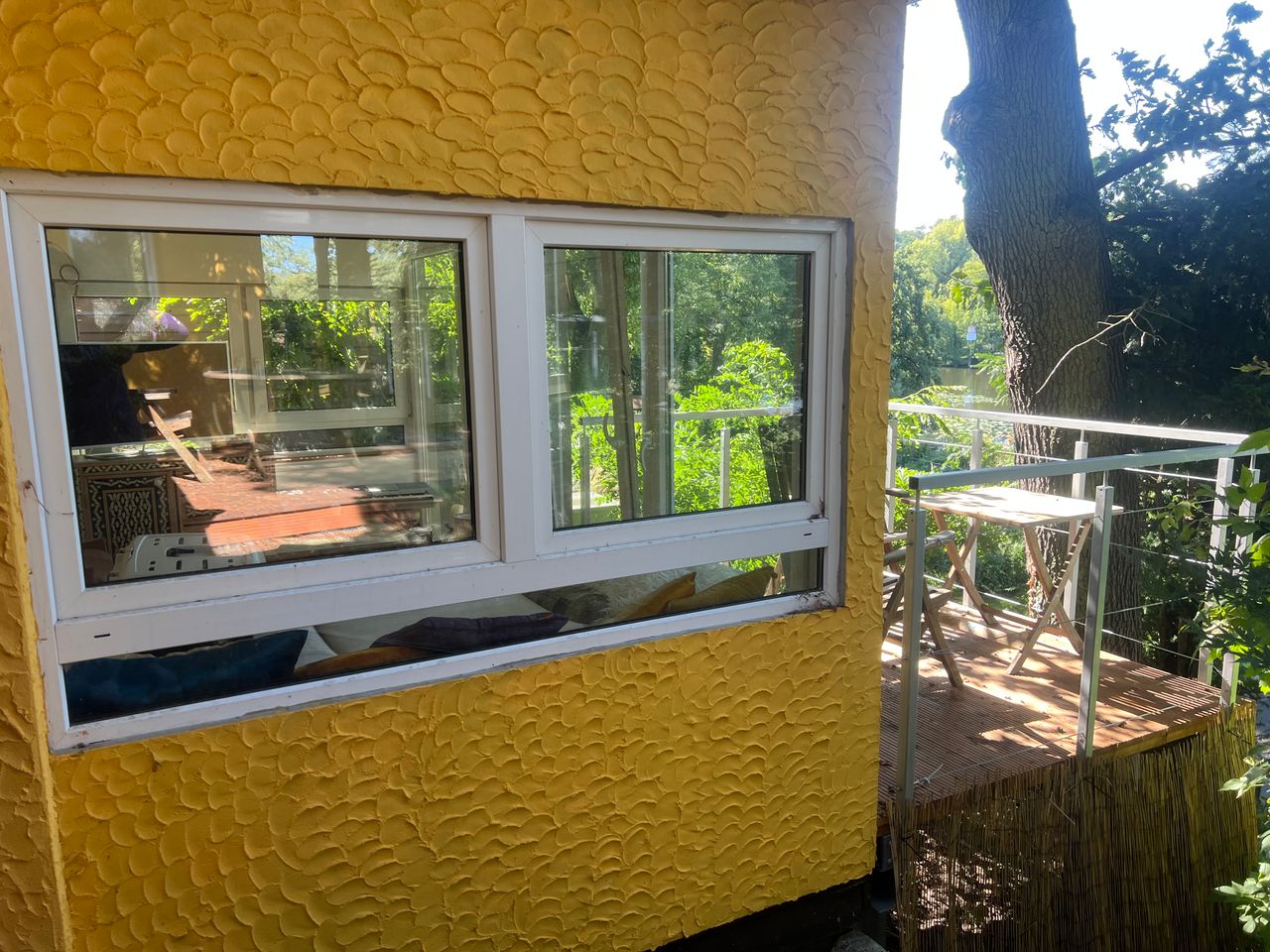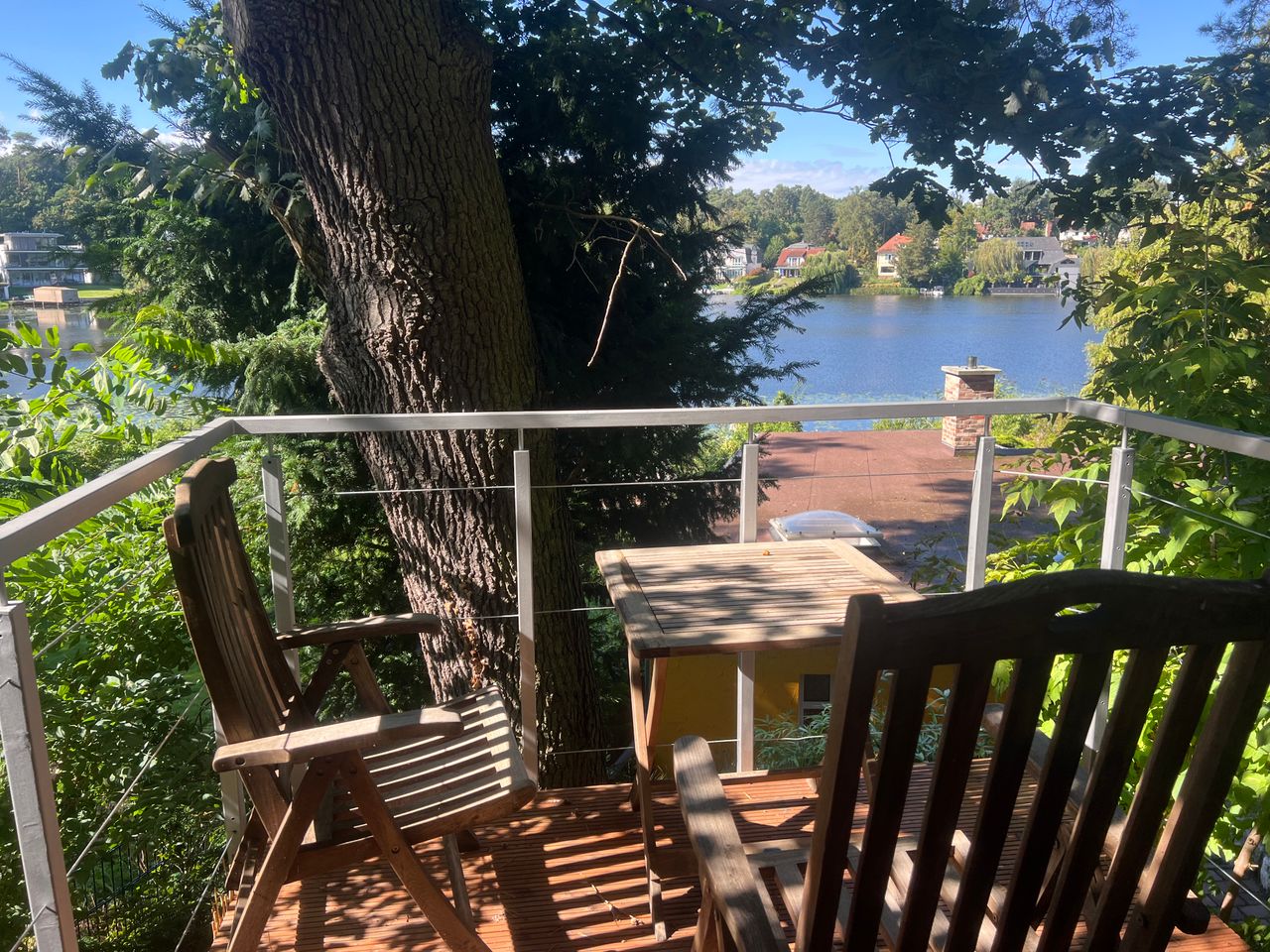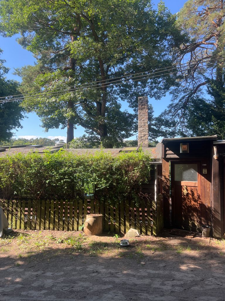 Das kleine Häuschen befindet sich im Wald ebenerdig zum Waldweg oben auf einem Hanggrundstück mit tollem Blick über das unten am Stölpchensee gelegene Haupthaus.
