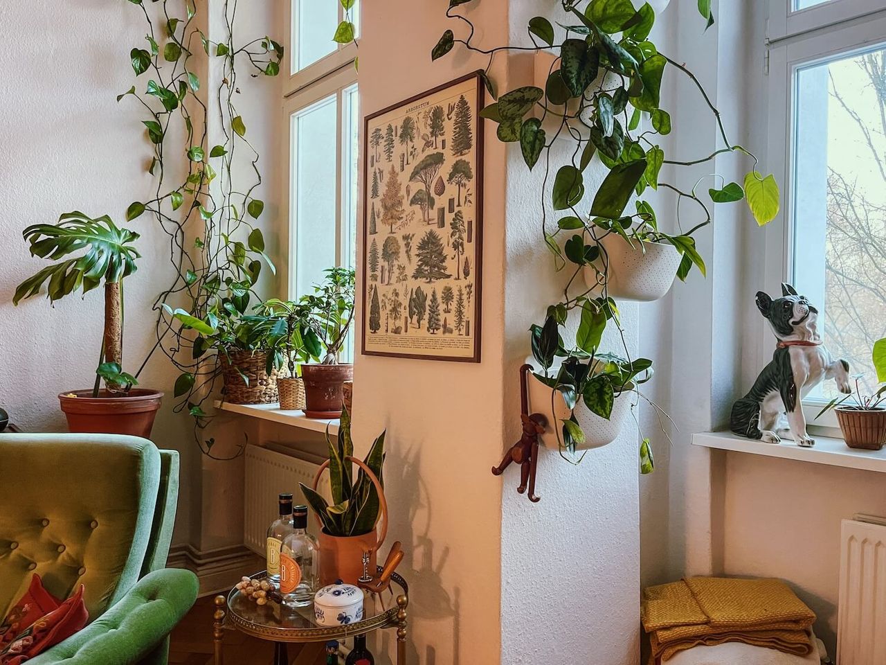 An urban jungle with over 200 plants provides a vibrant and cozy backdrop for any type of shoot. This home is a mix of new and vintage, mainly mid century modern pieces from Denmark, Kleinanzeigen and even street finds. A tall custom made bookcase displays books, art, pottery and antiques, all with a personal story and unique look. A typical Berlin Altbau with high ceilings and herringbone parquet floors in the living room (and views of the Treptow park and lake). Note from the owner: "I like to welcome the crew and get everyone settled in, then go for a walk and give everyone some privacy to do their work." Please click link below and press "Message Home Studio" to contact owner directly: