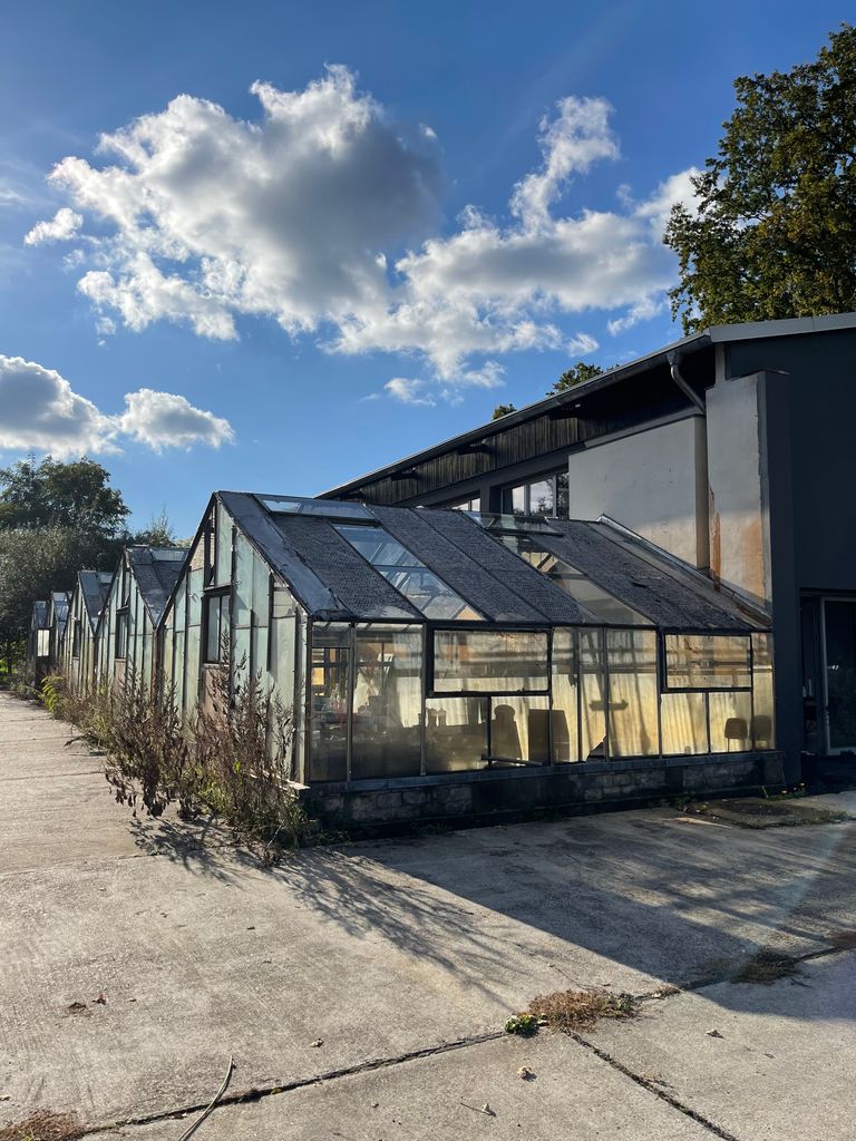 Die Halle auf dem Baumschulgelände wurde in Teilen saniert, u.a. die in der Halle befindlichen Büros, Sozial- und Aufenthaltsräume. Diese sind hell und modern. Vor allem ins Auge sticht der große und hohe wie helle Küche / Aufenthaltsraum / Atrium mit einer Raumhöhe von circa 5,50 m. Dieser ist auch einsehbar von einigen Räumen im OG. Letztere sind von eher normaler Deckenhöhe, aber durch die weißen Wände und hellen Holzböden dennoch nicht beengend. Das Innengebäude mit den beschriebenen Räumlichkeiten nimmt etwa 1/3 der Halle ein und bietet eine hohe Flexibilität an möglichen Motiven - von wohnlichen Szenen bis hin zu modern, künstlerischen Arbeitsräumen. Direkt angrenzend an die Halle liegen 5 charmant-marode Gewächshäuser.