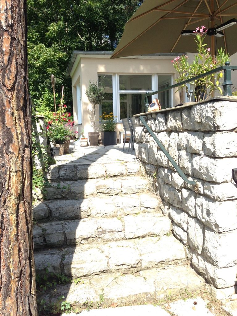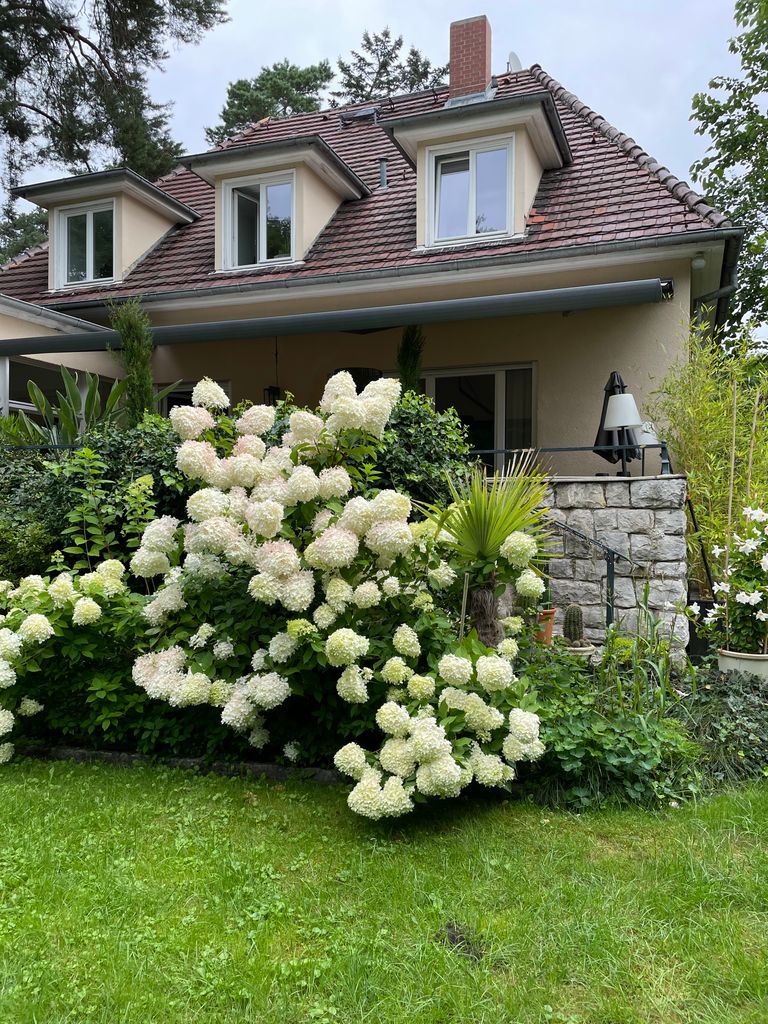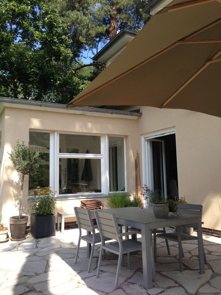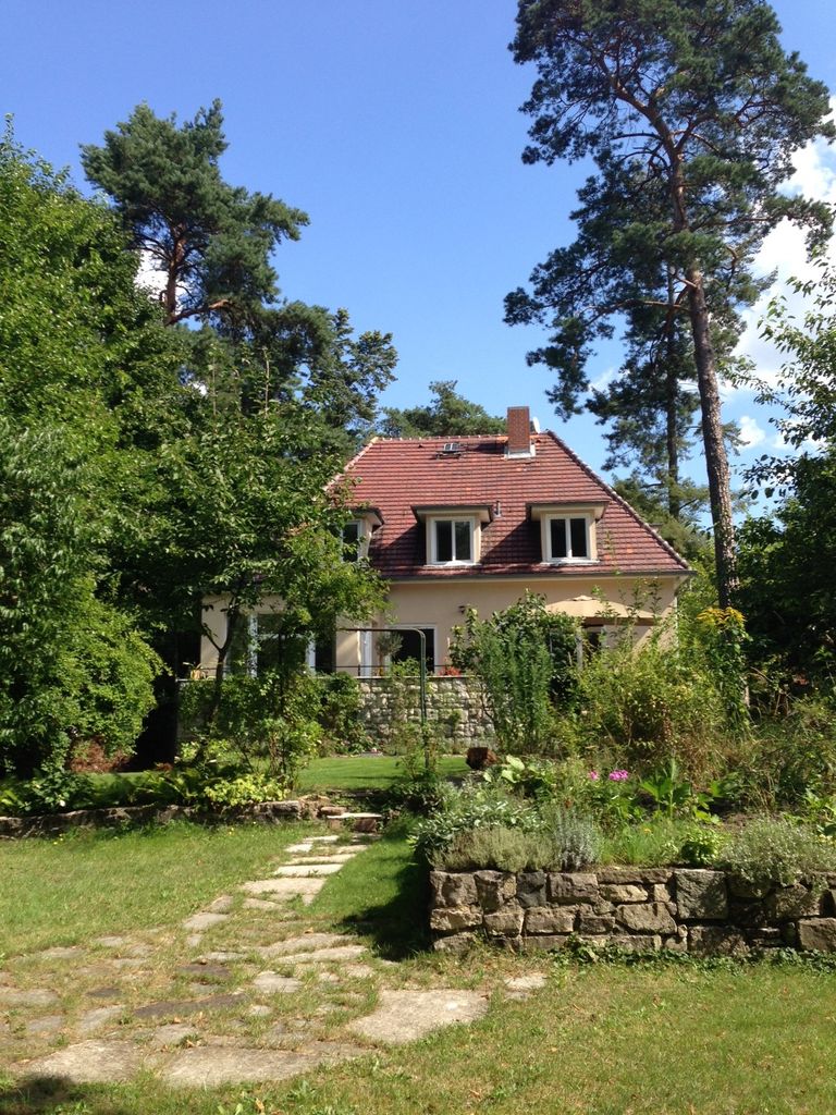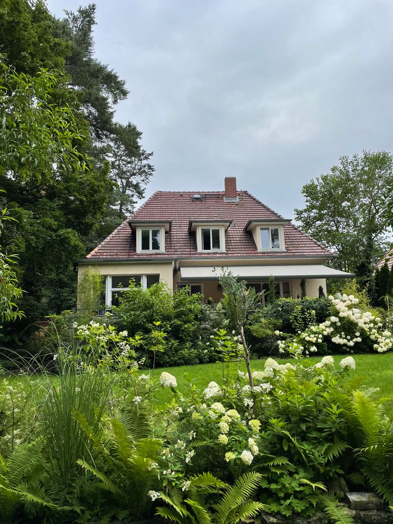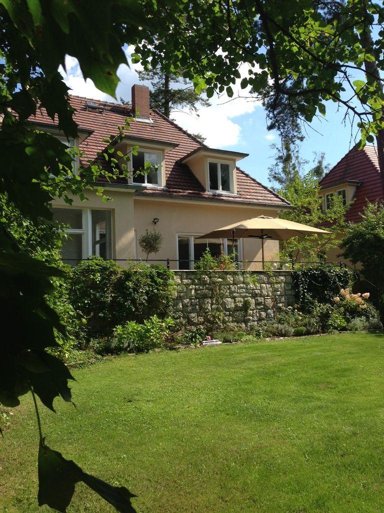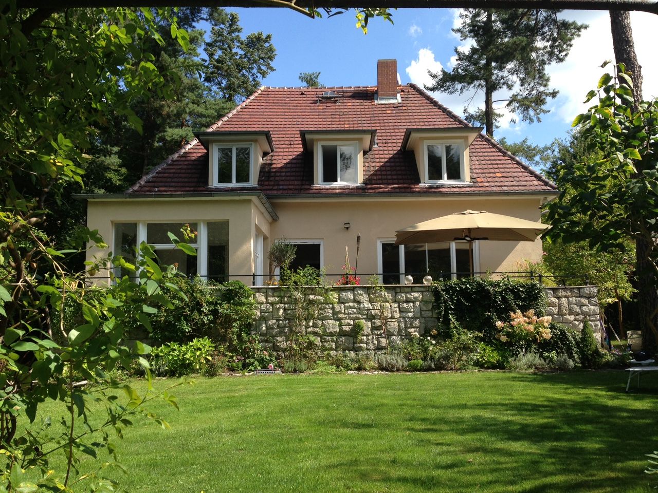 Haus / Villa in zentraler Lage, 6km nach Potsdam in Wilhemshorst (Michendorf) 250qm Wohnfläche 1300qm Garten Gesamte Haus verfügt über viele original erhaltene Elemente aus den 30er Jahren. Komplett renoviert, Baujahr 1936 Vollunterkellert mit Tiefgarage, Sauna EG: - Küche mit modernem Küchenblock, Einbauschränke Original 30er Jahre - Wohnzimmer mit eingebauten Wandregalen, original, altes Parkett Fischgrät) - Eßzimmer mit eingebauten Wandvitrinen, Parkett Fischgrät, original - angrenzender Wintergarten, alles original, mit Blick in der Garten/Terrasse, Solnhofer Platten - Terrasse ca. 1m hoch gebaut, 45qm, Blick in den Garten Garten ca 1300qm. Treppenhaus mit Original-Treppe & Handlauf 30er Jahre OG: - Schlafzimmer mit angrenzendem Bad, neues Parkett, neues Bad, Sichtbeton - Ankleidezimmer - Arbeitszimmer/Aufenthaltsraum - Gästezimmer - weitere Badezimmer mit Badewanne