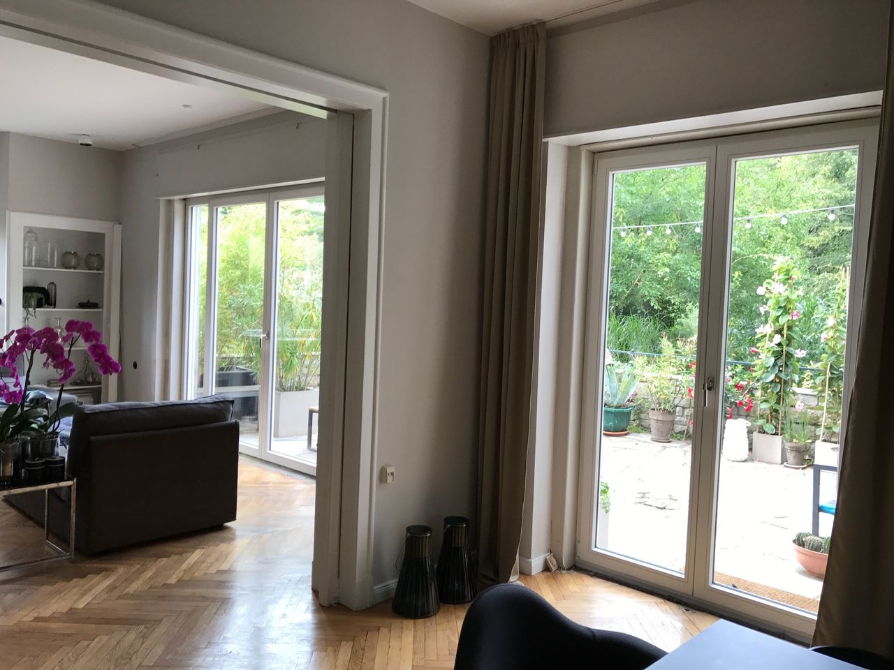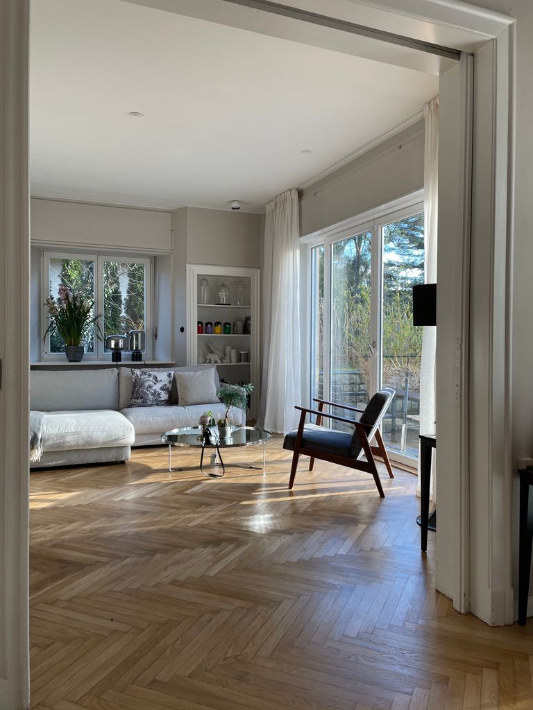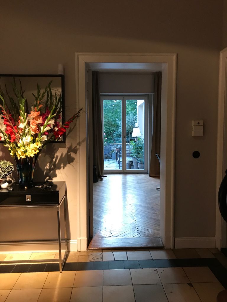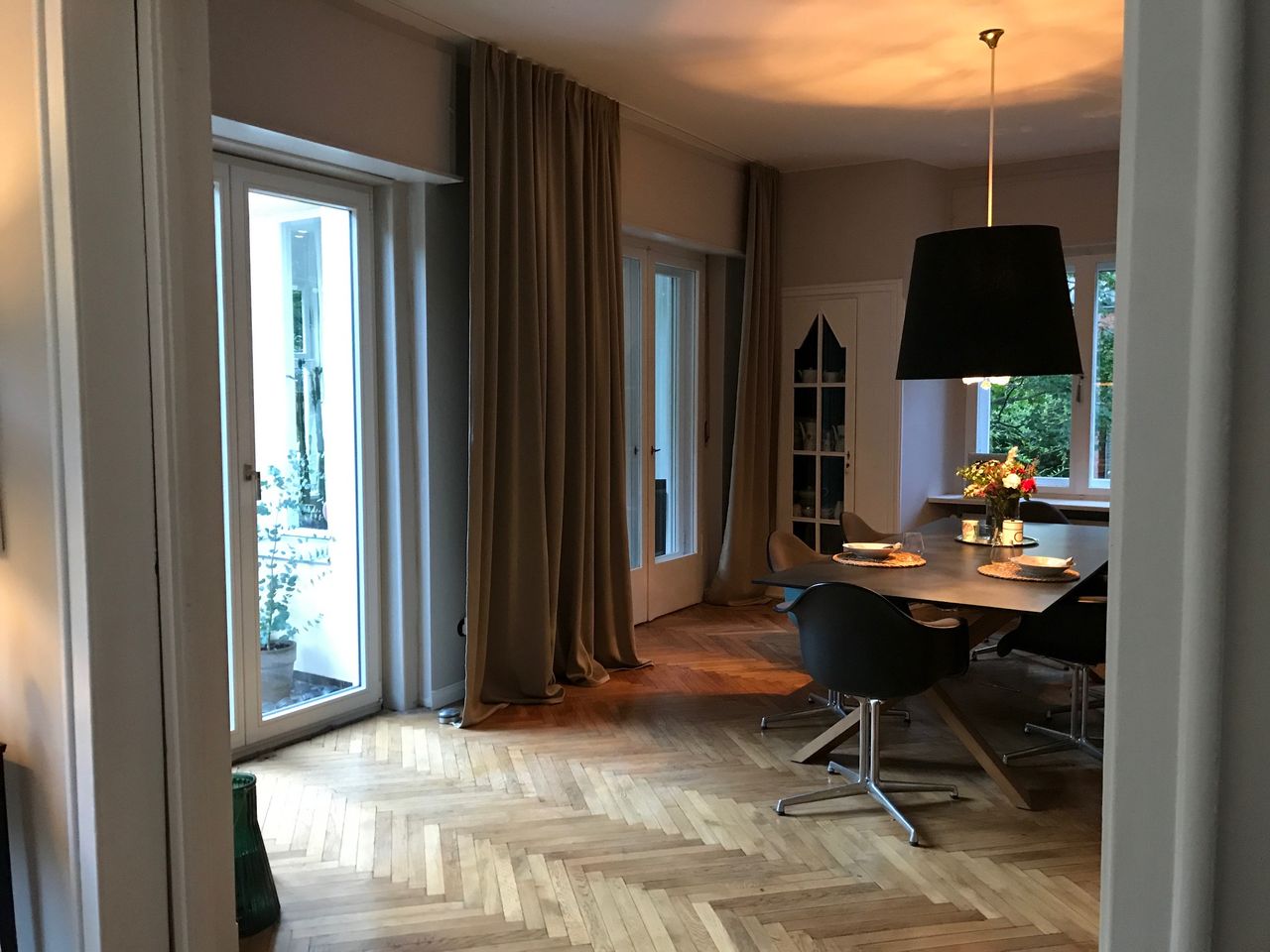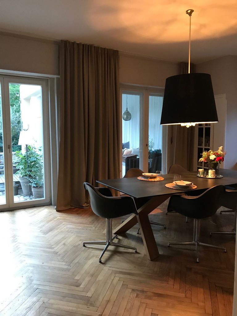 Haus / Villa in zentraler Lage, 6km nach Potsdam in Wilhemshorst (Michendorf) 250qm Wohnfläche 1300qm Garten Gesamte Haus verfügt über viele original erhaltene Elemente aus den 30er Jahren. Komplett renoviert, Baujahr 1936 Vollunterkellert mit Tiefgarage, Sauna EG: - Küche mit modernem Küchenblock, Einbauschränke Original 30er Jahre - Wohnzimmer mit eingebauten Wandregalen, original, altes Parkett Fischgrät) - Eßzimmer mit eingebauten Wandvitrinen, Parkett Fischgrät, original - angrenzender Wintergarten, alles original, mit Blick in der Garten/Terrasse, Solnhofer Platten - Terrasse ca. 1m hoch gebaut, 45qm, Blick in den Garten Garten ca 1300qm. Treppenhaus mit Original-Treppe & Handlauf 30er Jahre OG: - Schlafzimmer mit angrenzendem Bad, neues Parkett, neues Bad, Sichtbeton - Ankleidezimmer - Arbeitszimmer/Aufenthaltsraum - Gästezimmer - weitere Badezimmer mit Badewanne