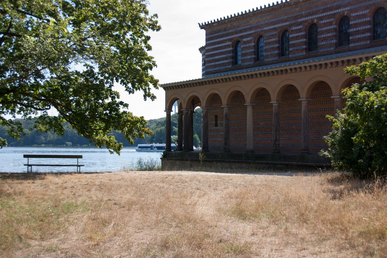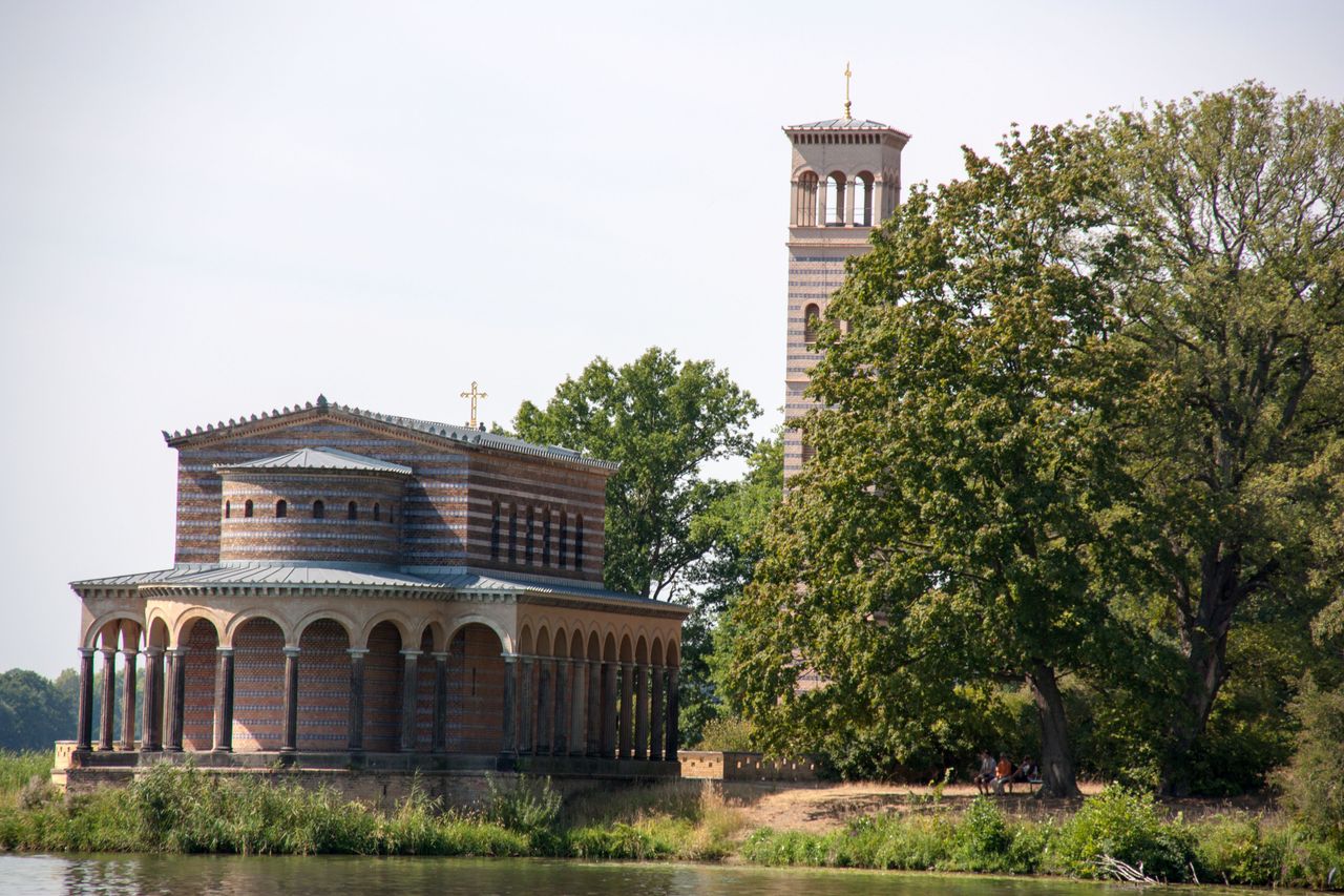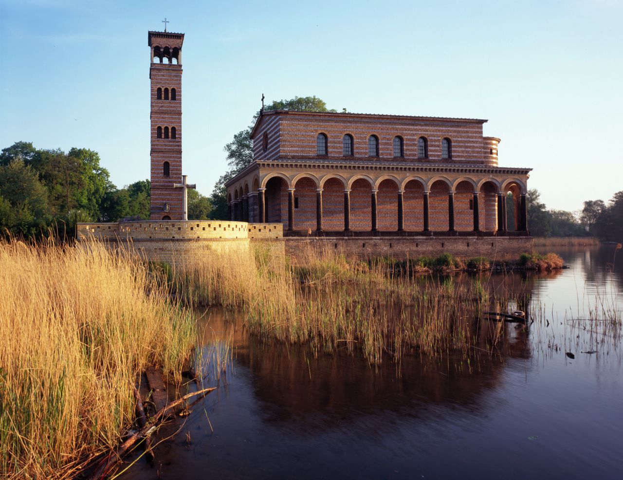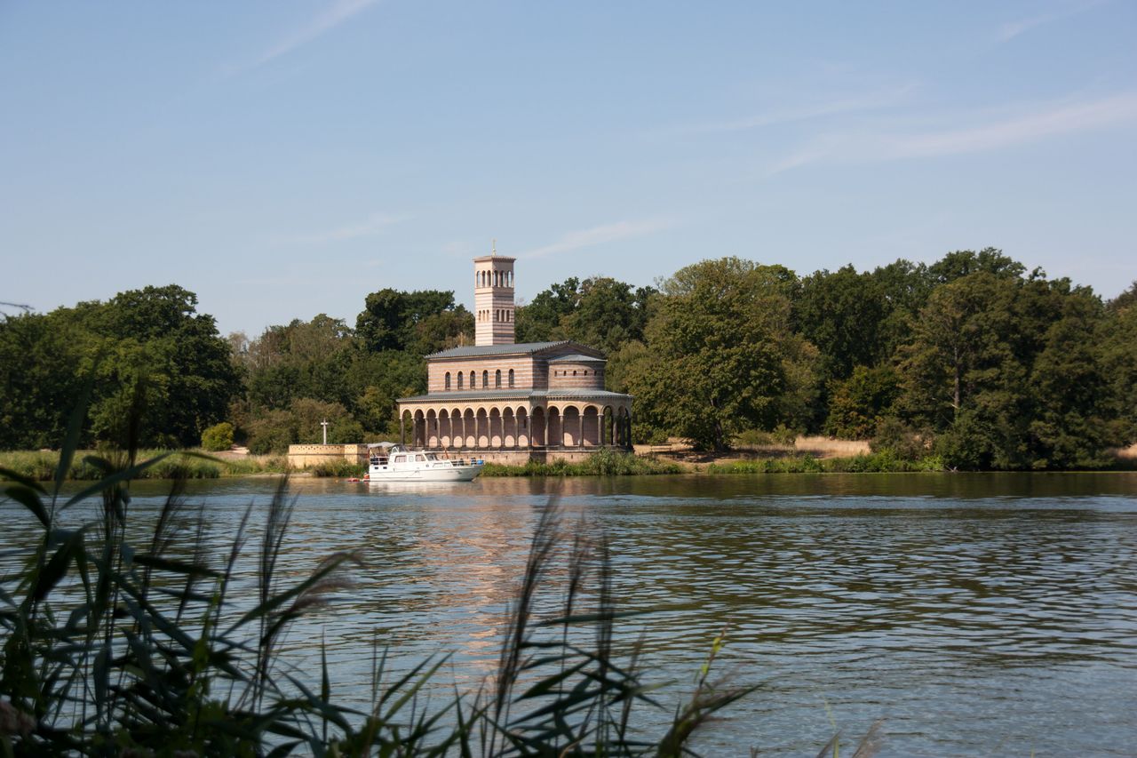 Die Heilandskirche liegt direkt an einer Landzunge, welche in einen Fluss ragt.