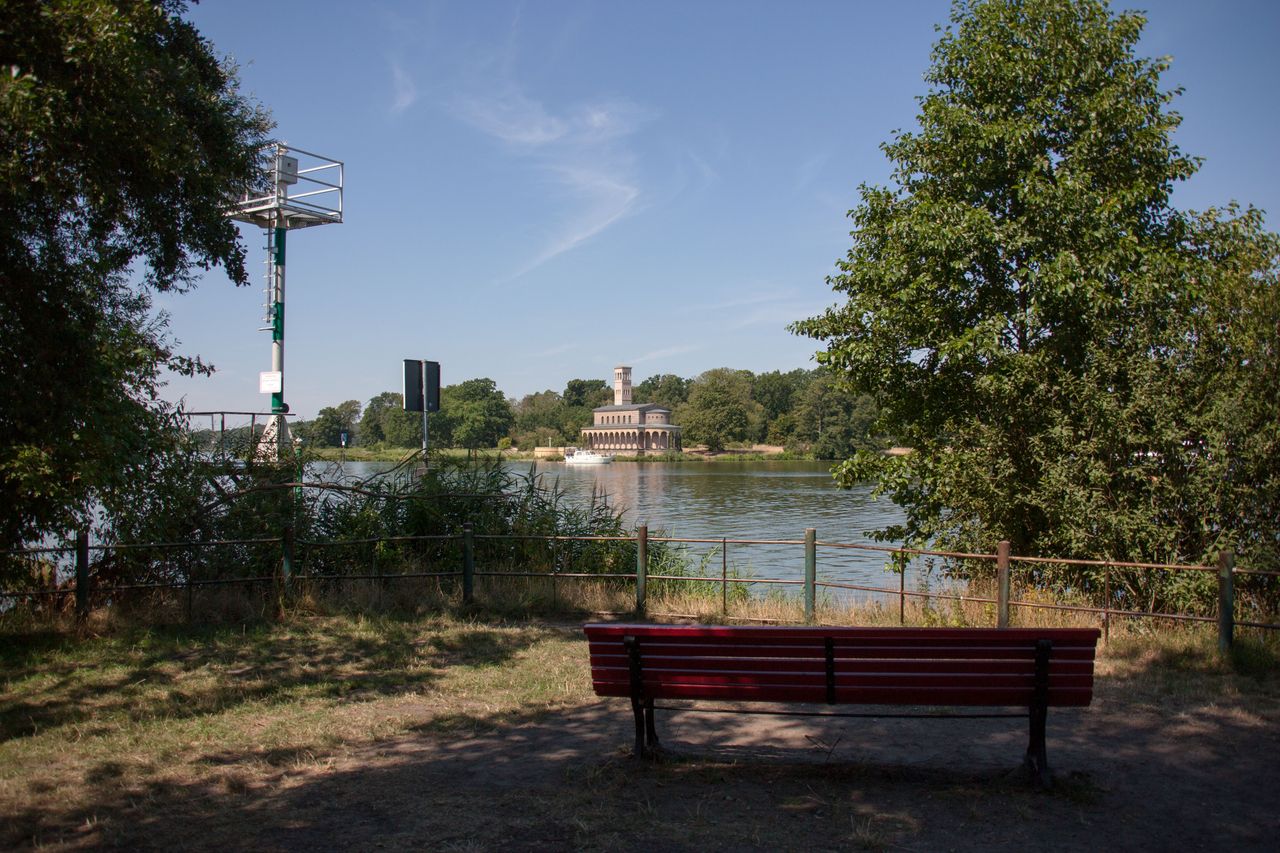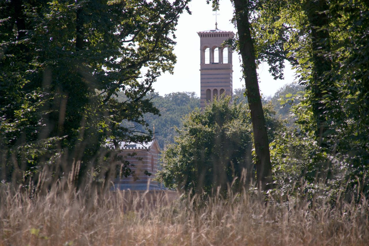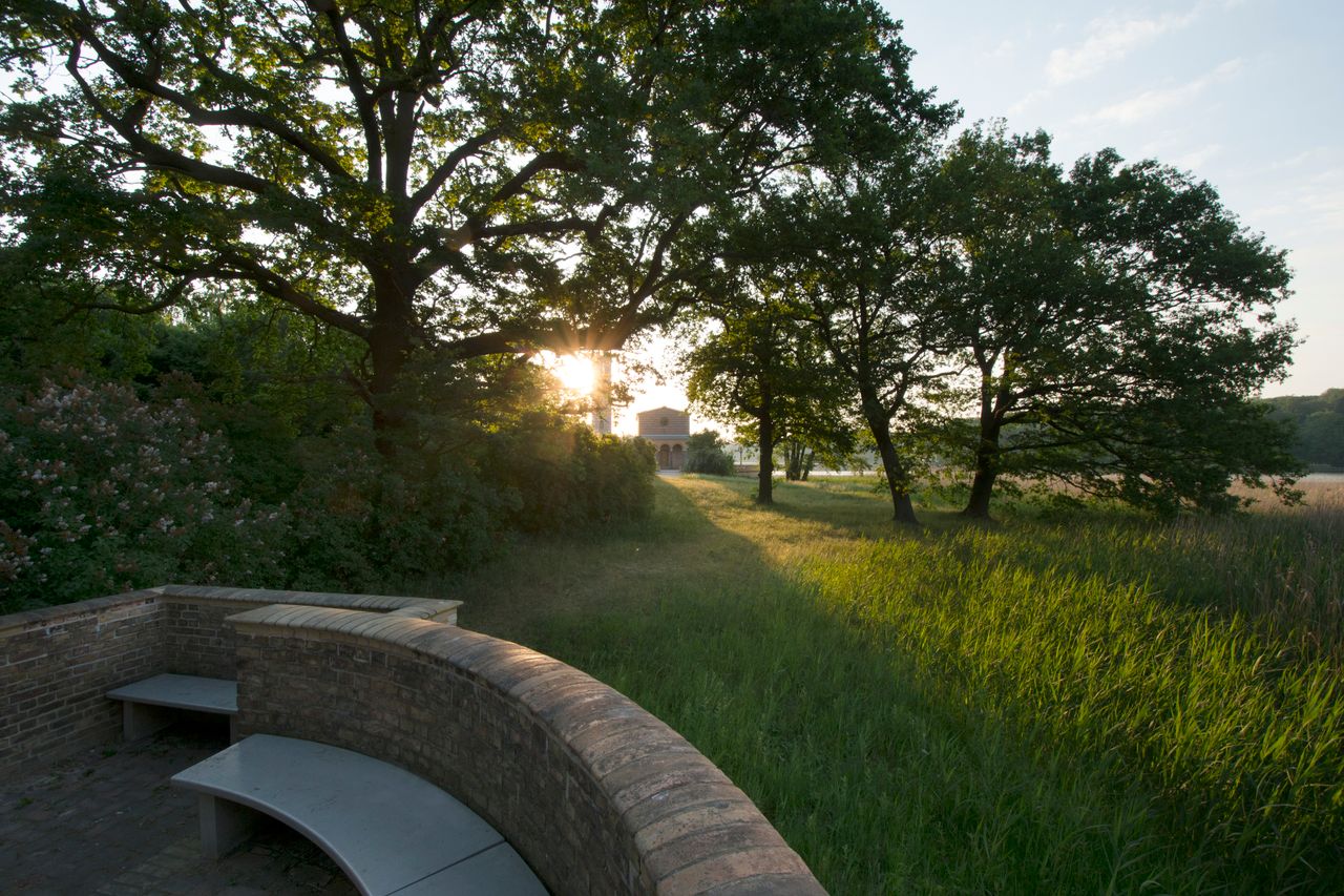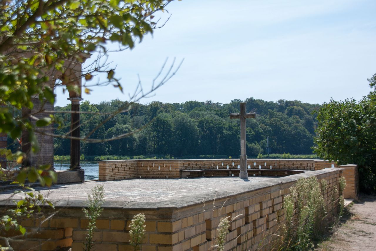 Die Heilandskirche liegt direkt an einer Landzunge, welche in einen Fluss ragt.