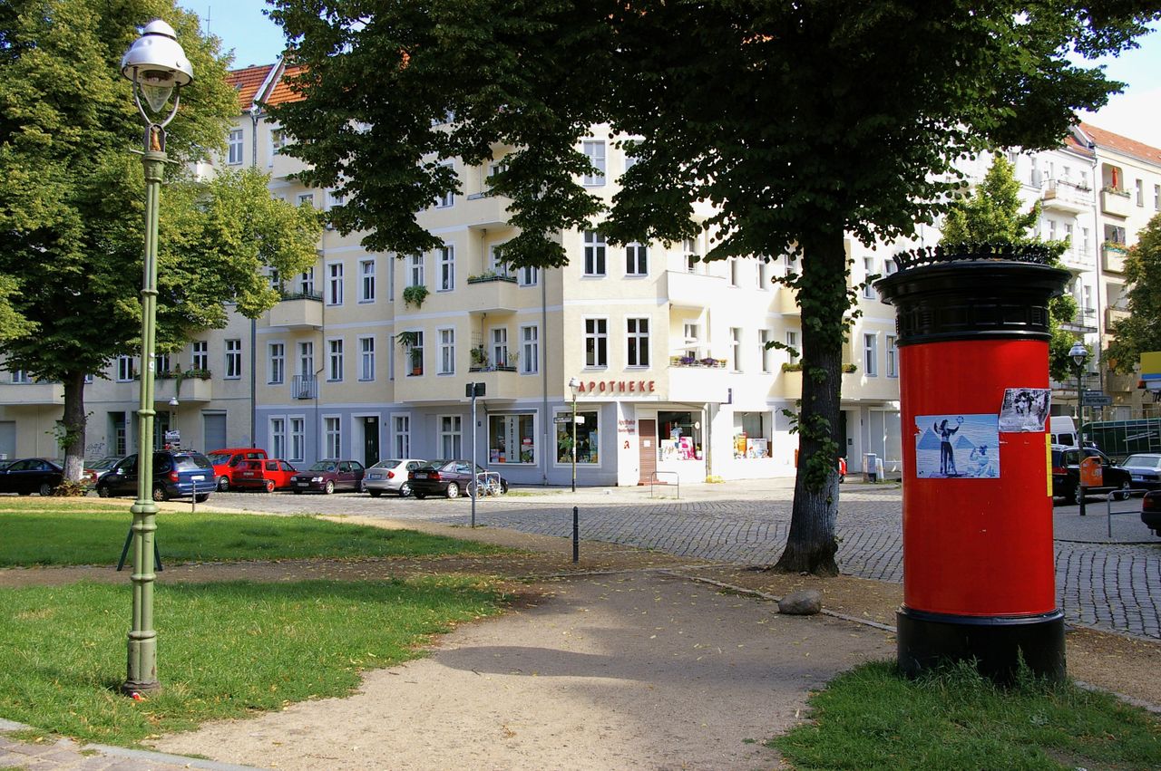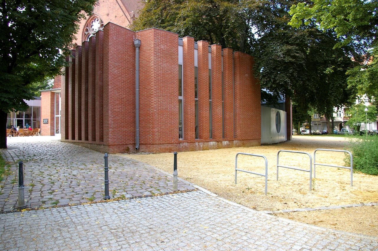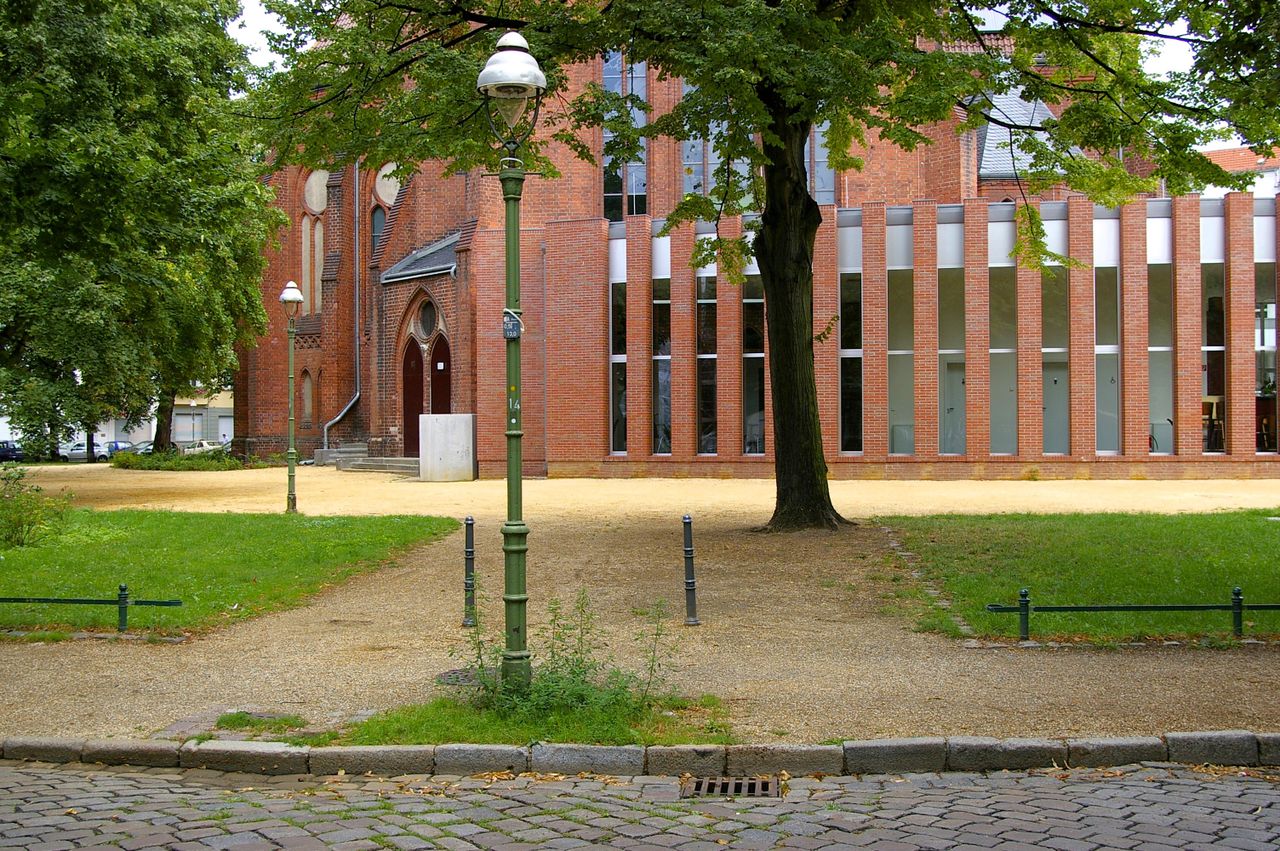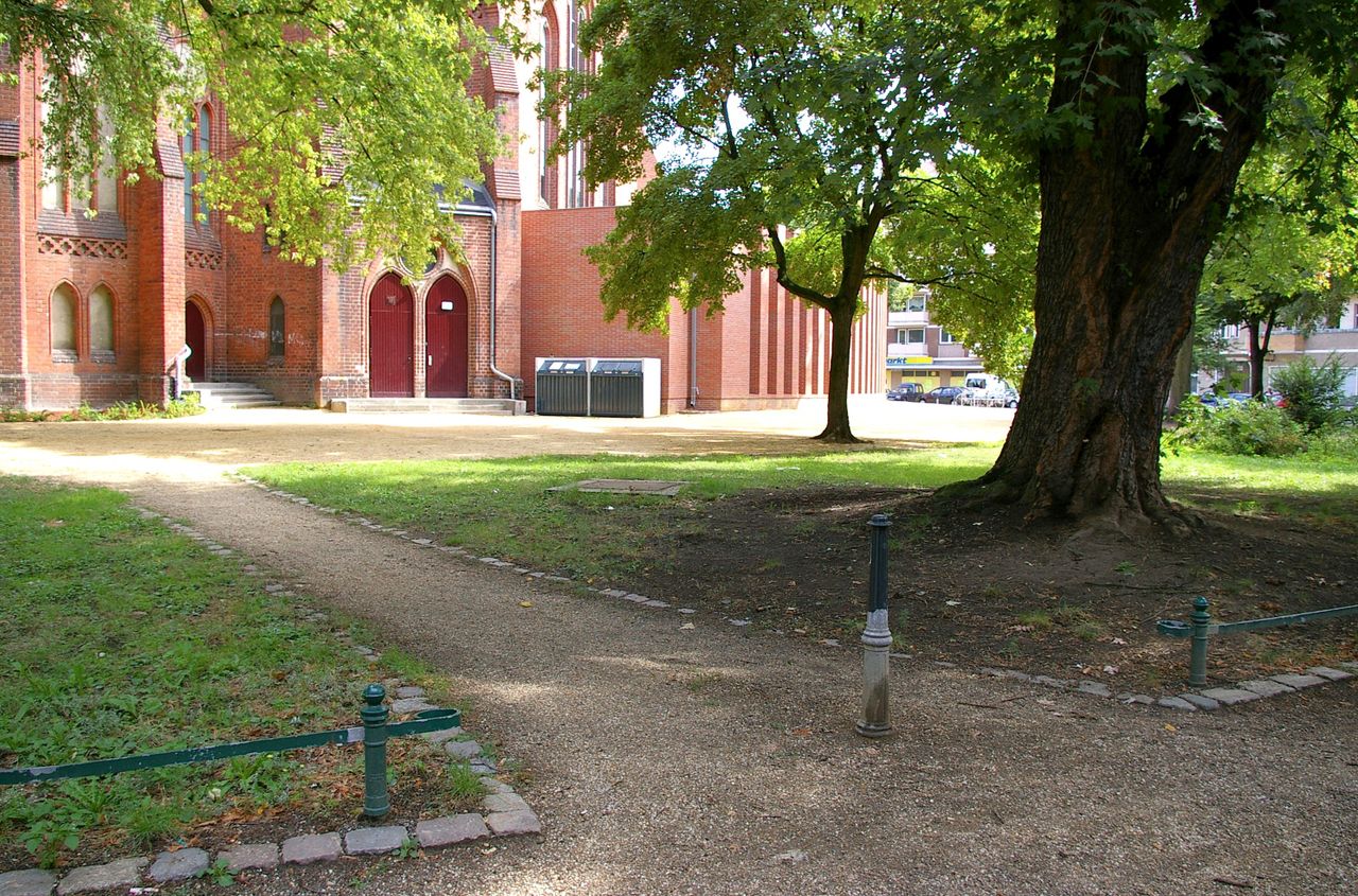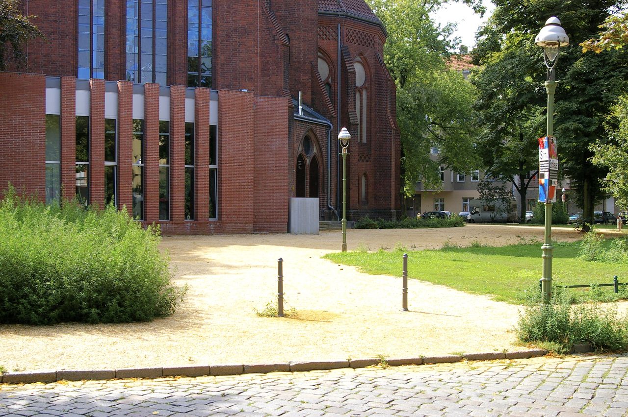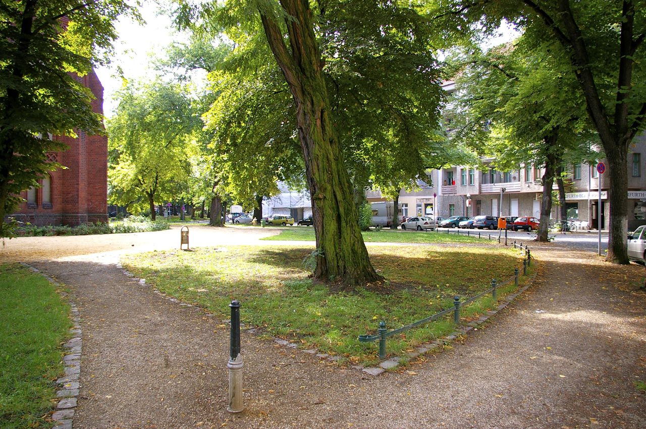 ruhiger Platz mit Kirche aus der Gründerzeit, kleine Grünfläche, Pflastersteine