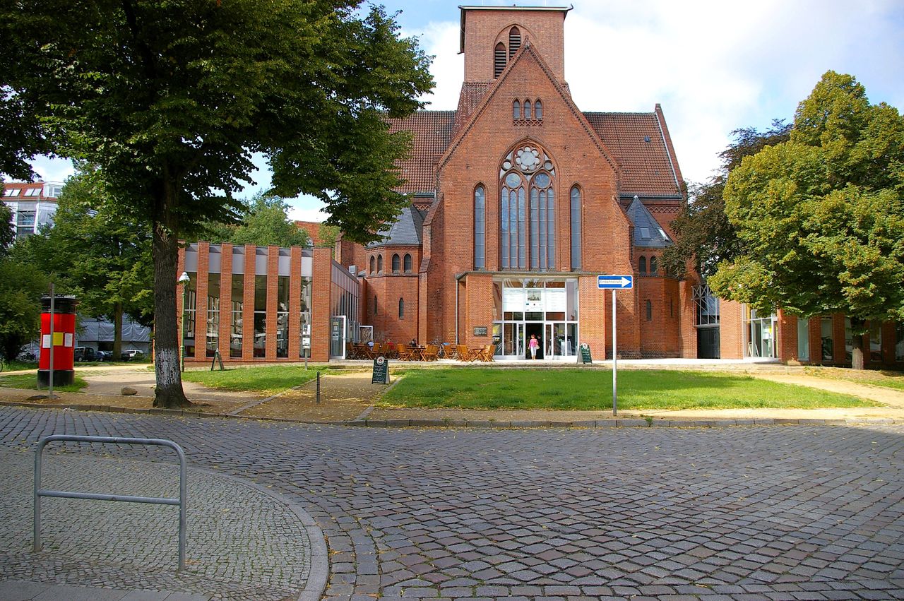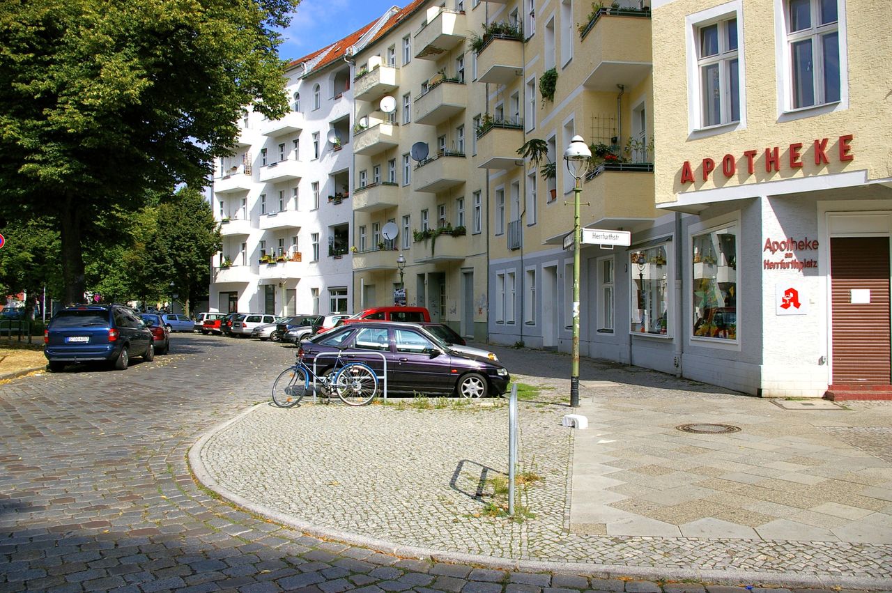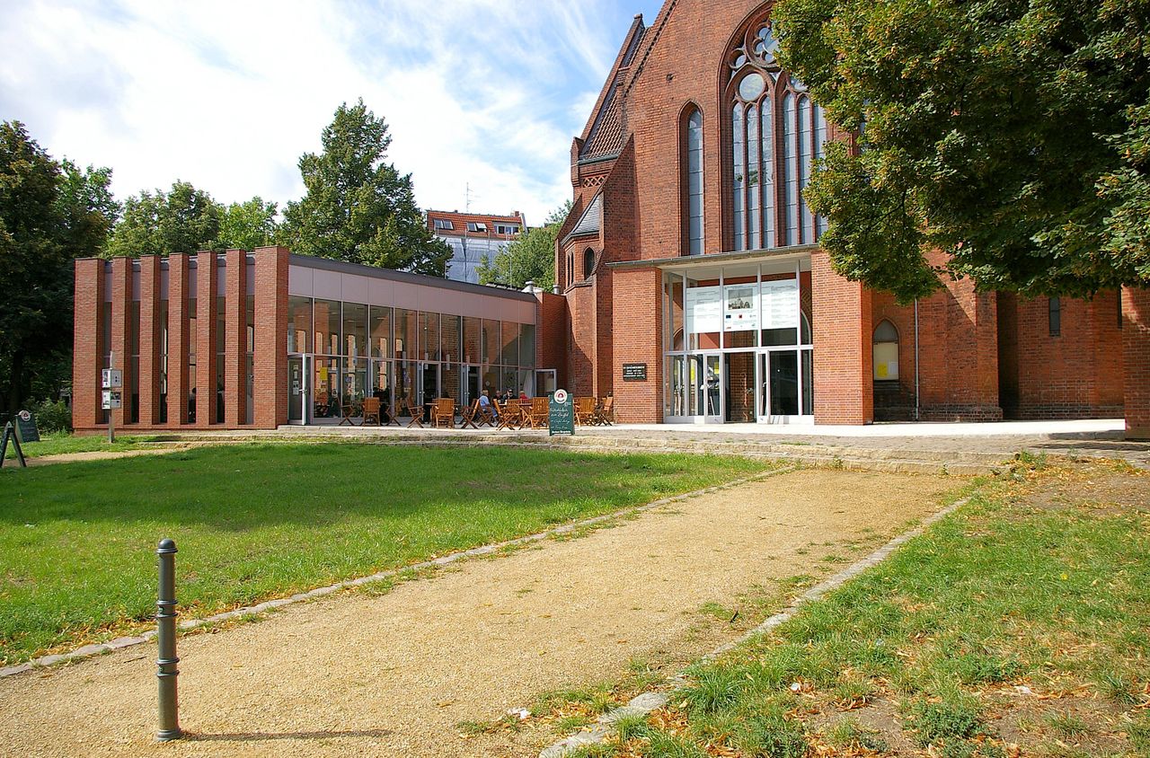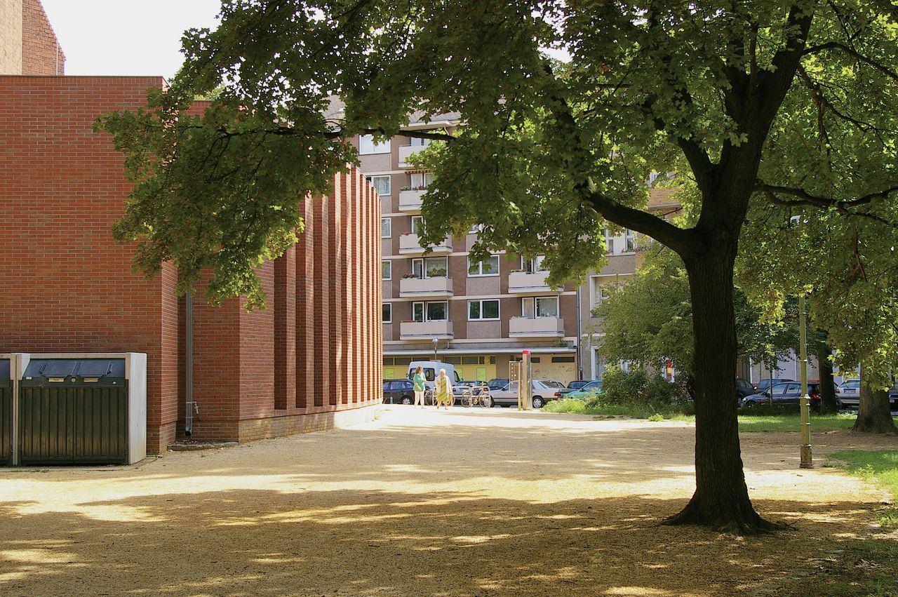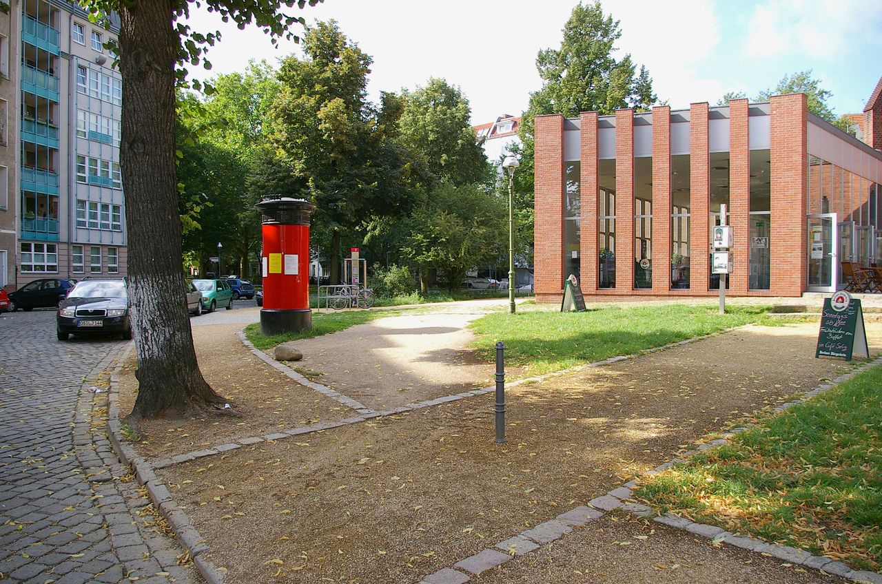 ruhiger Platz mit Kirche aus der Gründerzeit, kleine Grünfläche, Pflastersteine