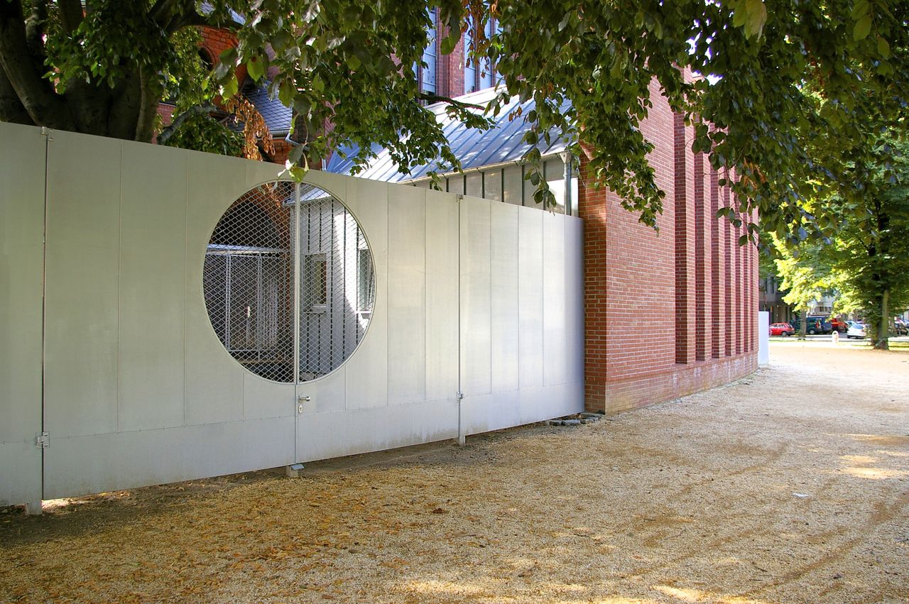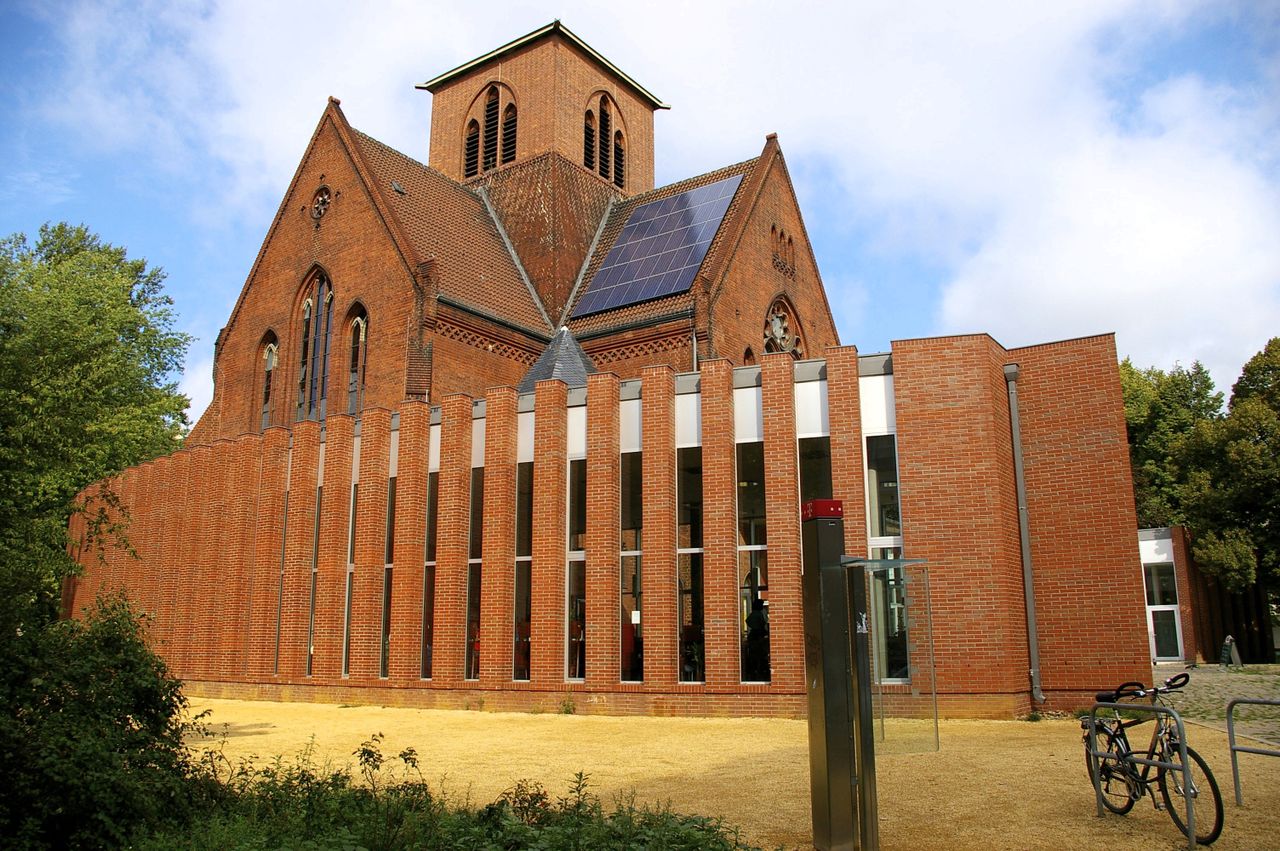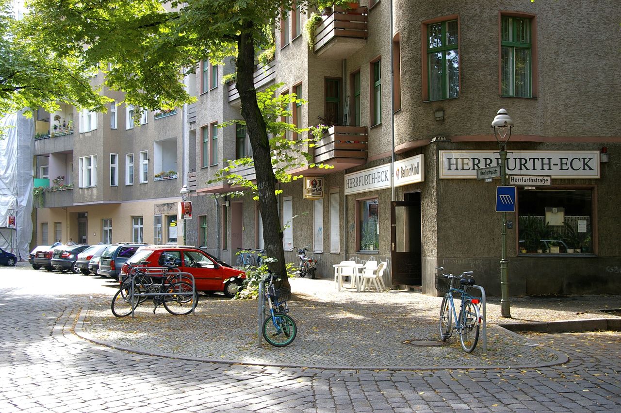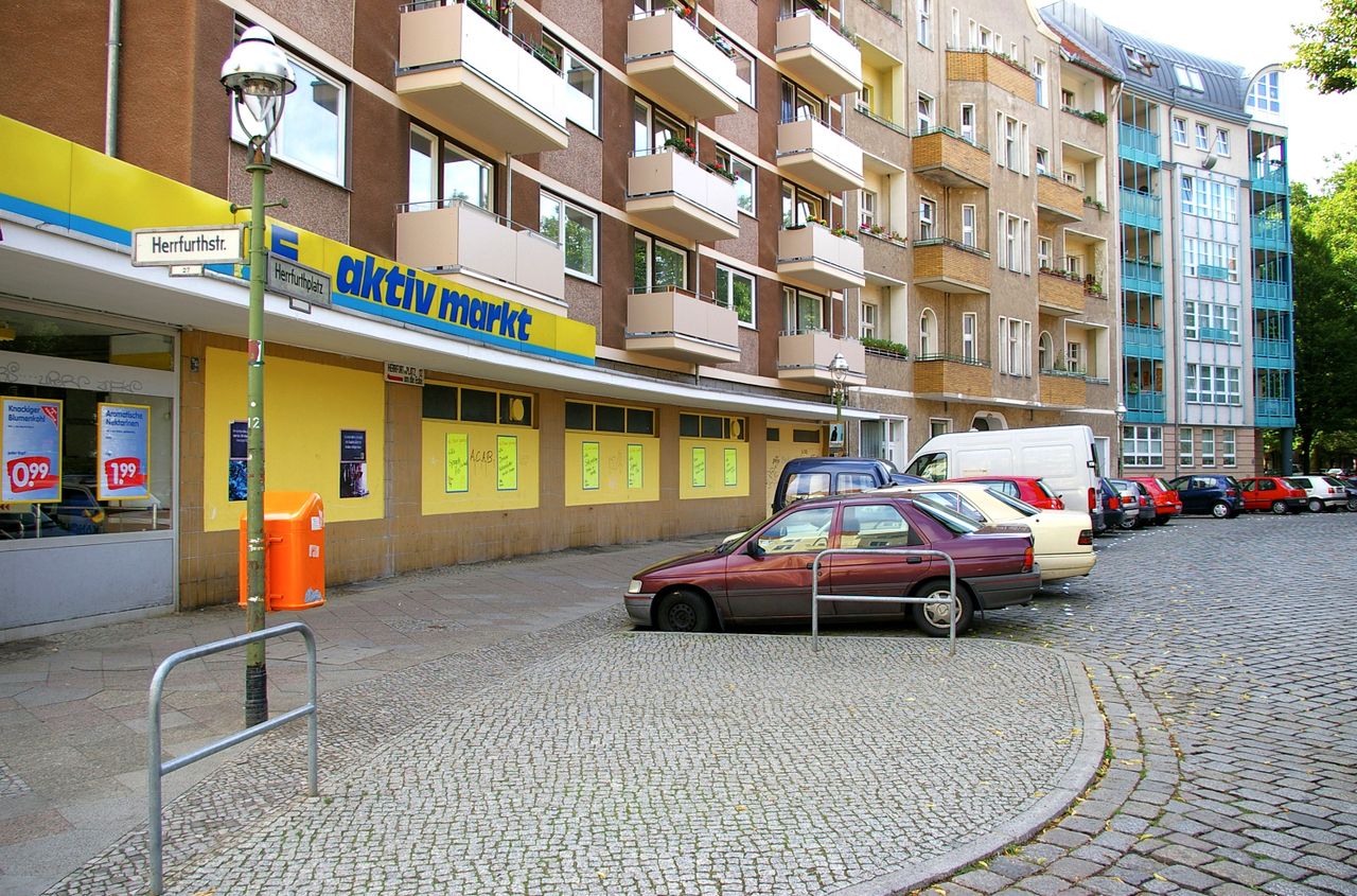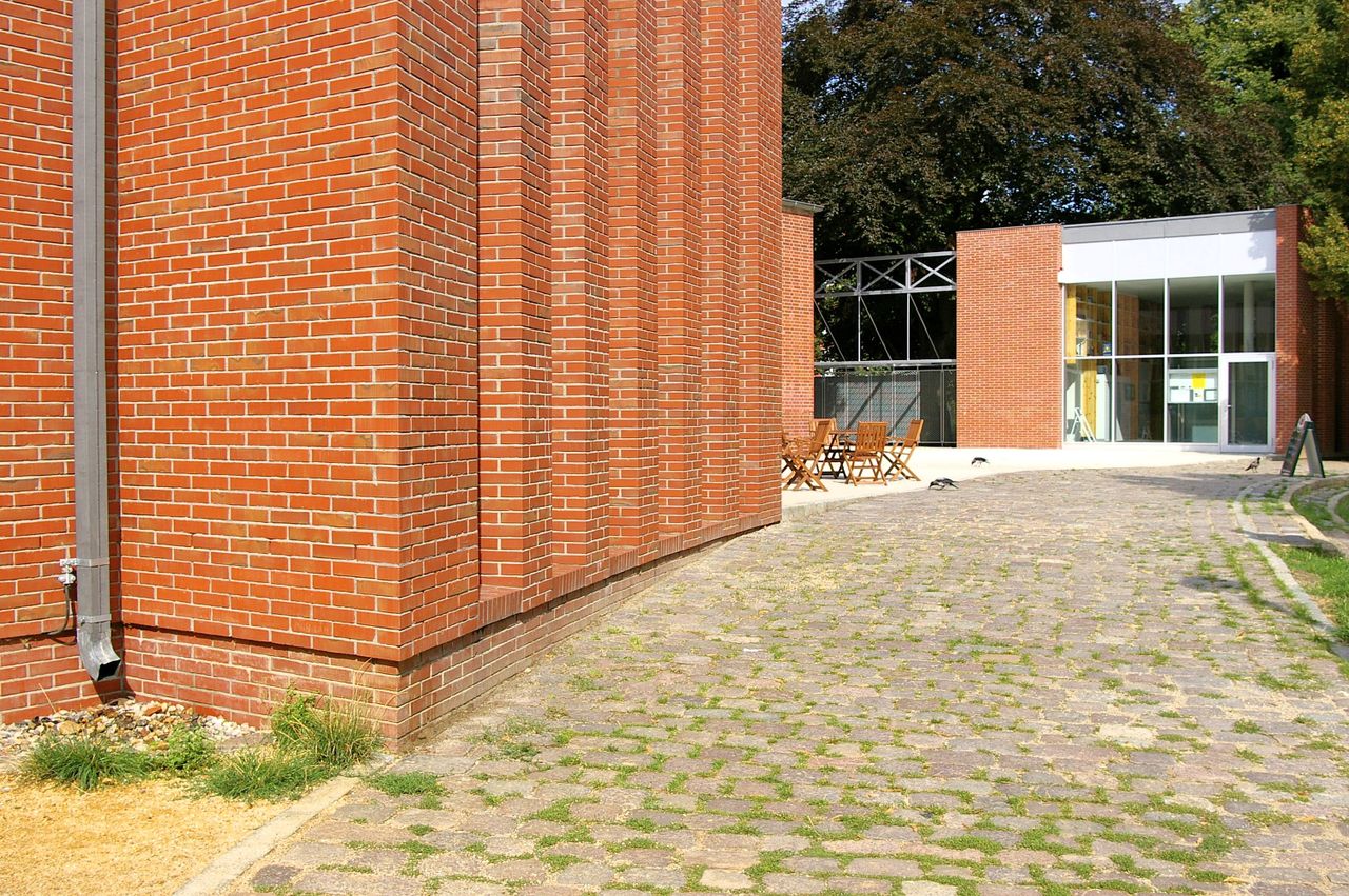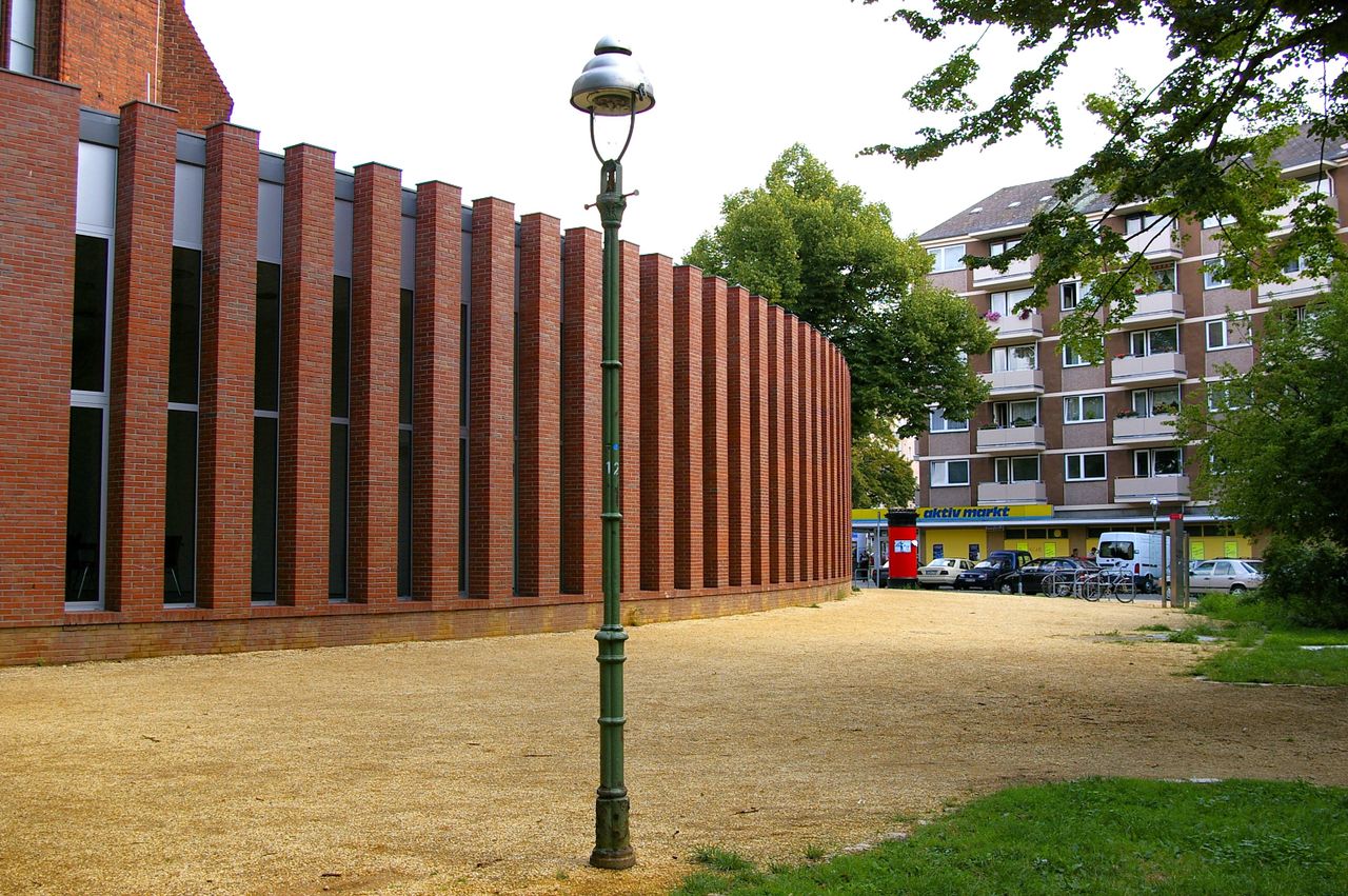 ruhiger Platz mit Kirche aus der Gründerzeit, kleine Grünfläche, Pflastersteine