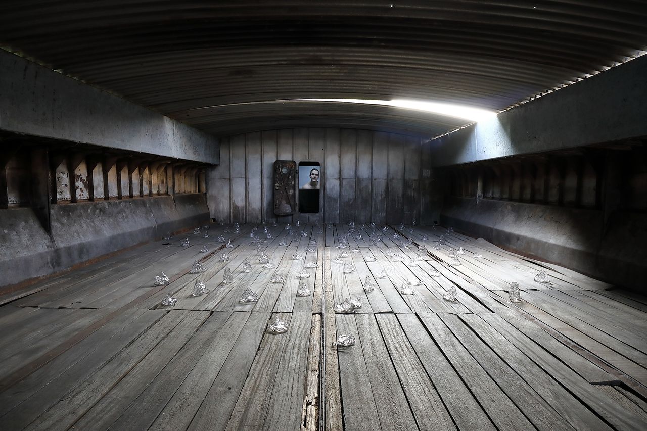 Built in 1910 in Fürstenberg an der Oder, the barge was initially operating under the name Ida and used for transporting coal to Charlottenburg. After the Second World War, the 58-meter long cargo ship was renamed Heimatland, meaning “homeland”. Until the 90s, the ship was moving other boats, sand and chippings. It served for a cultural purpose for the first time in 2002, when German sculptor Christiane Möbus chose it for her project. In March 2018, MS Heimatland became the main exhibition space and artist residency of Hošek Contemporary.