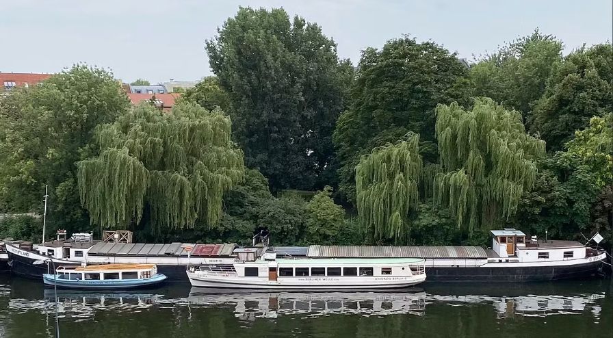 Our old barge MS Heimatland is located on the river Spree, right in the centre of Berlin (DE), yet in a slightly "secret" area next to a lush park, at the historical harbour of Mitte-Berlin.