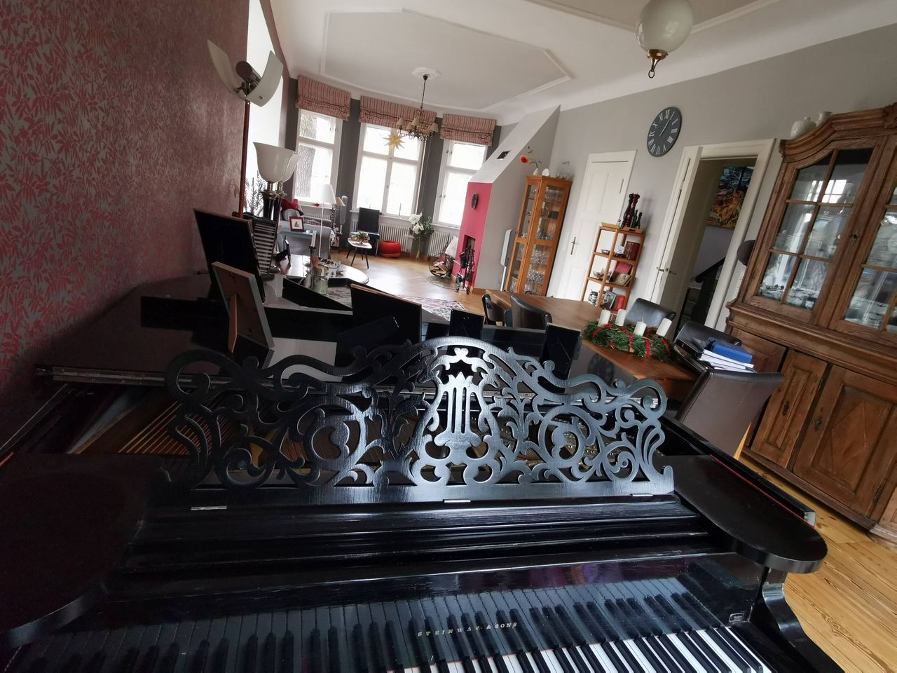 Im EG stehen ein ca. 50 Quadratmeter großes Wohnzimmer, eine Küche und ein großes Büro zur Verfügung. Das Wohnzimmer hat einen Steinway Flügel, eine lichtdurchflutete Veranda und einen gemütlichen Erker.