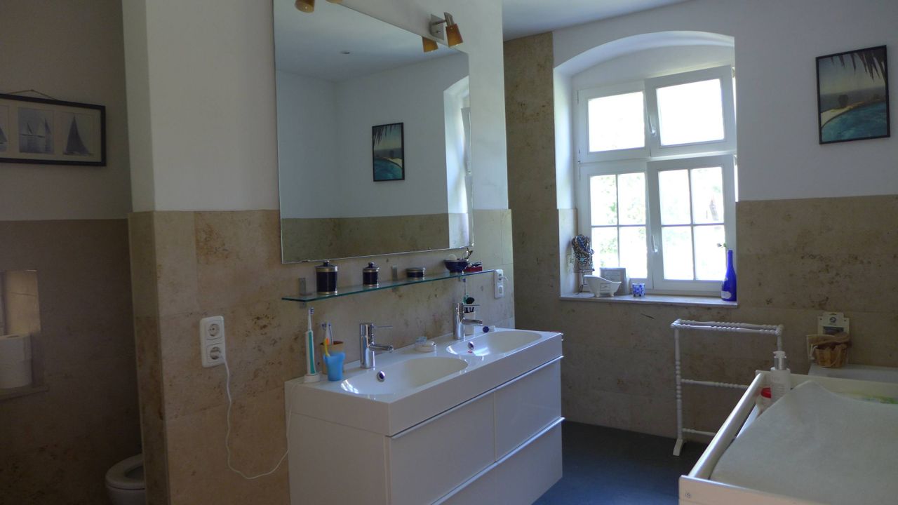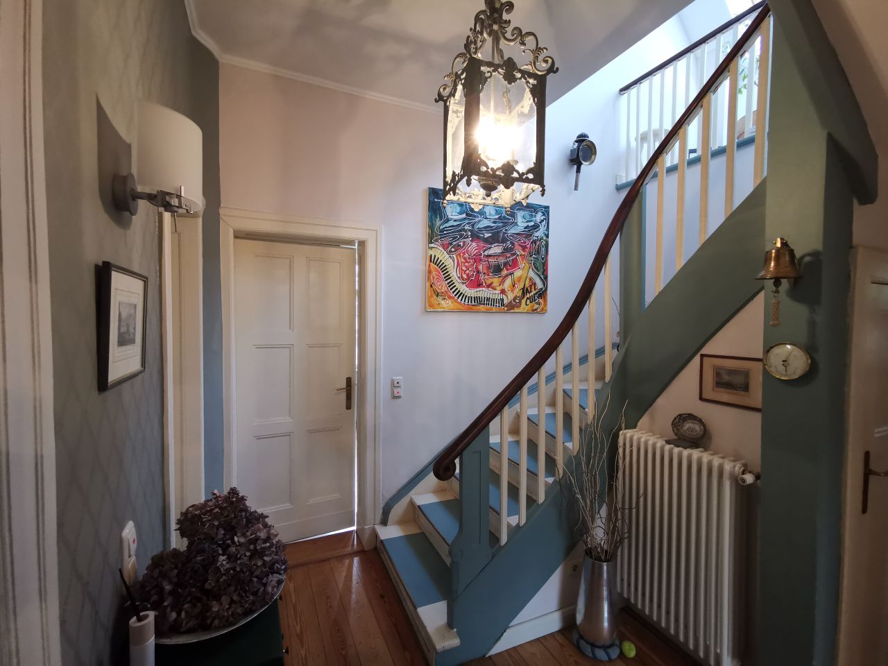 Zusätzlich gibt es ein modern ausgebautes Dachgeschoss mit sichtbaren Holzbalken und Schlossparkett.