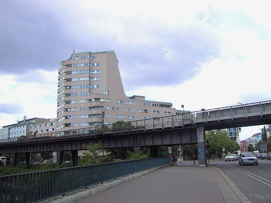 Blick von der Möckernbrücke auf Hochhaus am Halleschen Ufer und im Vordergrund die Hochbahn der U-Bahnlinie 1.