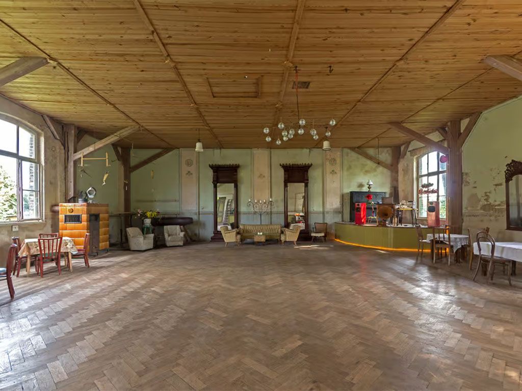 Die spürbare Aura vergangener Zeiten, das sehr gut erhaltene Eichen-Parkett, die beiden wahrscheinlich von Carinhall stammenden Spiegel, der ehemalige Tresen, sehr gute Akustik und schönes Licht machen diesen Ort einzigartig.