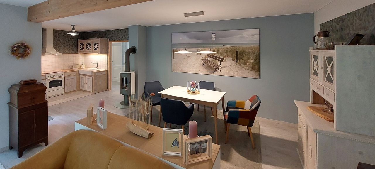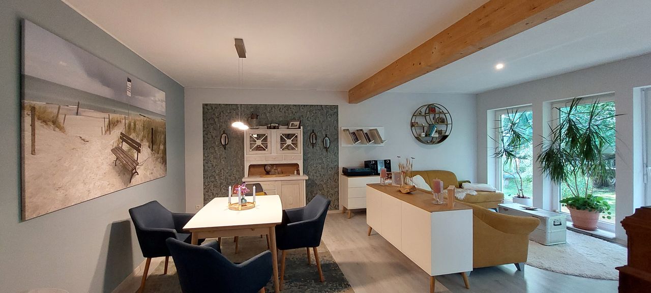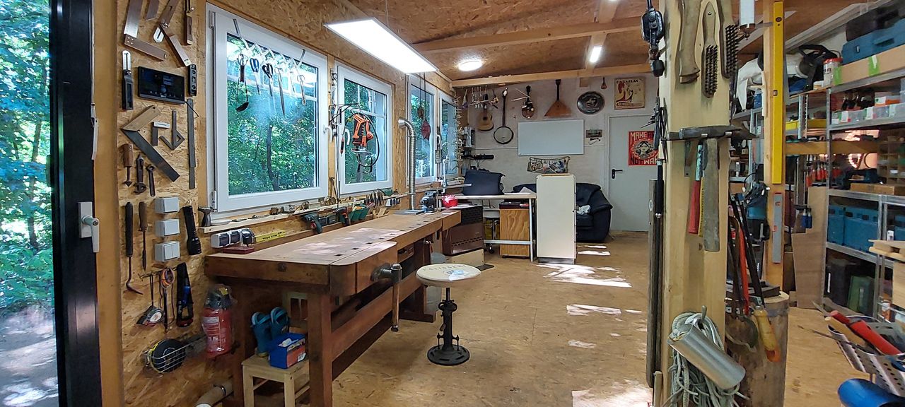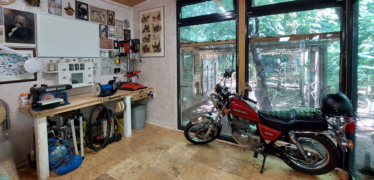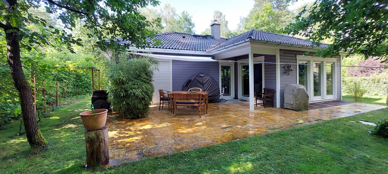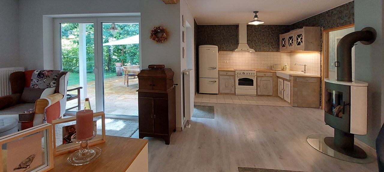 Das Holzhaus (Scanhaus) steht auf einem Waldgrundstück (2000 qm) und hat vorn eine Veranda und hinten eine Terrasse. Weiterhin sind eine große Werkstatt (50 qm), ein Hühnerstall und ein Wohnmobil (Weinsberg Cara Suite 700 ME) nutzbar.