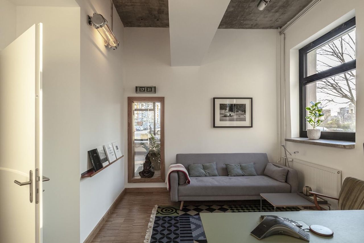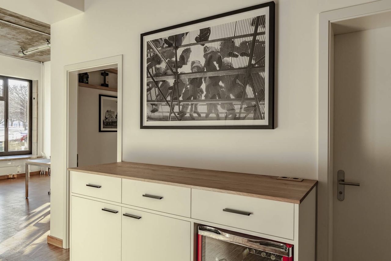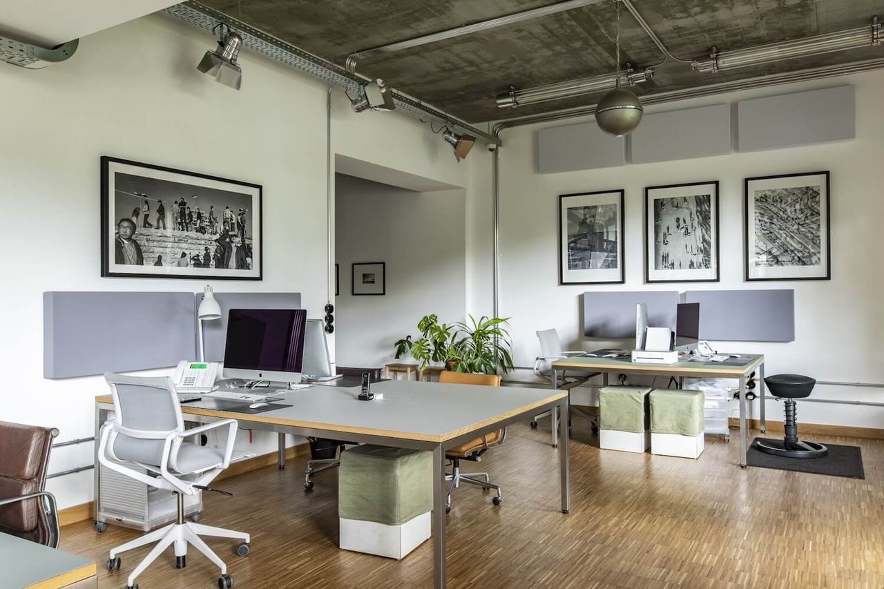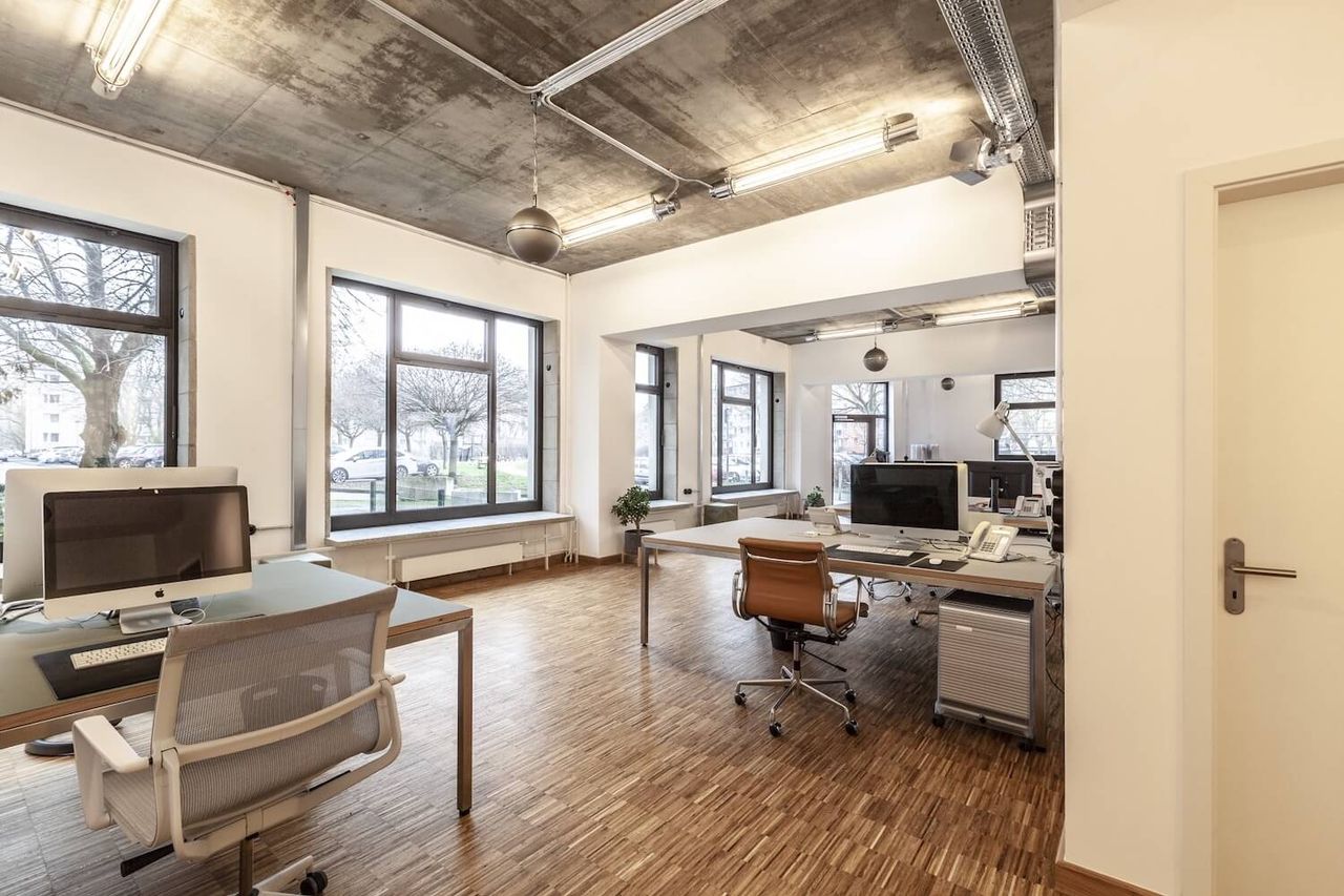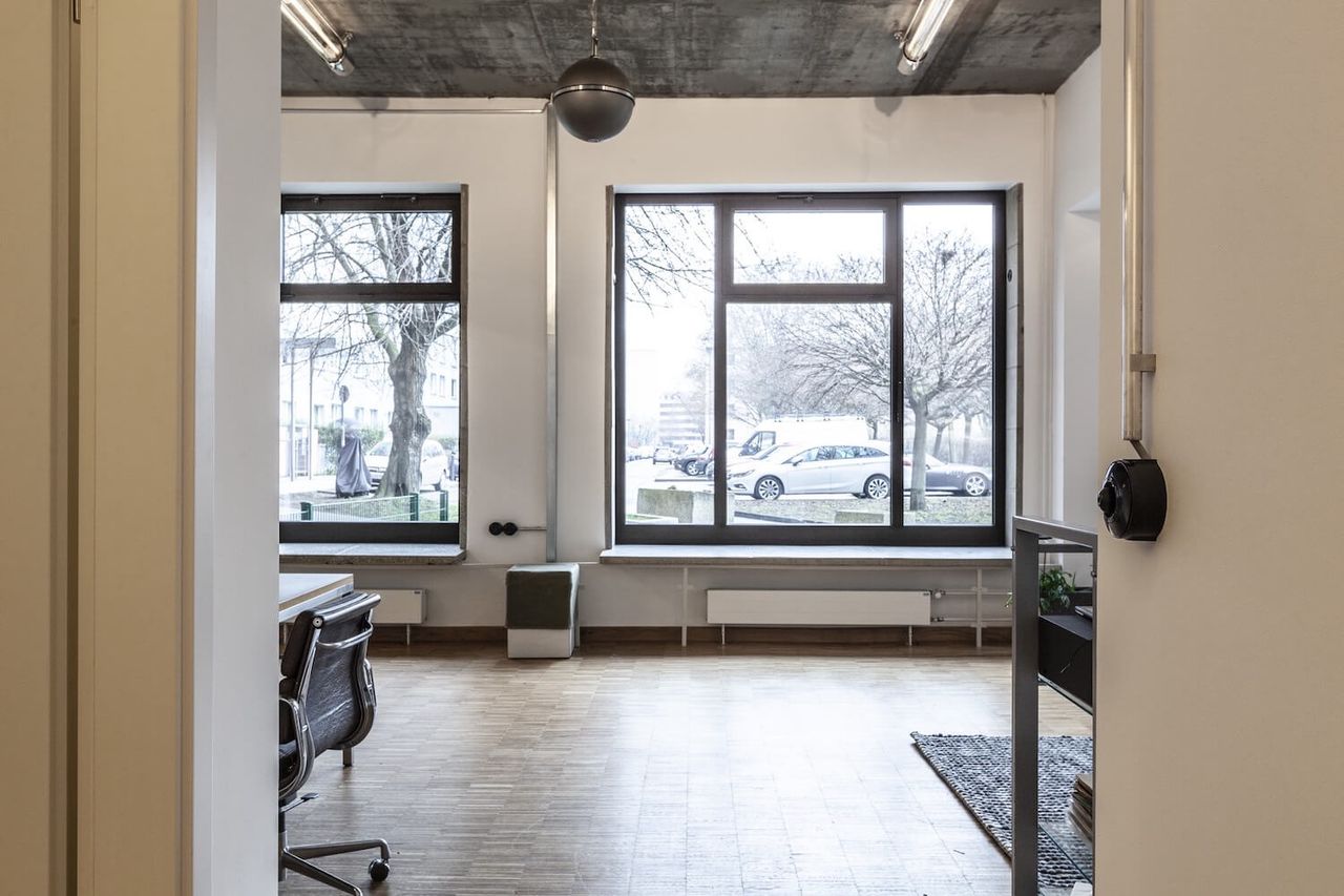 A brand new office with bauhaus and industrial charm. With 150 square meters, including one large and two small rooms, this spacious location offers plenty of backdrops for your productions. In front of the large windows there is space for lighting and cameras as well as height-adjustable bar table, fast DSL with 400 Mbit and sufficient Schuko connections.
