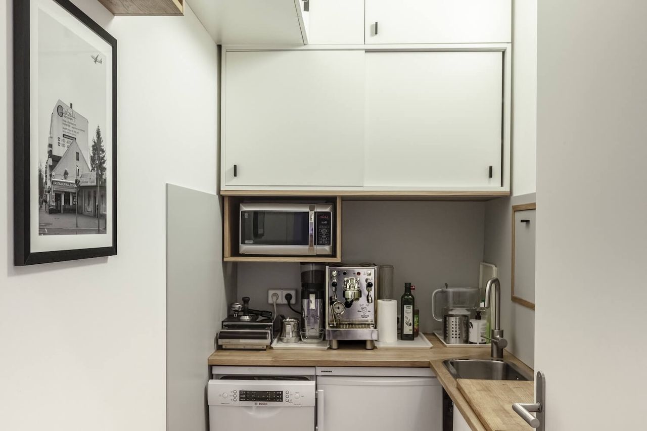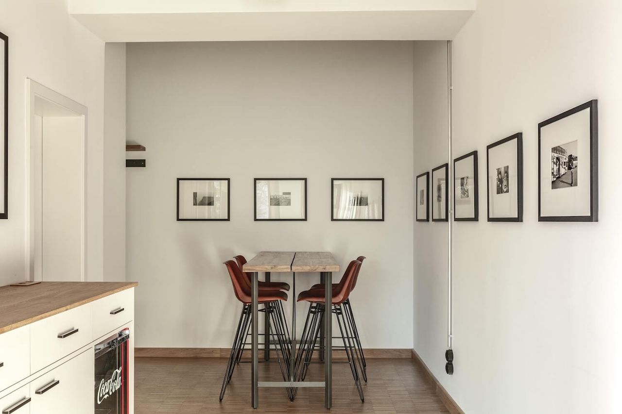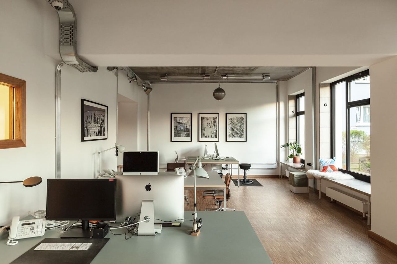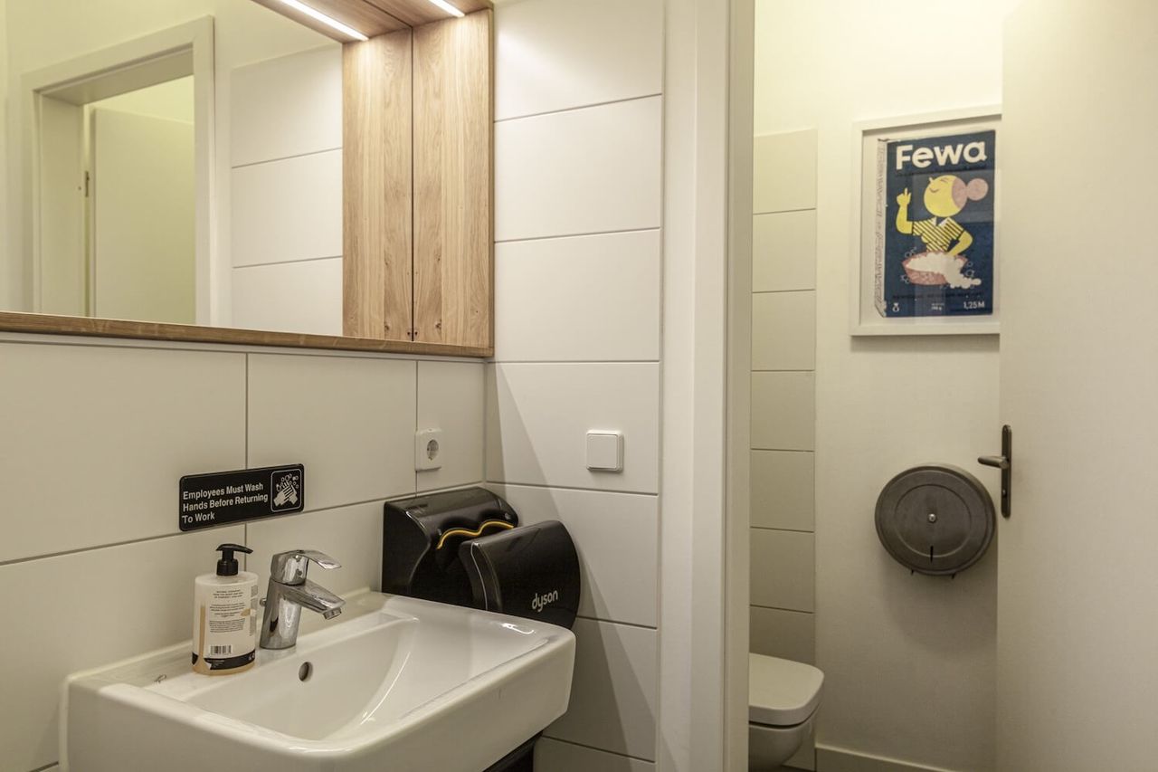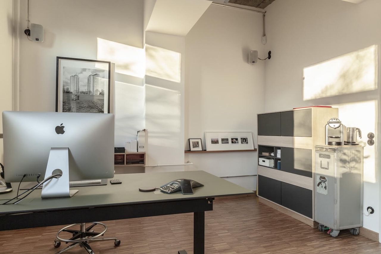A brand new office with bauhaus and industrial charm. With 150 square meters, including one large and two small rooms, this spacious location offers plenty of backdrops for your productions. In front of the large windows there is space for lighting and cameras as well as height-adjustable bar table, fast DSL with 400 Mbit and sufficient Schuko connections.