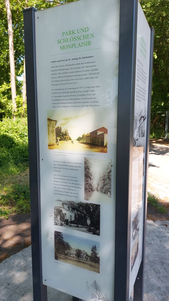 "Im Nordwesten der Stadt wurde um 1700 nach französischem Vorbild der Park Monplaisir angelegt. Markraf Philipp Wilhelm ließ ein erstes Gartenschlösschen und Wasseranlagen errichten. Die nachfolgenden Markgrafen setzten die Gestaltung des Parkes fort und ersetzten das Sommerschloss durch neue Bauten. Das jetzige massive Gebäude stammt aus den Jahren 1778–1780 und ist das dritte Schlösschen an dieser Stelle.