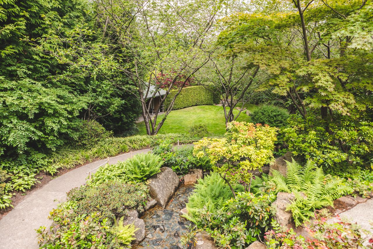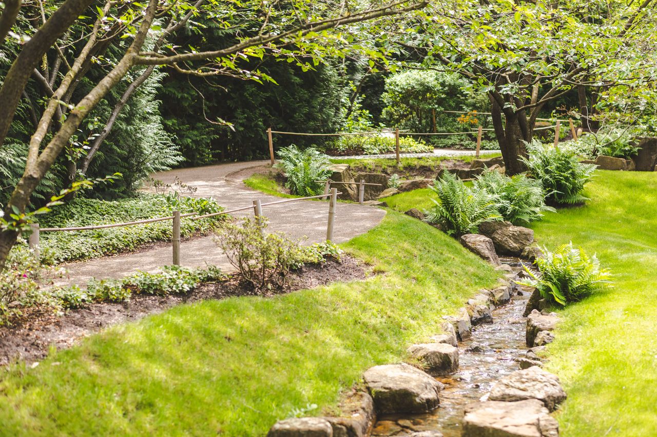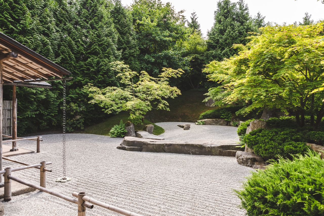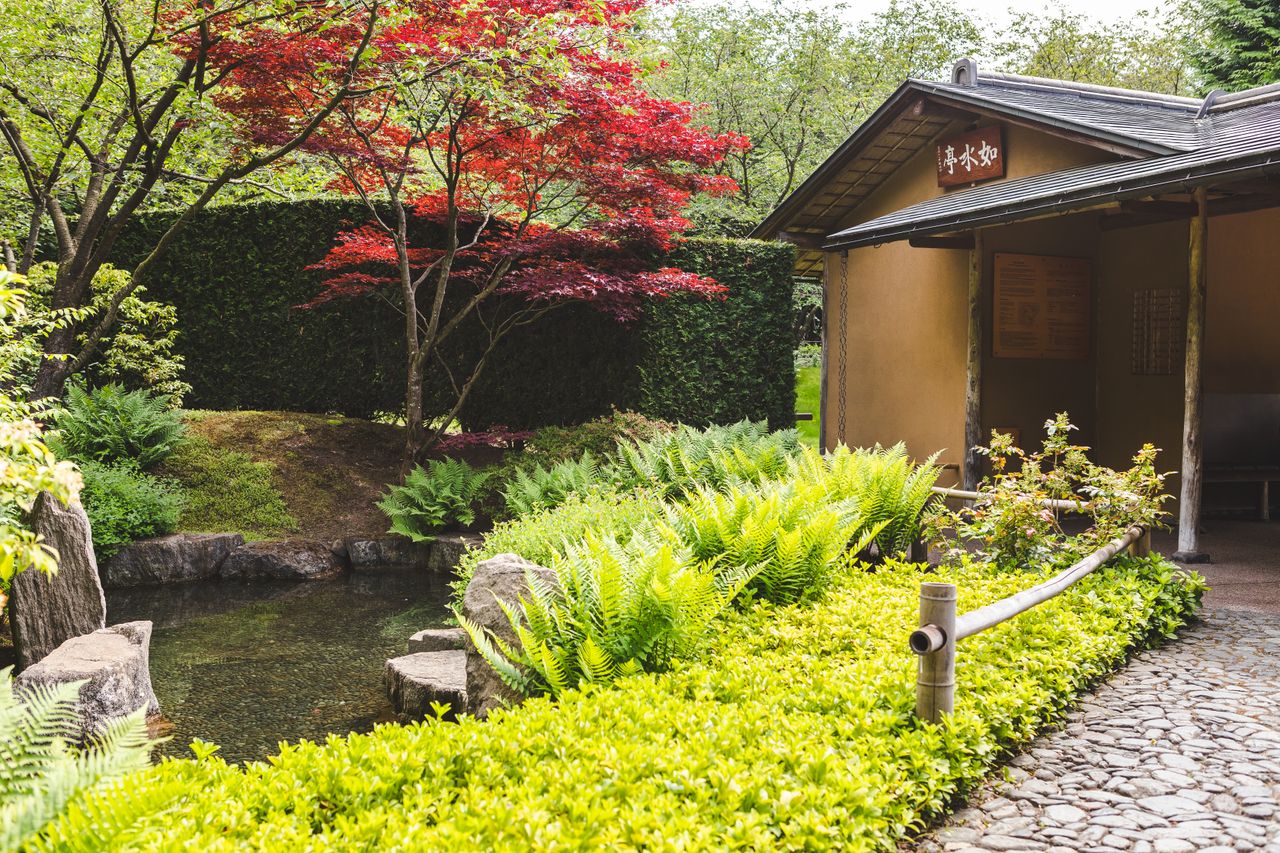 Der Japanische Garten in den Gärten der Welt besteht aus drei Gärten, die durch das Leitmotiv Wasser miteinander verbunden sind. In der Mitte der drei Gärten steht ein Pavillon, der Chaya. Ein traditioneller Zengarten komplementiert das Bild.