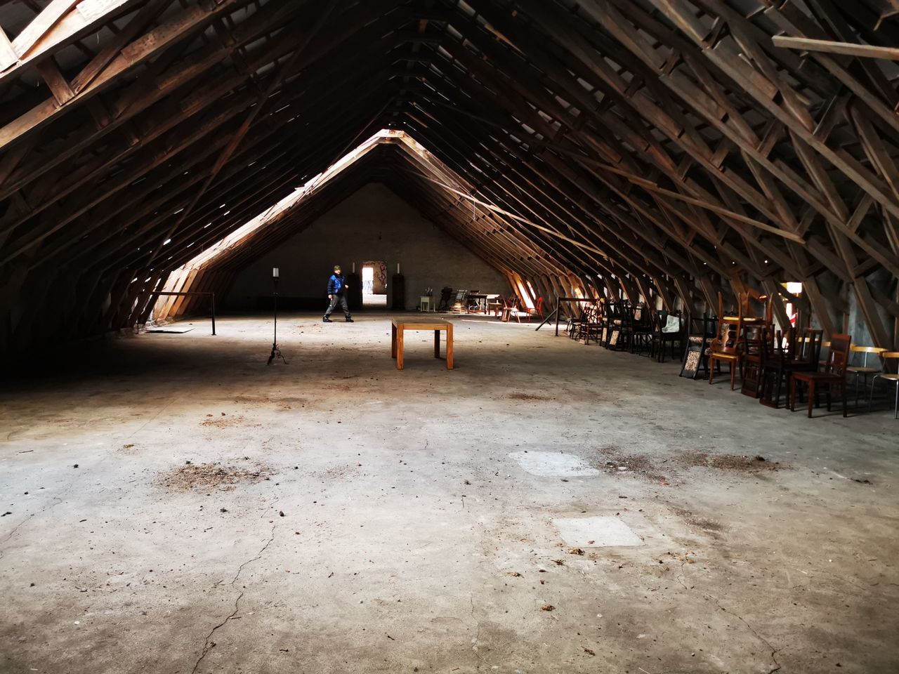 Der Dachboden (700 qm) teilt sich in zwei Räume, ohne Träger, dafür mit sichtbarem Gebälk.