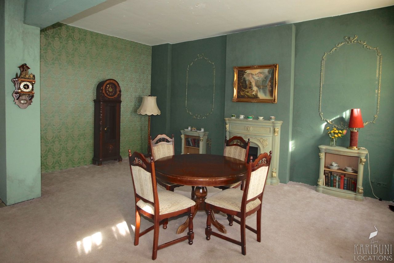 Ein Kamin ist der Blickfang unseres in verschiedenen Grüntönen gestalteten Barock-Zimmers, der liebevoll arrangierte Stuck ist ein weiterer Hingucker. Ein Esstisch mit vier Stühlen befinden sich in der Mitte des Raums.