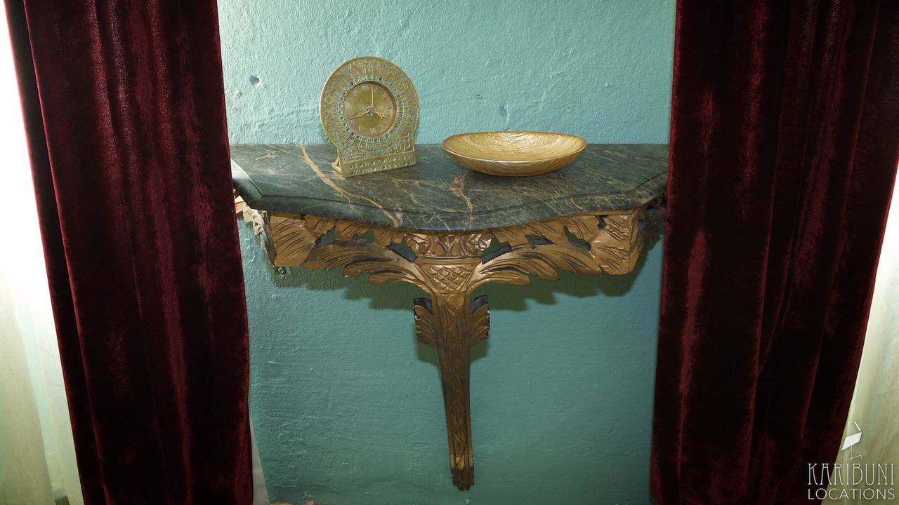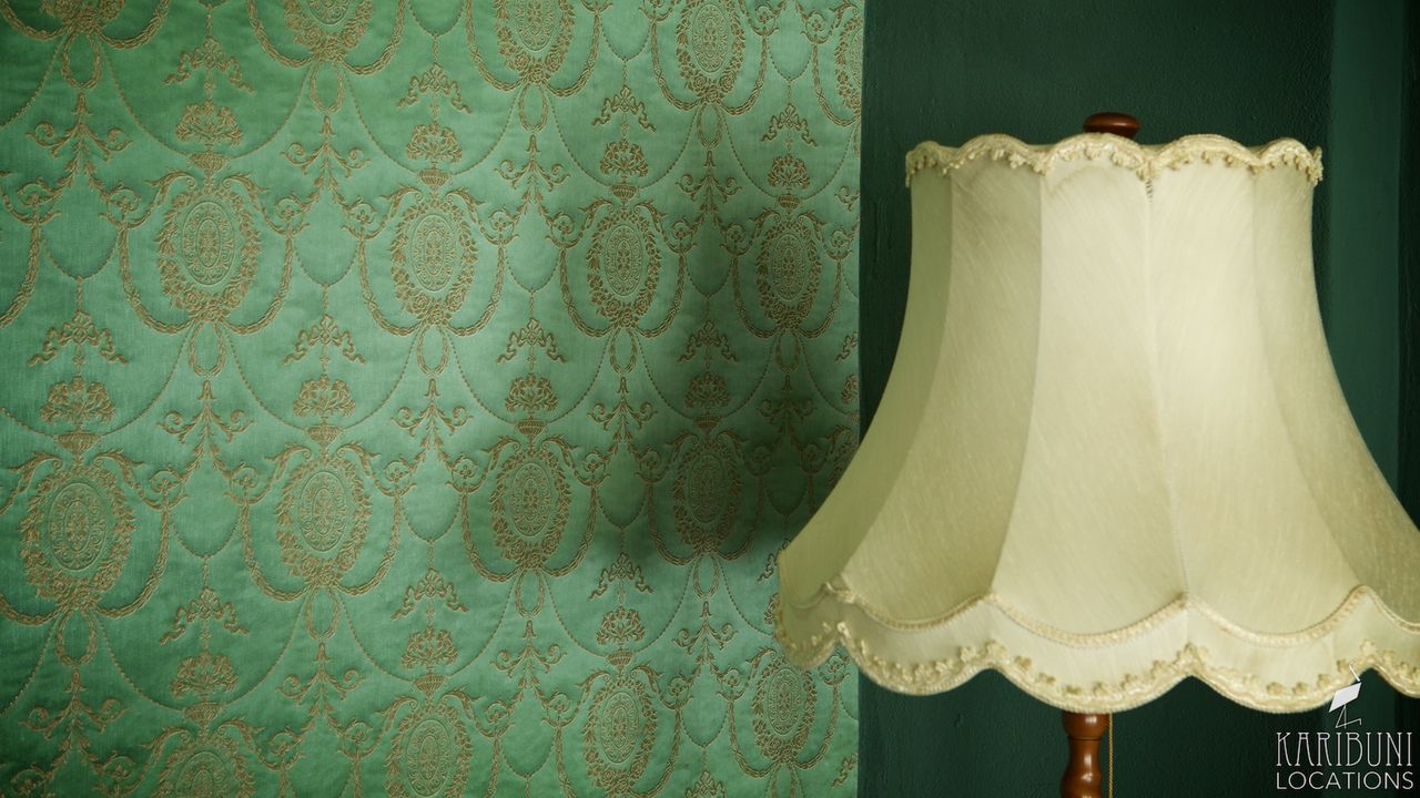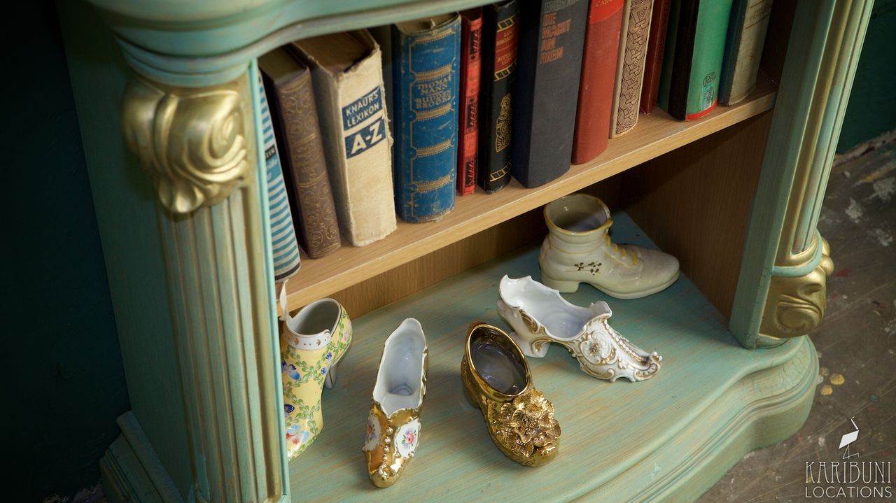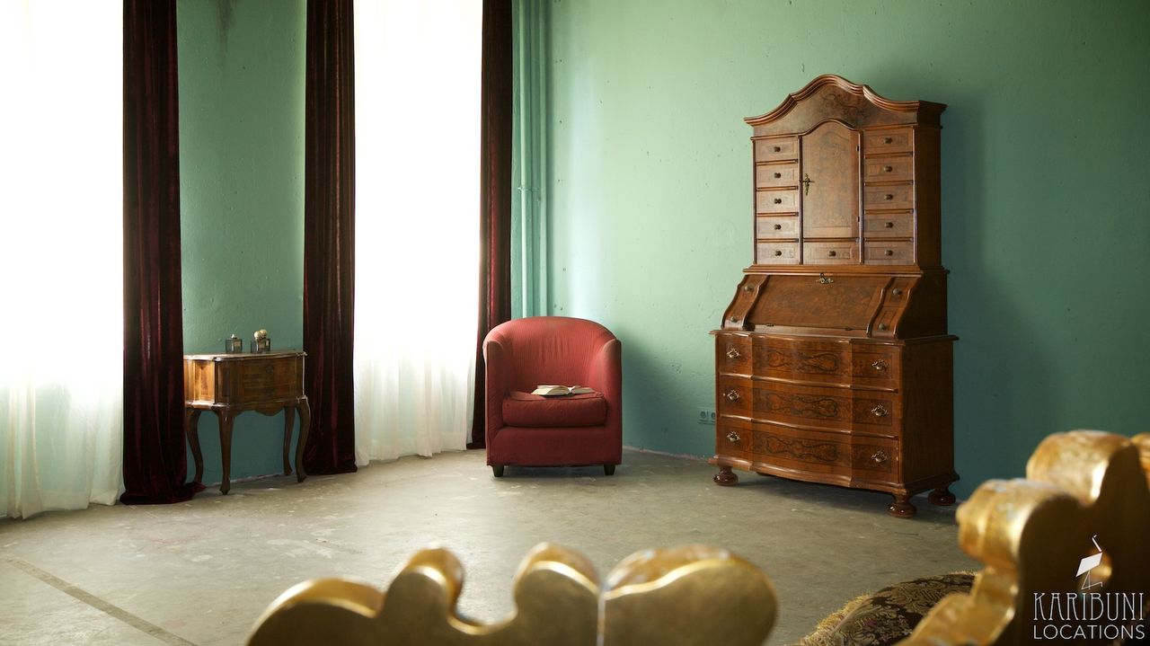 An der gegenüber liegenden Wand gibt es einen Sekretär aus dunklem Holz und einen roten Lesesessel. Cremefarbene Gardinen und bordeauxfarbene Schals aus Samt runden die Einrichtung ab.