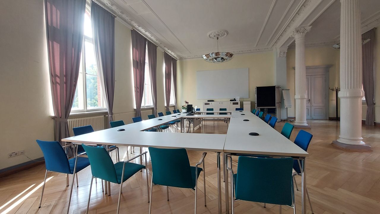 Großes Parkgelände mit Innenaufnahmen von Kapelle, Festsaal; Flure (innen andere Bereiche komplex)