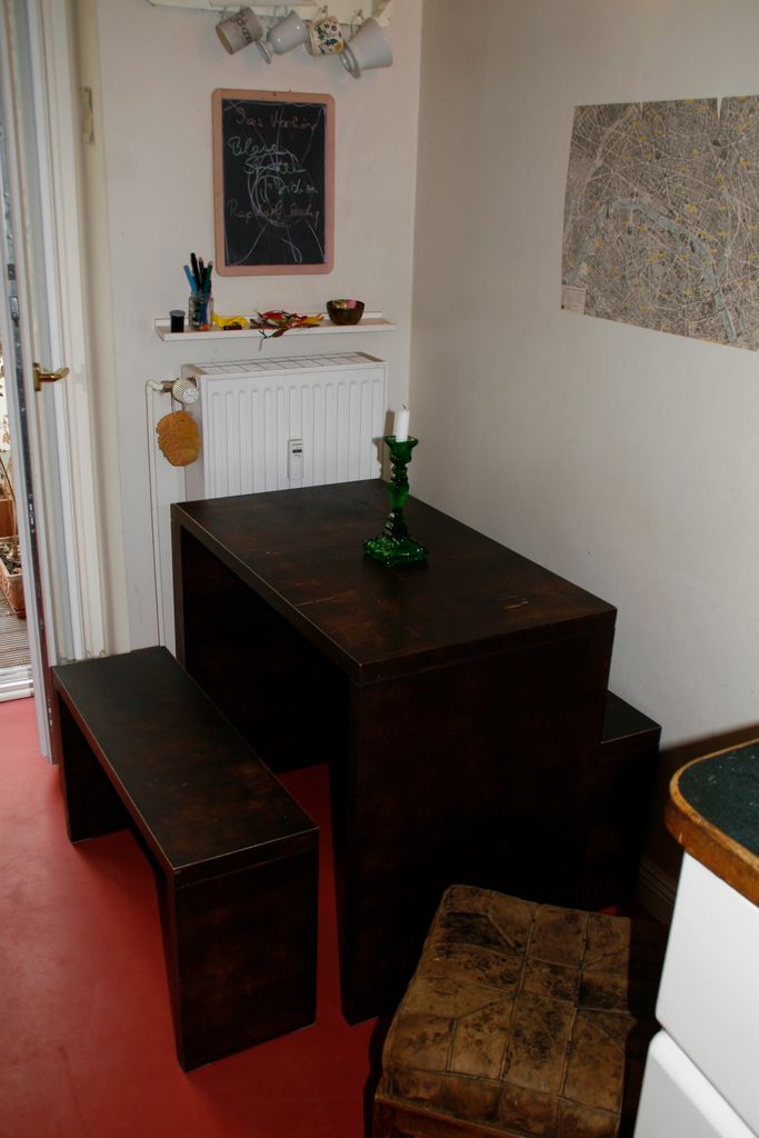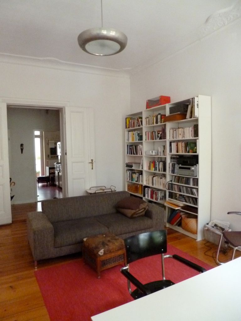 95 qm große, gepflegte Drei-Zimmer-Altbauwohnung in Prenzlauer Berg mit Holzdielen, hohen Decken und Stuck. Kastenfenster mit Gründerzeit-Oliven im Wohn- und Kinderzimmer. Eß- und Wohnzimmer mit Bauhaus-Elementen wie Lampen, Stühlen und Rollschrank sowie Designer-Tisch, 70er-Jahre-Klavier. Modernes Badezimmer mit Badewanne und WC. Separates Gäste-WC. Küche mit Linoleumboden. Zwei Balkone, der kleinere zur Straße, der größere zum Hinterhof. 1. Stock.