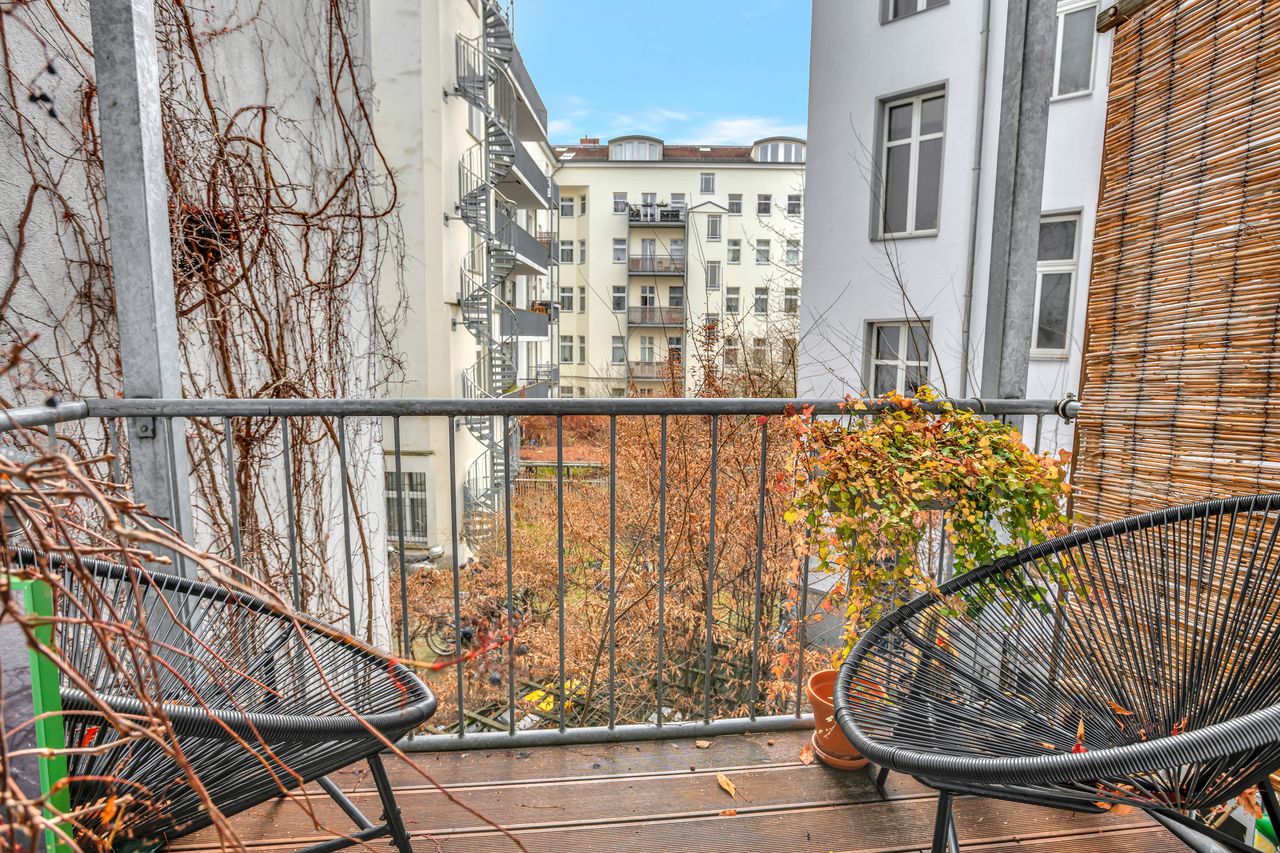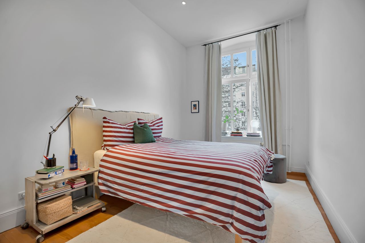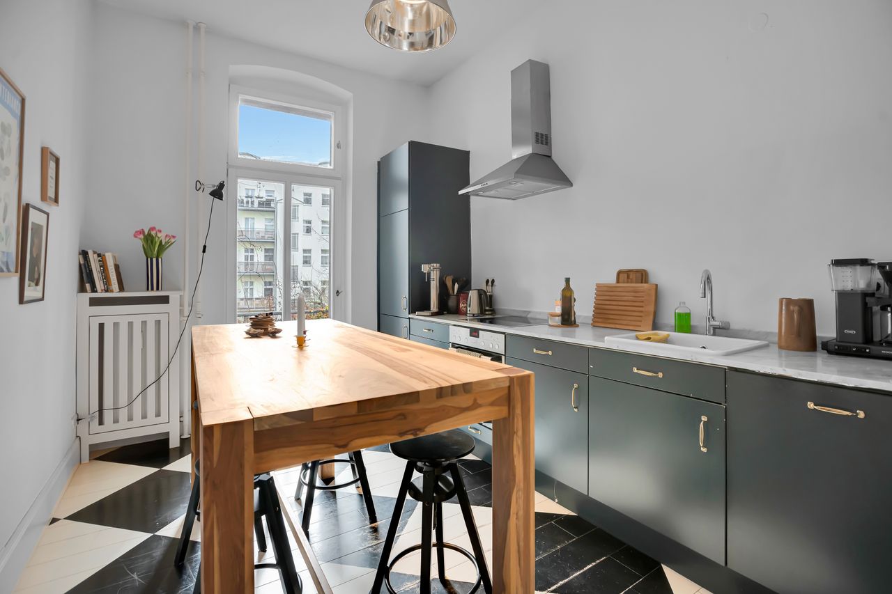 The apartment is located in the Located in the heart of Prenzlauer Berg, one of Berlin’s most sought-after neighbourhoods, this beautifully designed apartment is a perfect mix between new and old. Situated in a classic Altbau building, the apartment boasts high ceilings, elegant architecture, and large windows that fill the space with natural light.