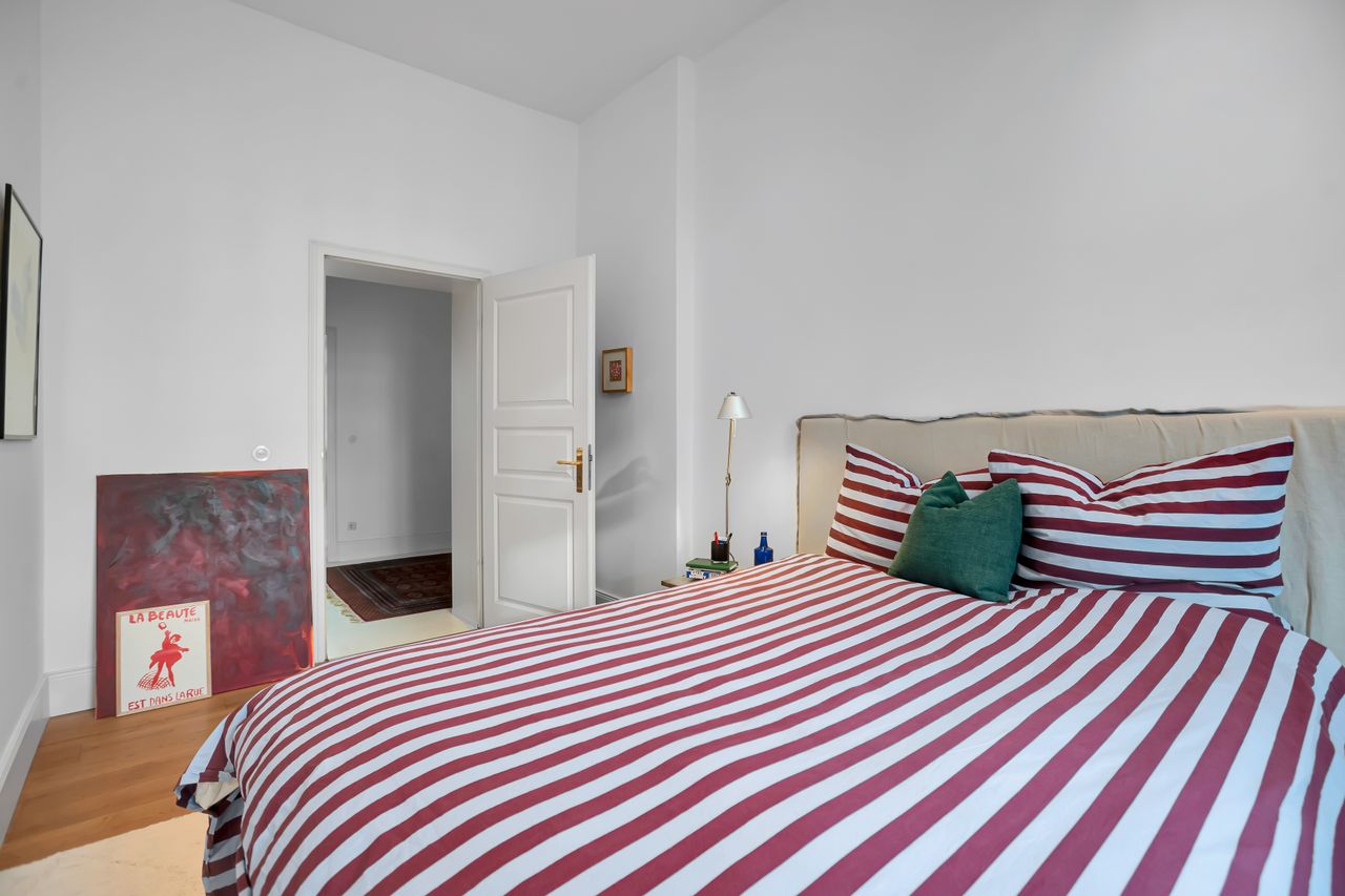 The apartment offers a seamless blend of open, airy spaces and cozy, intimate corners. The living area is bathed in natural light thanks to its tall windows, creating a warm and tranquil feeling.
