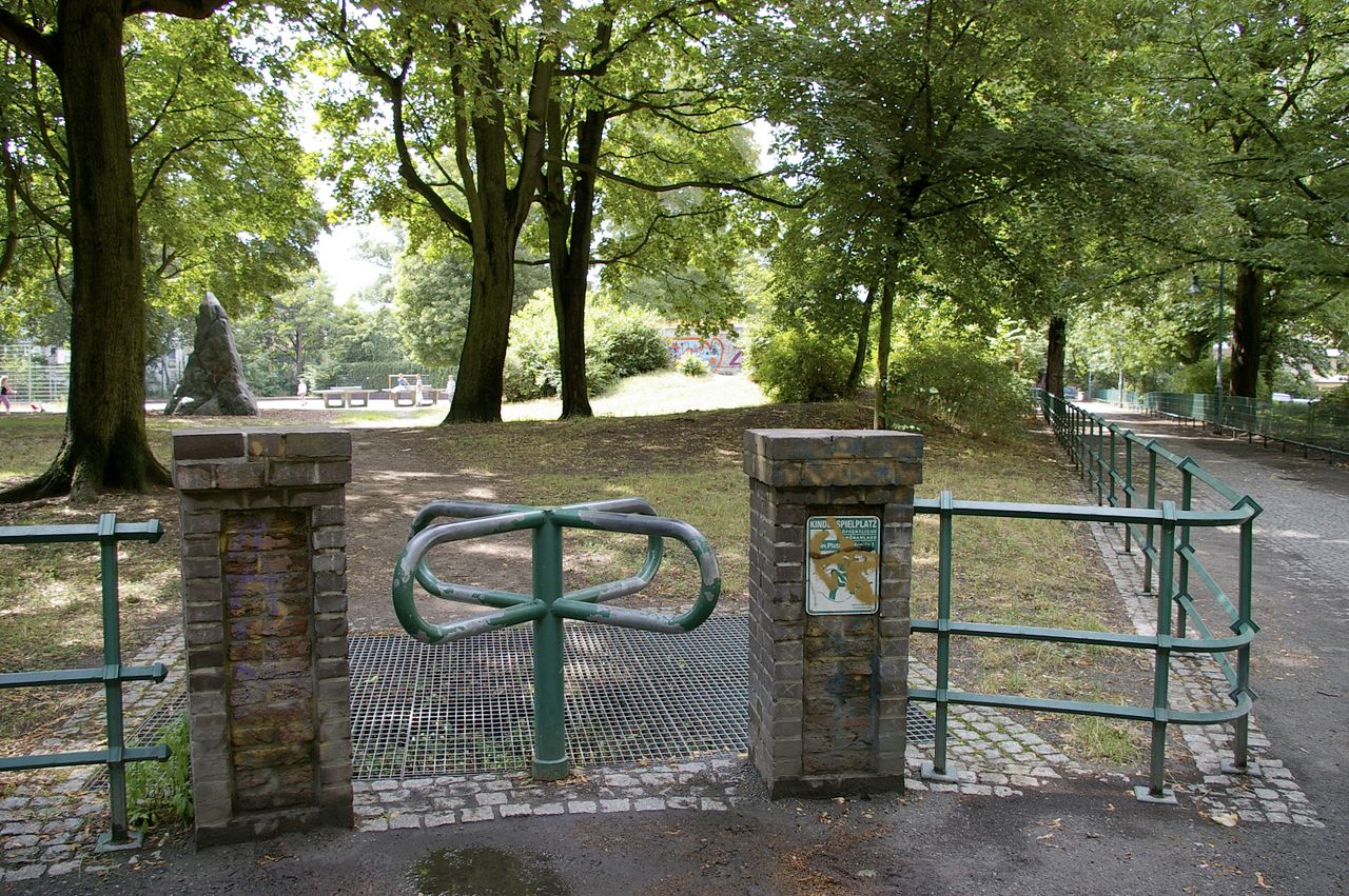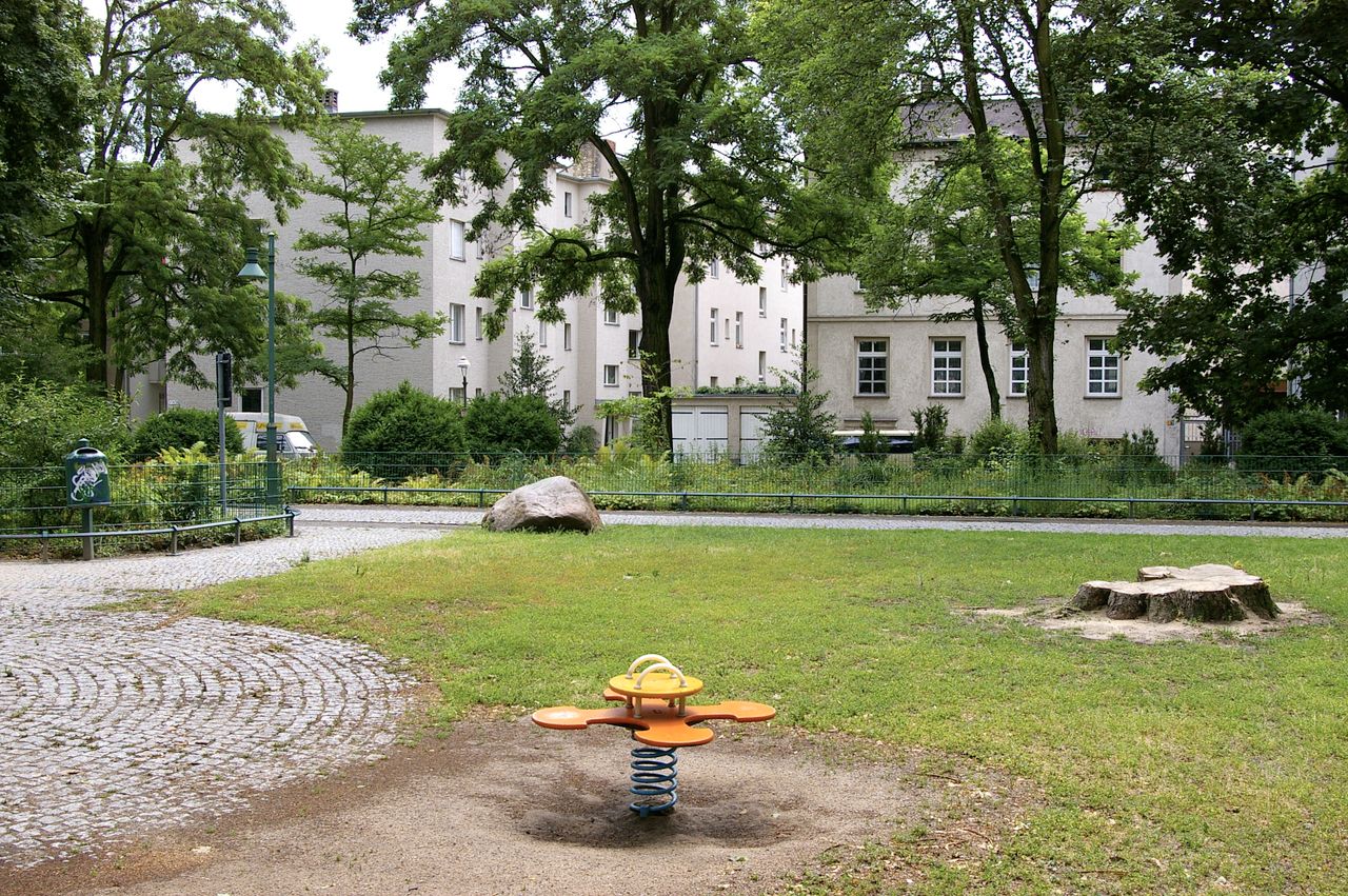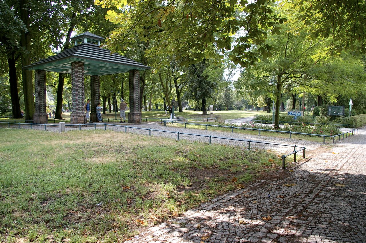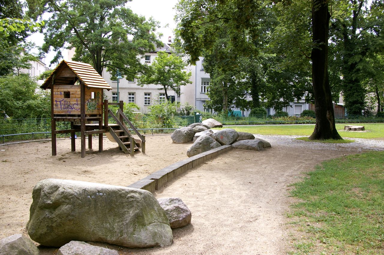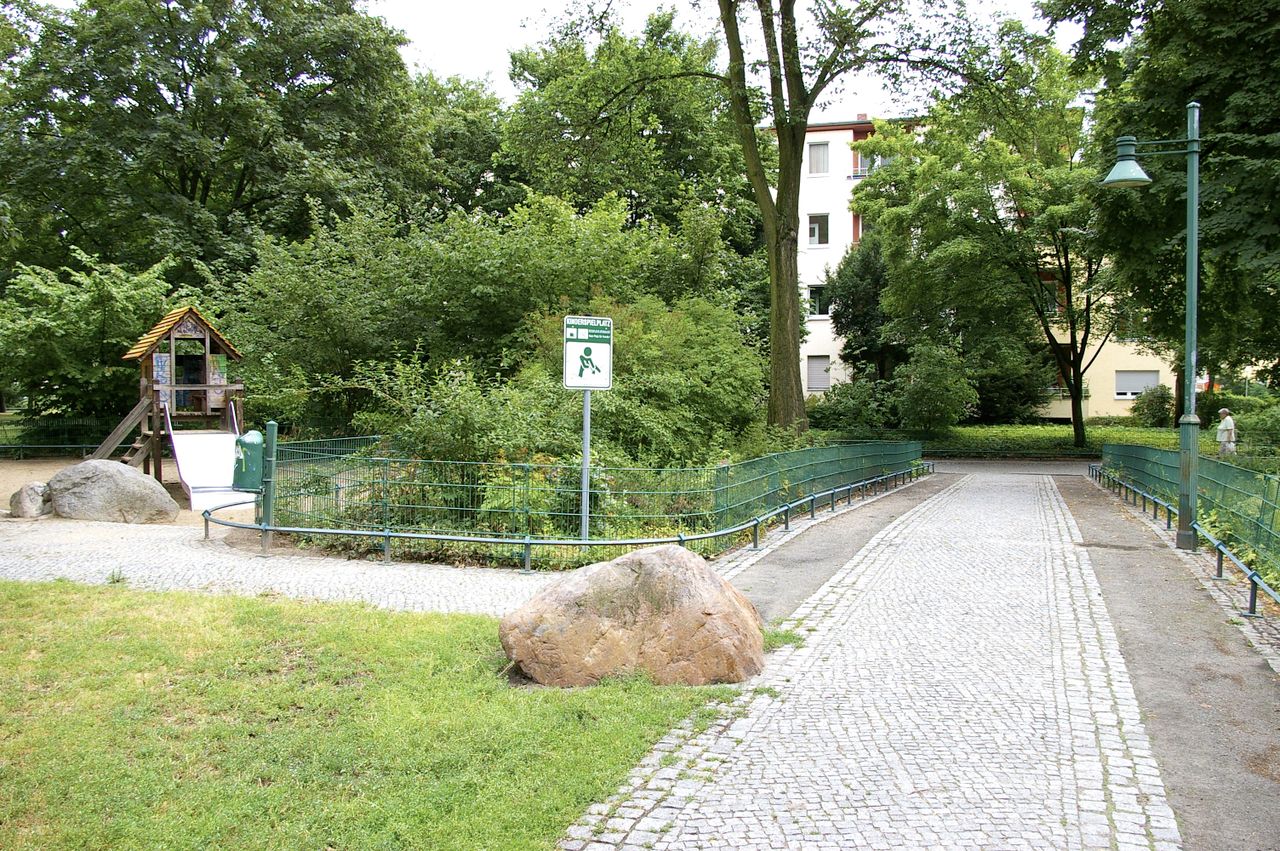Kleiner, überschaubarer Park mit einem malerischen Pavillon in der Parkmitte, sowie einem Spielplatz, Parkbänken und einer Skulptur. Der Park ist umgeben von Wohnhäusern, hauptsächlich aus den 60er und 50er Jahren.