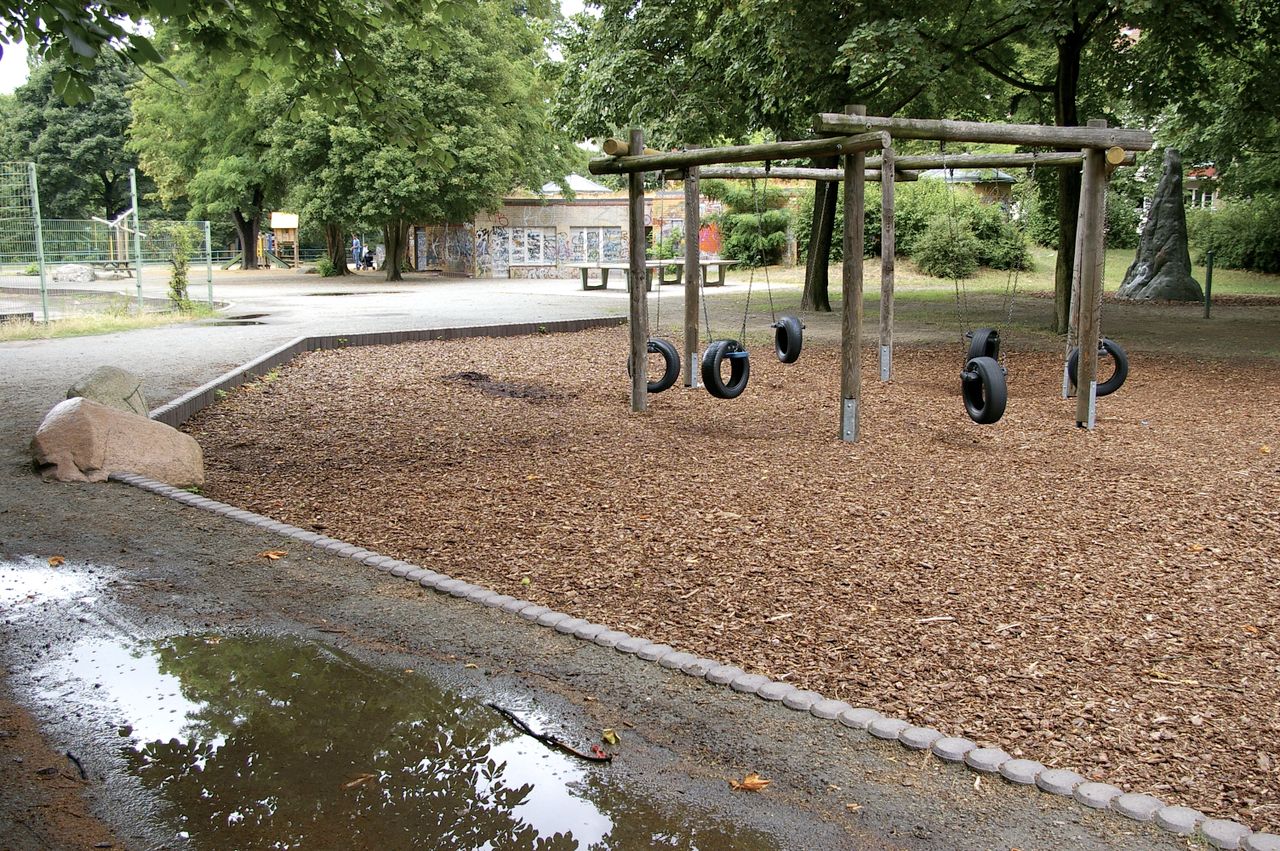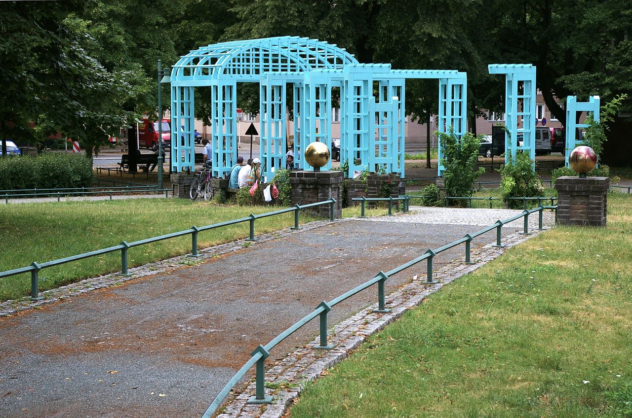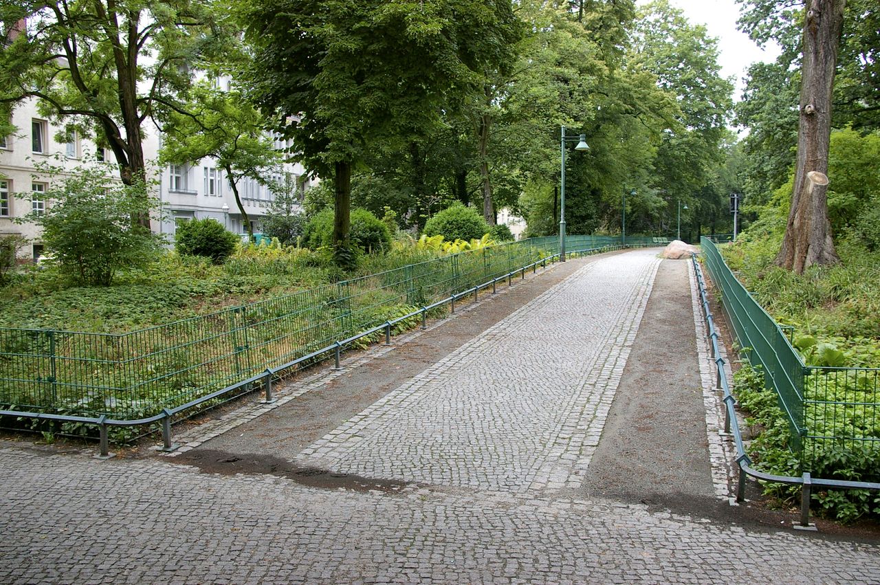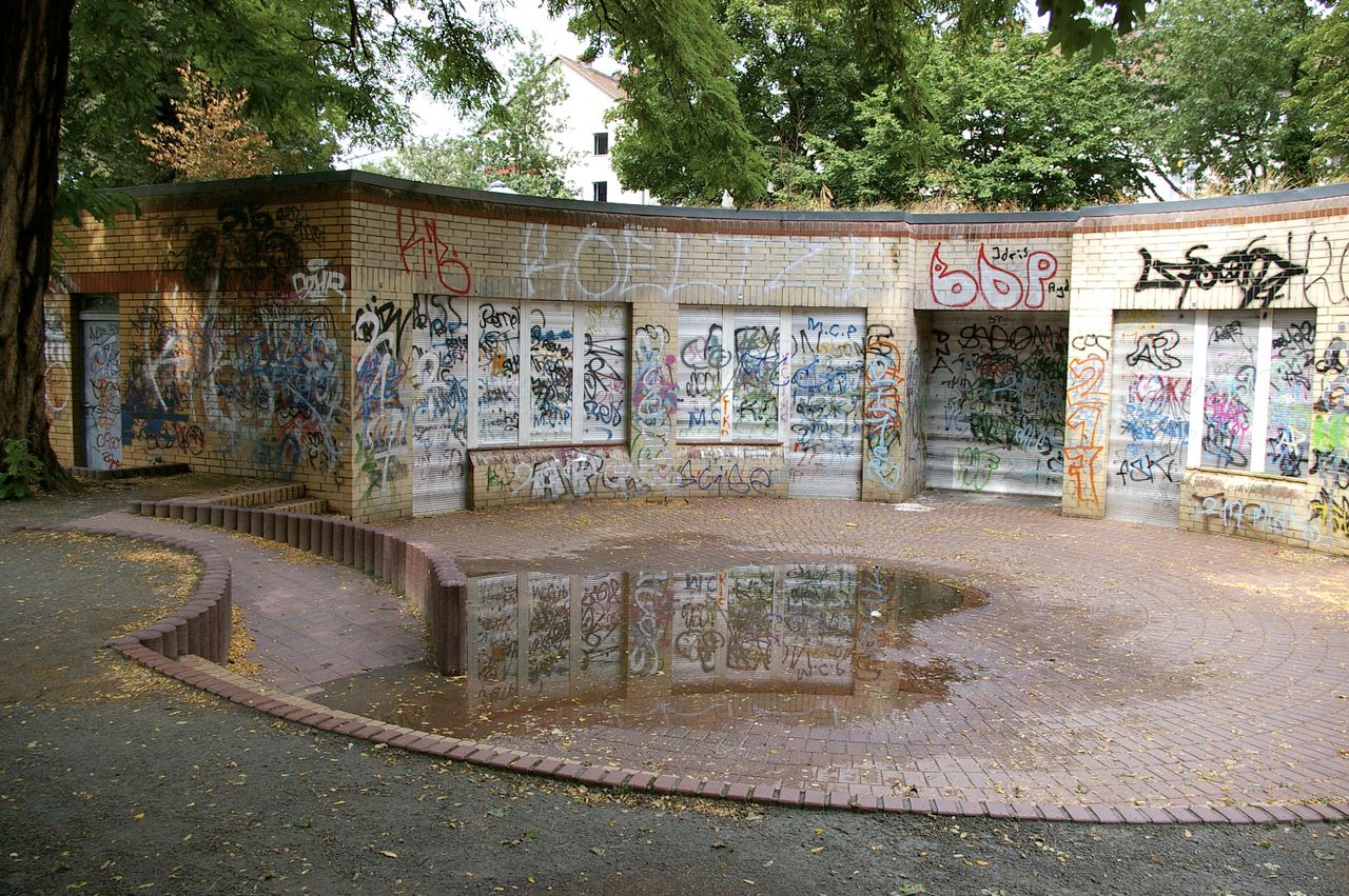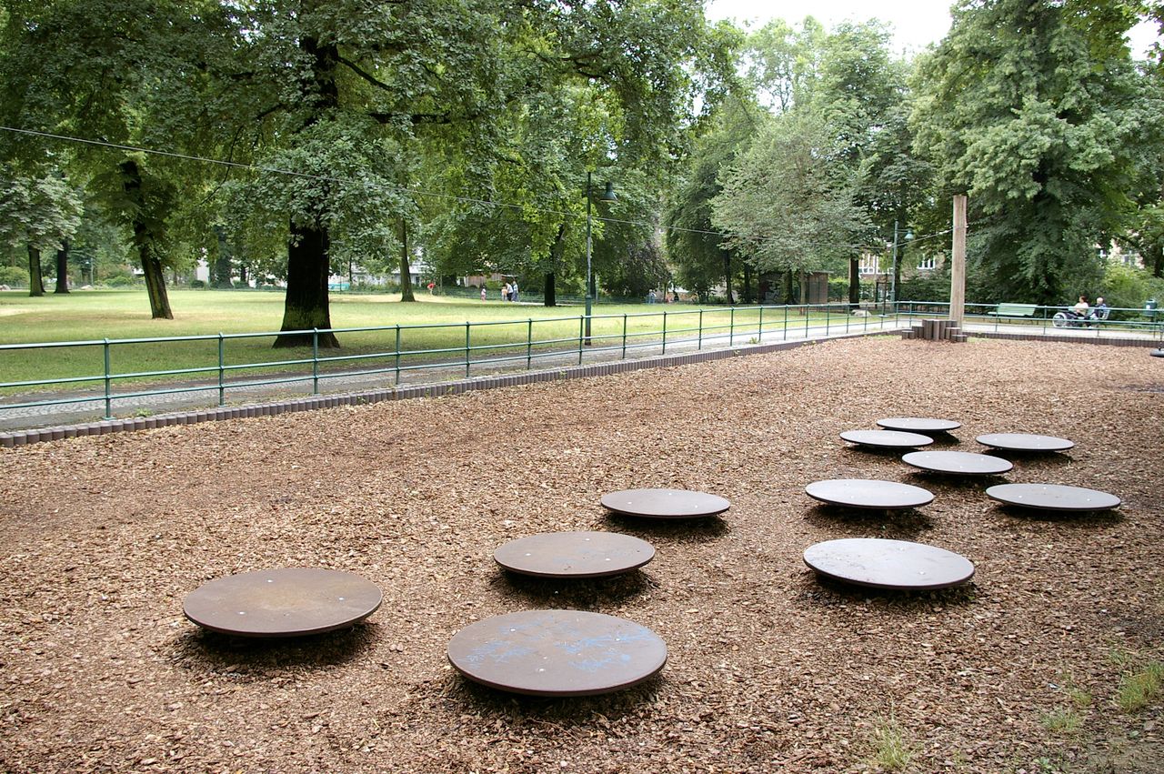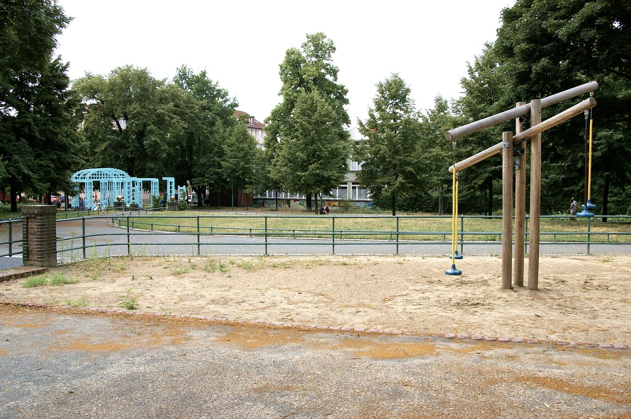 Kleiner, überschaubarer Park mit einem malerischen Pavillon in der Parkmitte, sowie einem Spielplatz, Parkbänken und einer Skulptur. Der Park ist umgeben von Wohnhäusern, hauptsächlich aus den 60er und 50er Jahren.