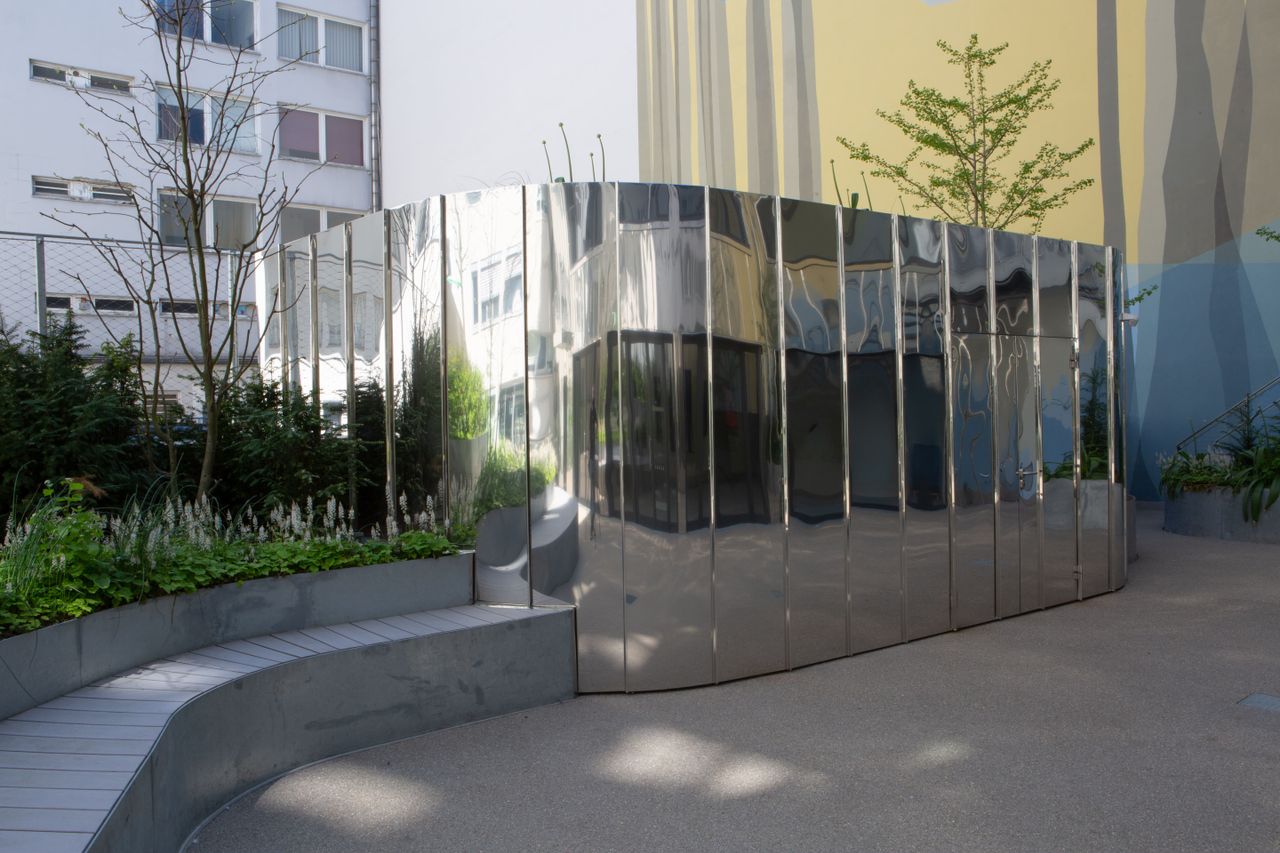 Besonders herausragend ist der wunderschöne Garten, der das Gebäude umgibt und eine einzigartige Atmosphäre schafft. Die Hausoberfläche ist kunstvoll gestaltet und verchromte Elemente setzen stilvolle Akzente im Kontrast zur grünen Umgebung. Diese Kombination schafft eine ästhetisch ansprechende und inspirierende Kulisse für Film- und Serienproduktionen.