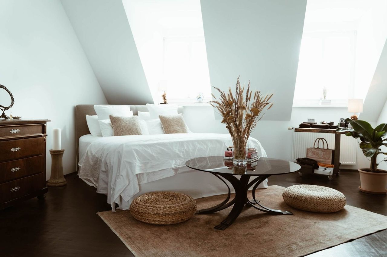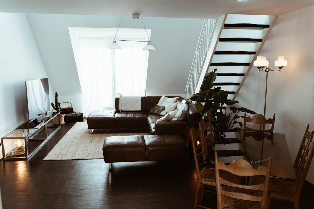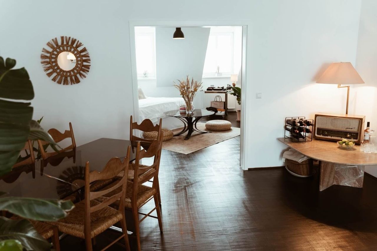 A space where mid-century, meets boho, meets industrial. With a base of dark wood floors, contrasting against white walls and a palette of neutral, earthy coloured décor - this Home Studio makes a warm yet moody set for photo, video and film shoots.