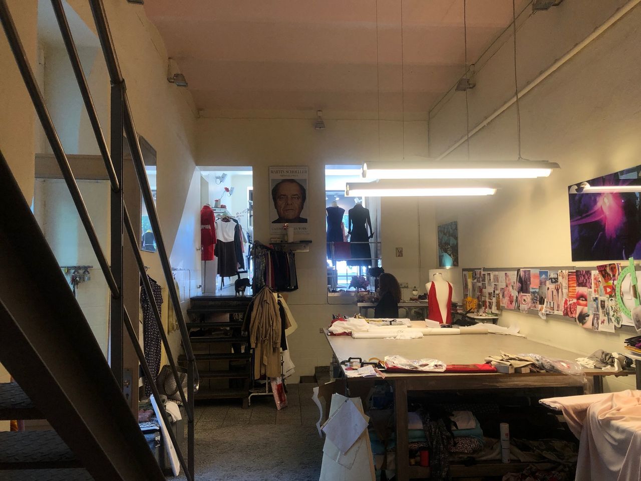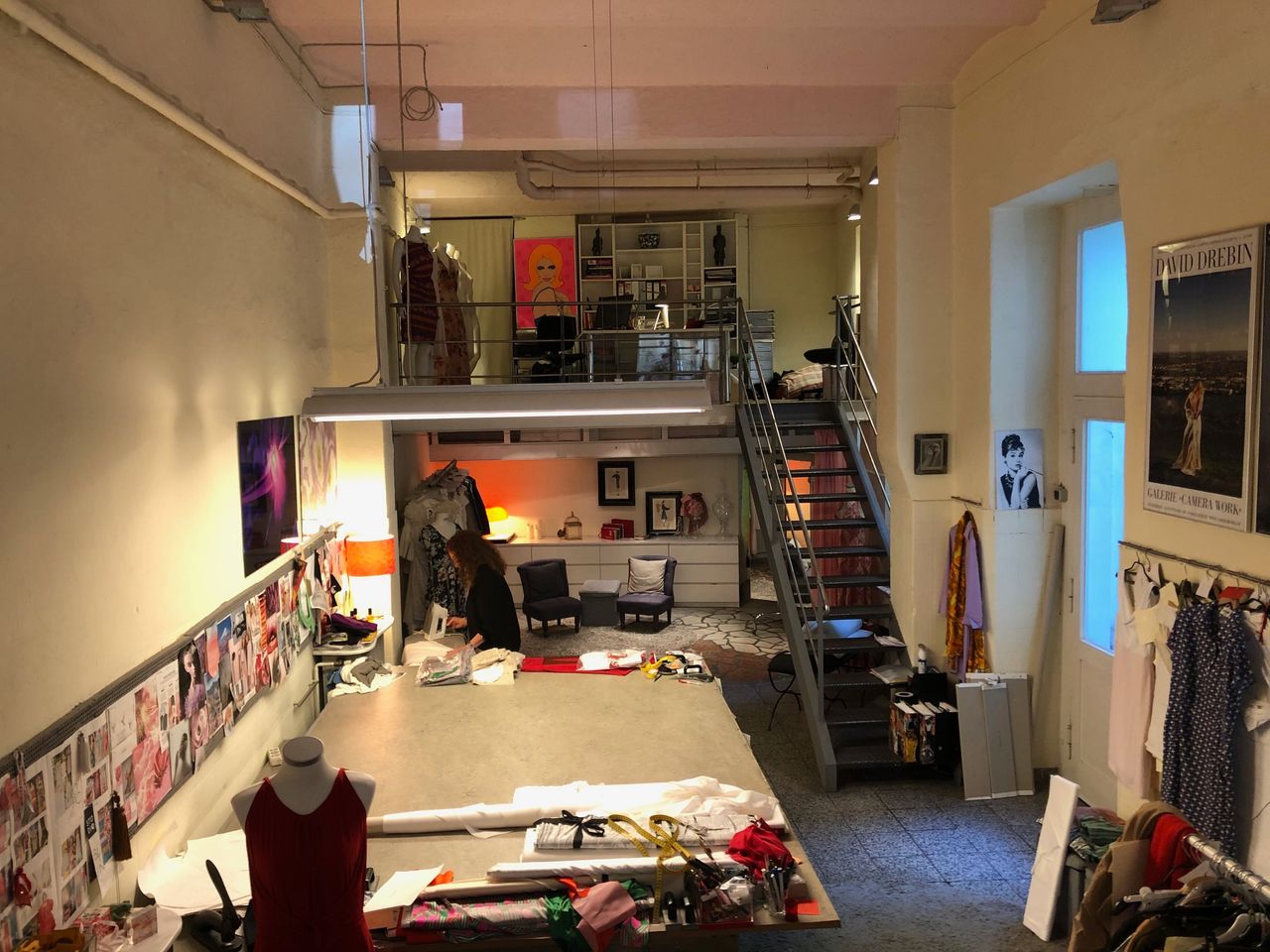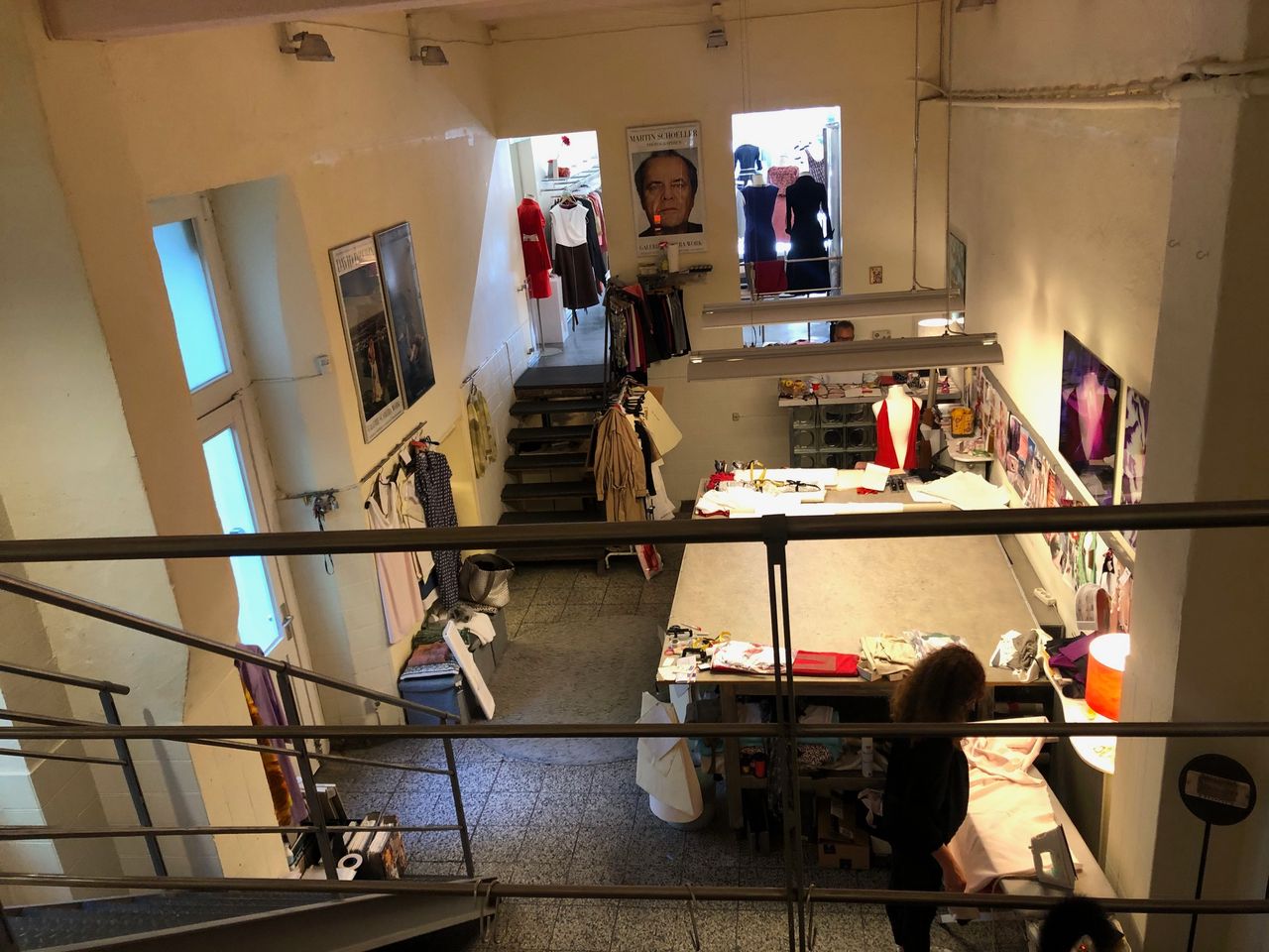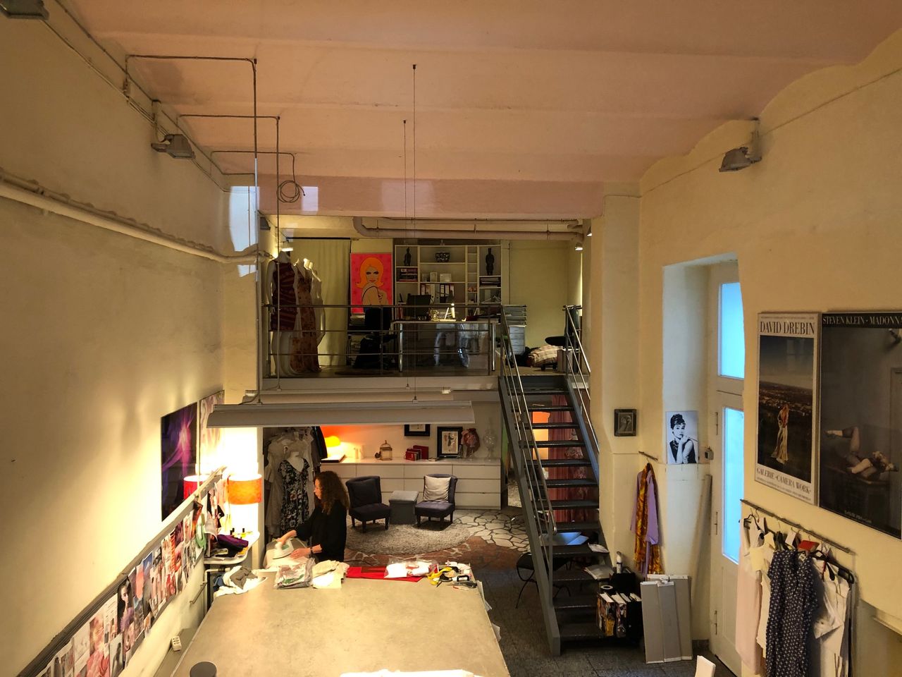 Laden mit Schneiderwerkstatt / - Atelier und Zugang zum Hinterhof Der Werkstattraum zeichnet sich durch hohe Decken aus, da Souterrain und Erdgeschoß eins sind. Eine Stahltreppe führt zu einer kleinen Empore.