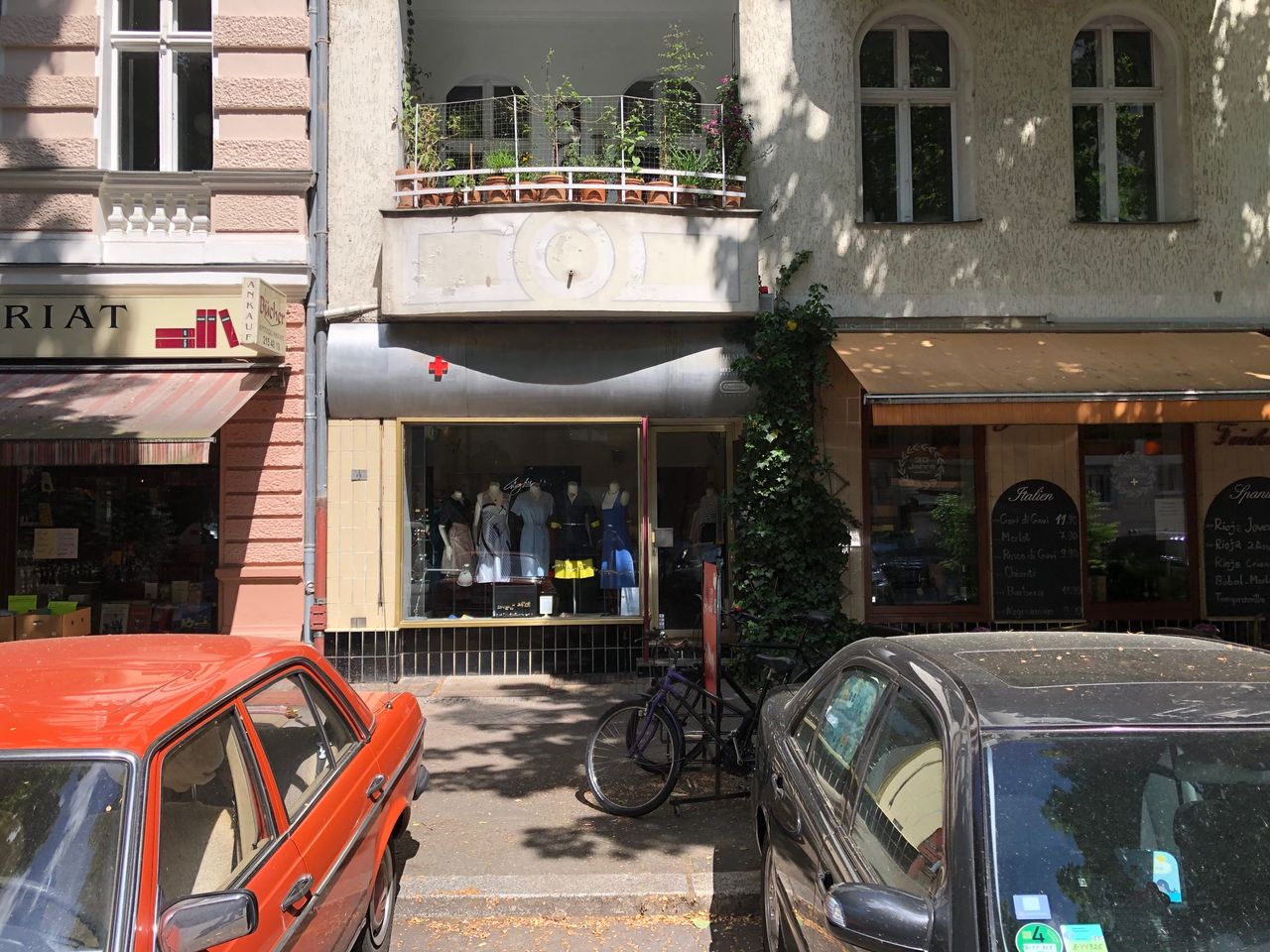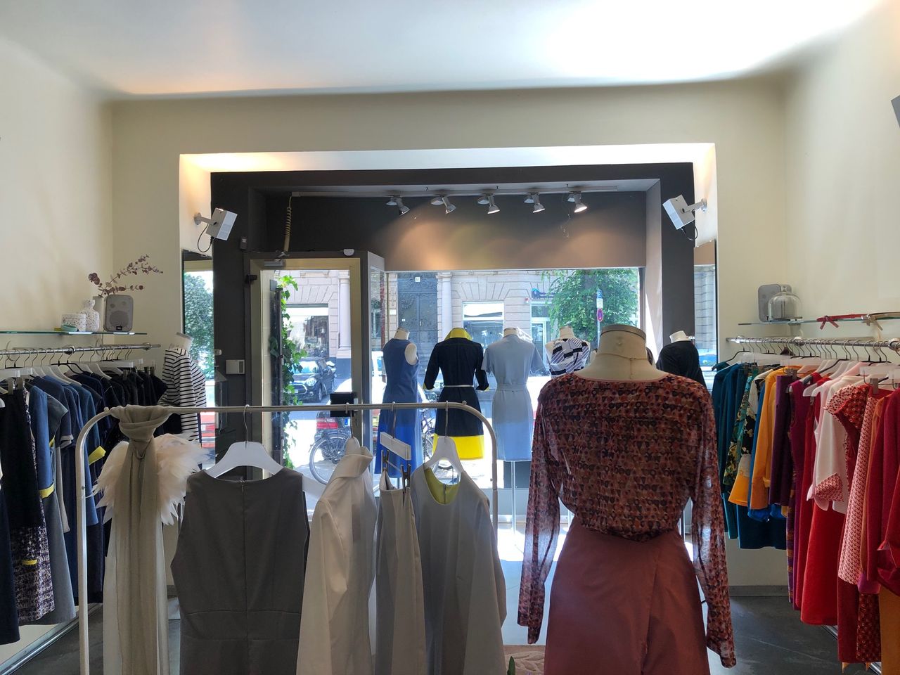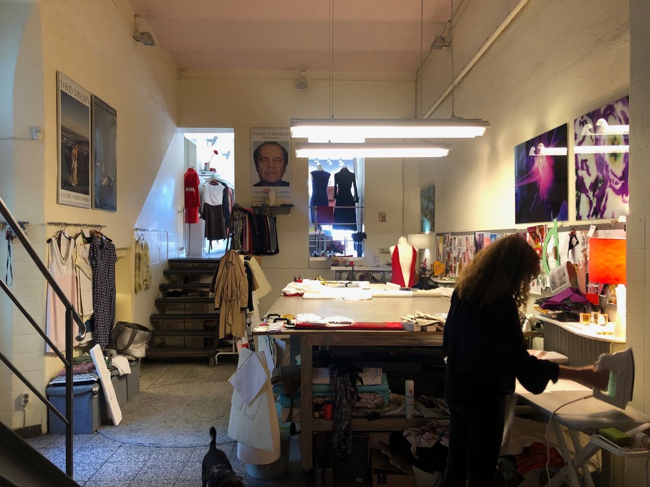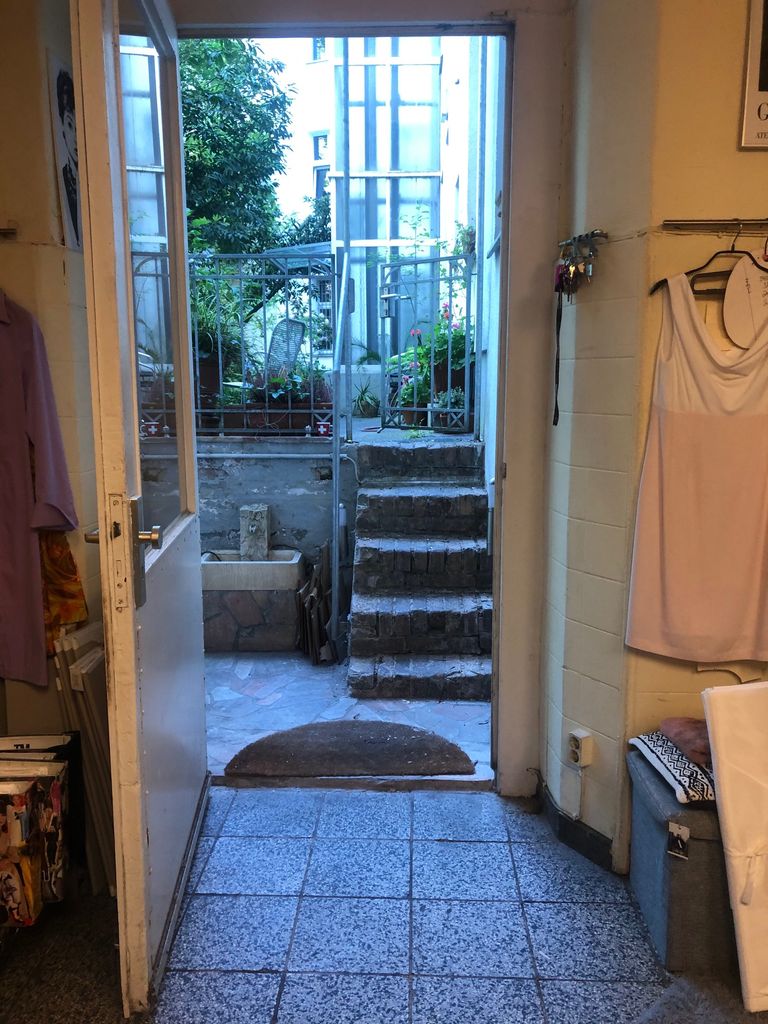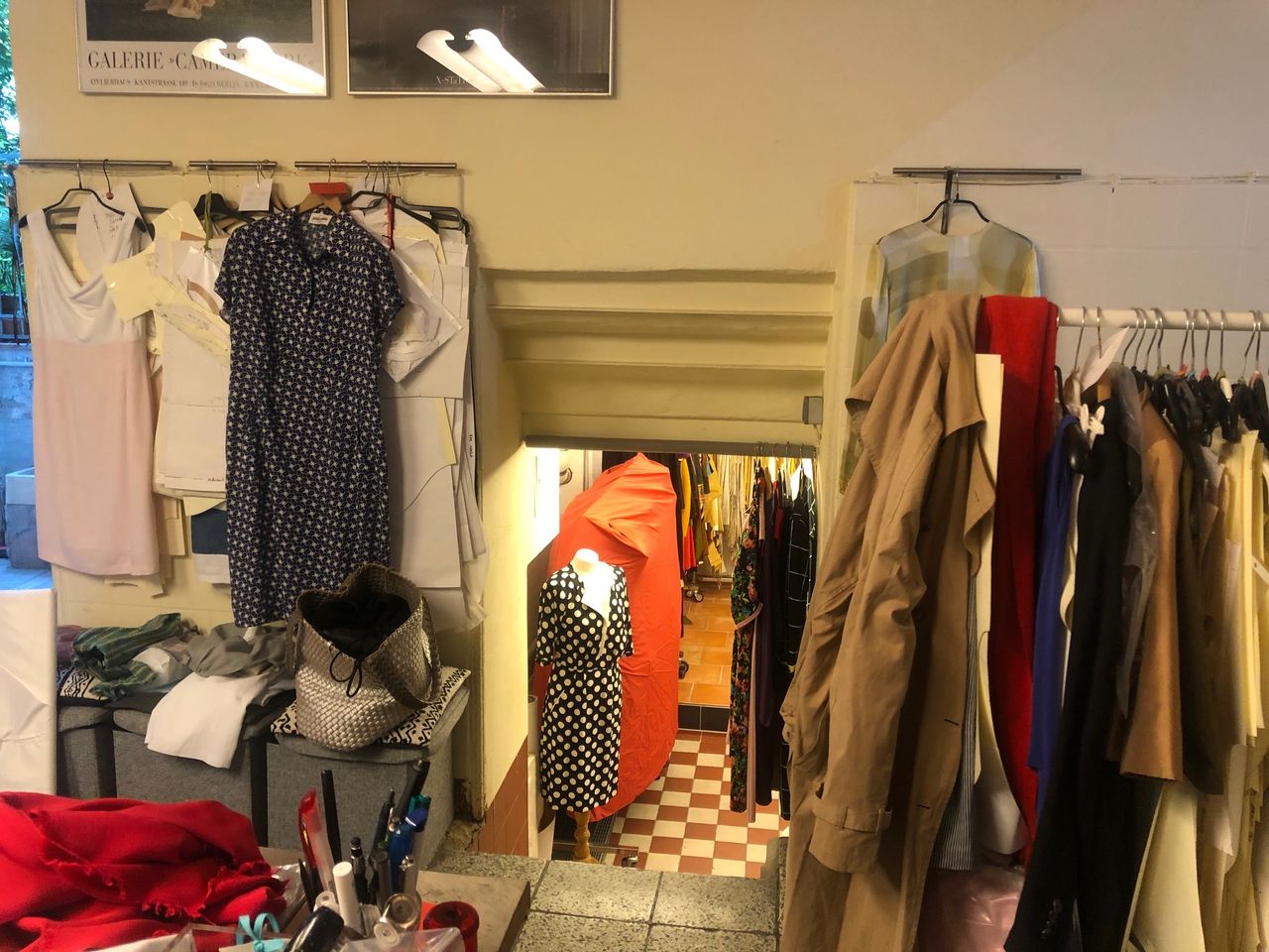 Laden mit Schneiderwerkstatt / - Atelier und Zugang zum Hinterhof Der Werkstattraum zeichnet sich durch hohe Decken aus, da Souterrain und Erdgeschoß eins sind. Eine Stahltreppe führt zu einer kleinen Empore.