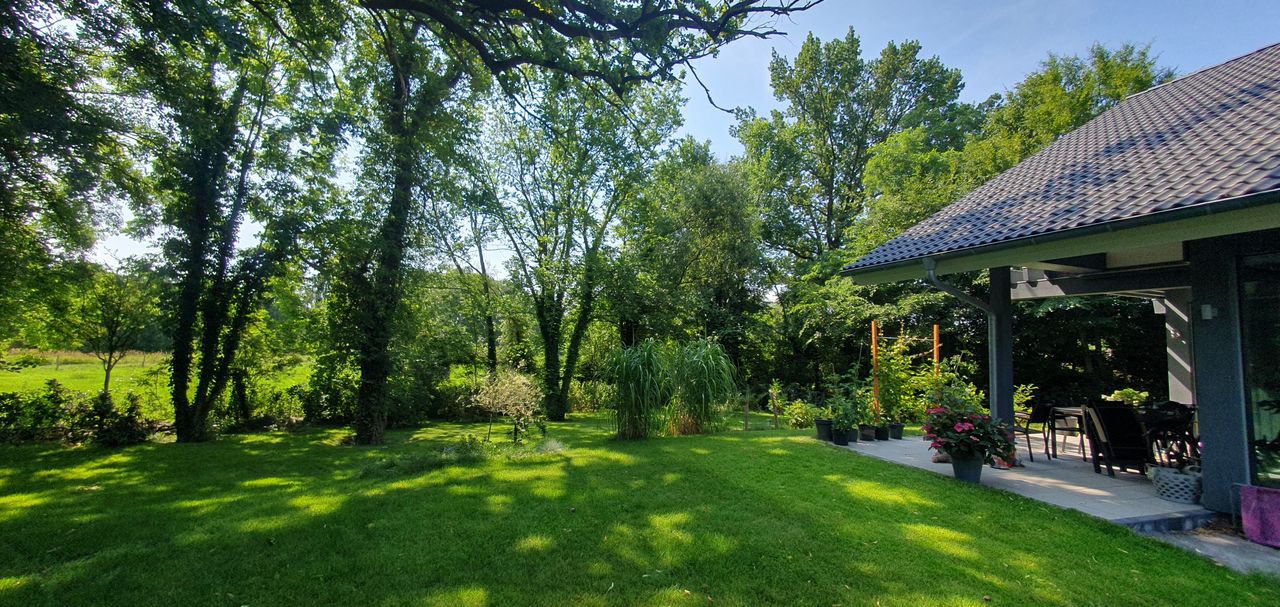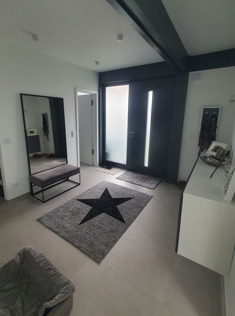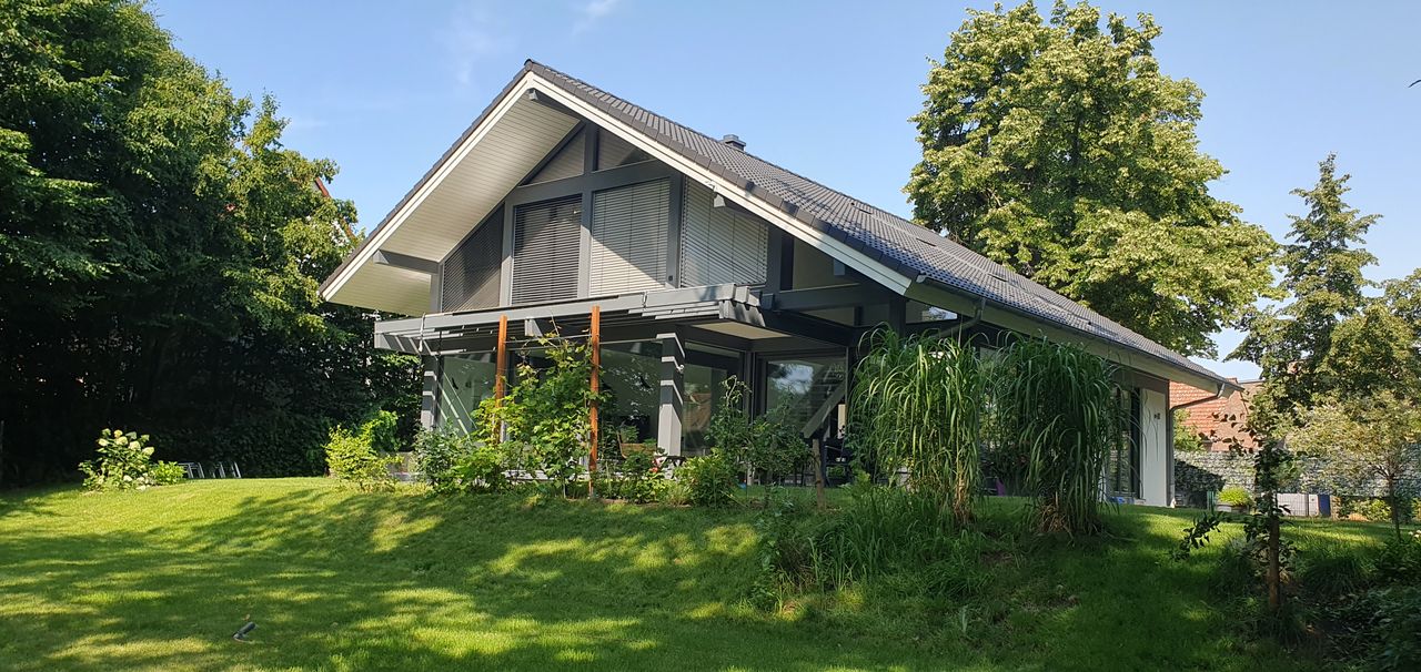 Lichtdurchfluteter, sehr großzügig und offen gestalteter Neubau in HUF-Haus Optik, graue Holzbalken in Kontrast zu weißen Wänden und hellgrauem Fußboden. Das Haus steht auf einem wunderschönen, großen Grundstück mit unverbaubarem Blick auf eine Rinderweide, eingerahmt in alten Baumbestand in einem schönen Dorf nahe Ludwigsfelde.