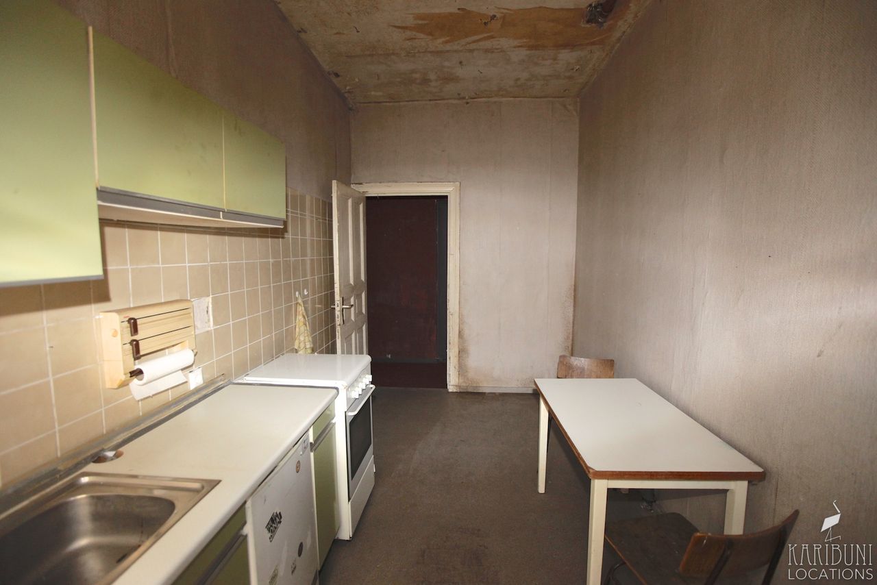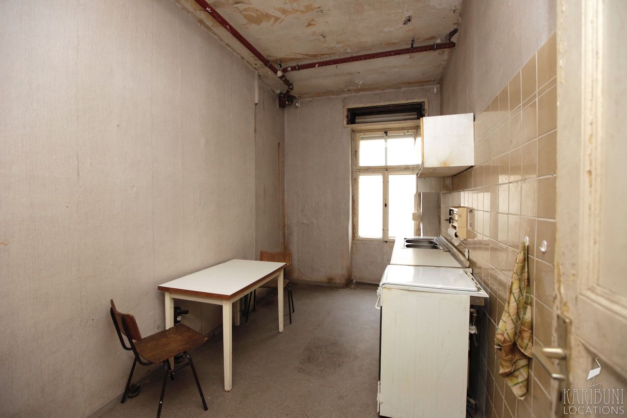 Diese Erdgeschosswohnung mit mintgrüner 80er Jahre Küche hat einen rohen, abgewohnten Look. Im Wohnzimmer steht ein altes Ledersofa als Basis für weiteres Set-Design.