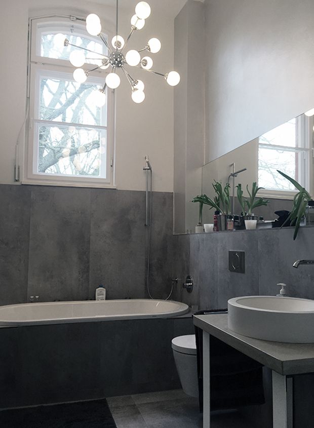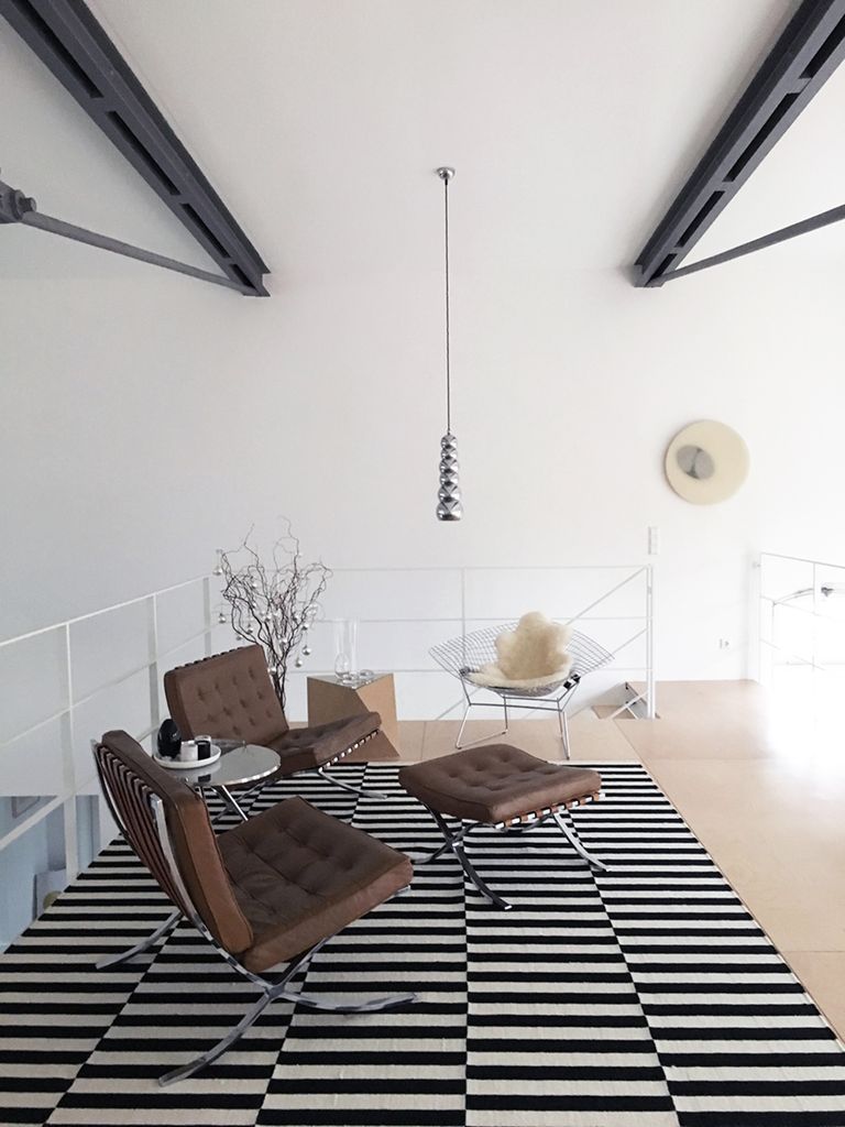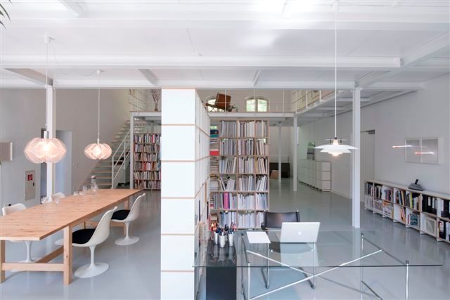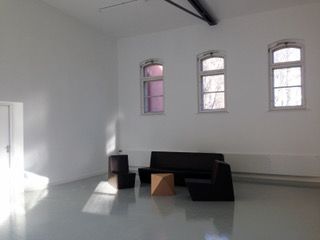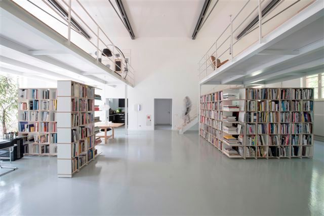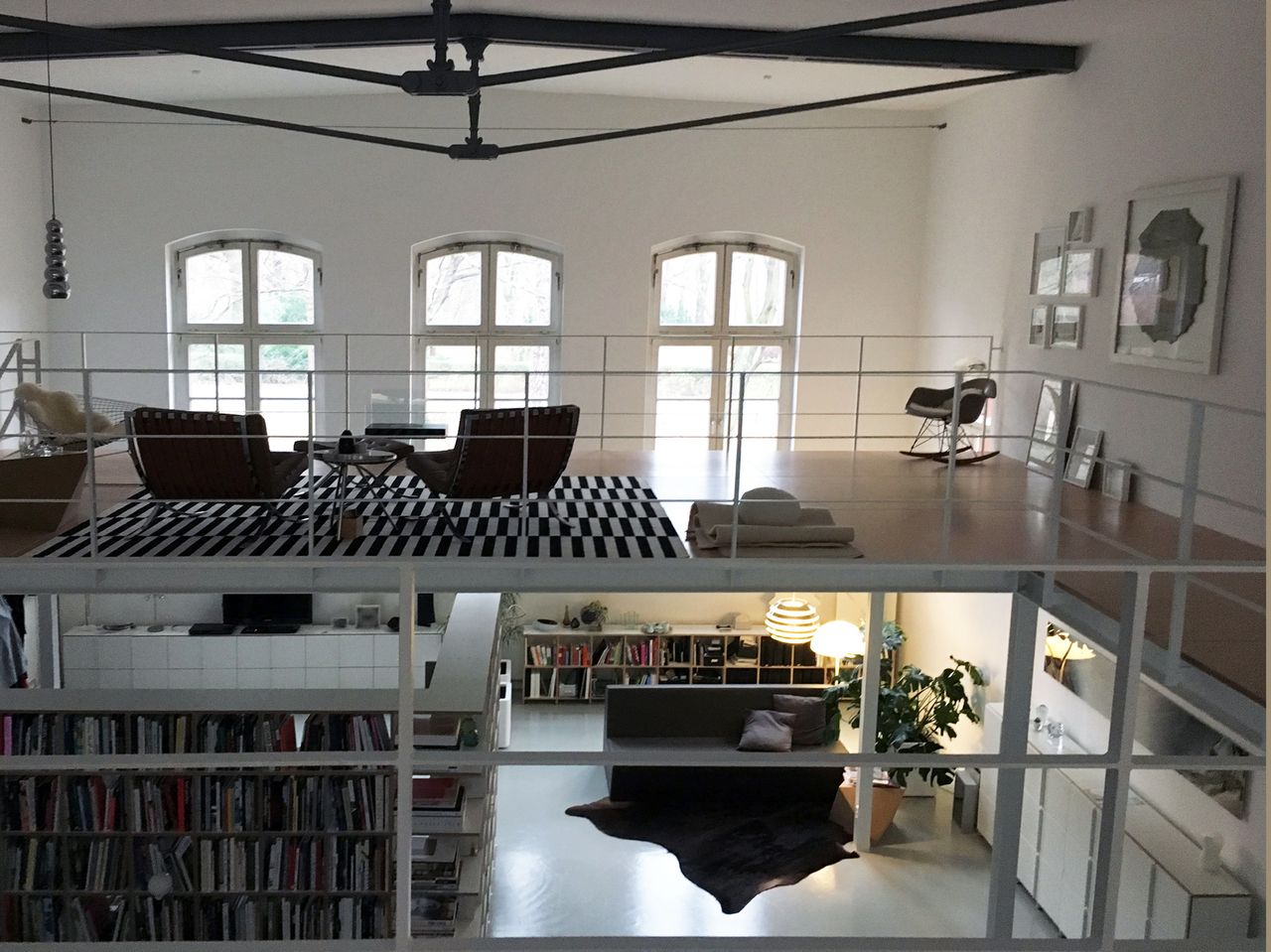 In die ehemalige Schwimmhalle (150 m2, 6.3 m hoch) mit historischer Tragstruktur wurde ein offenes Galeriegeschoss eingestellt, um den Charakter der Halle zu erhalten und zugleich eine wohnliche Atmosphäre zu gewinnen. Bücherregale dienen als offene Raumteiler. Grosse Fenster sorgen einerseits für viel Licht und den Blick in Baumkronen eines 200 Jahre alten Baumbestandes auf dem leicht verwilderten grossen Grundstück. Angrenzend gibt es eine zweite, etwas kleinere Halle (60m2, Höhe ca. 4.6m), der leer ist und als Atelier und Ausstellungsraum genutzt wird.