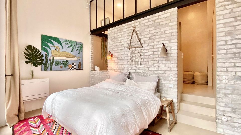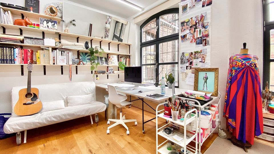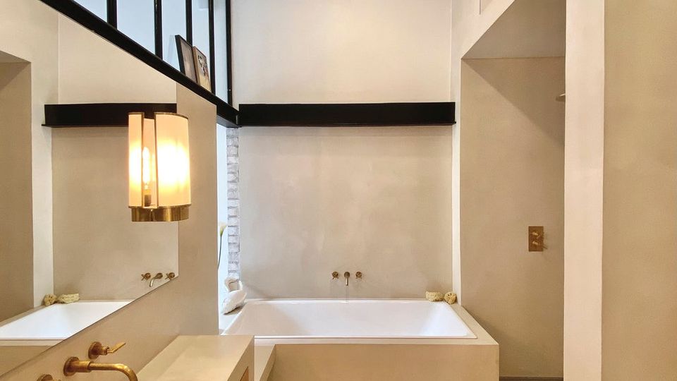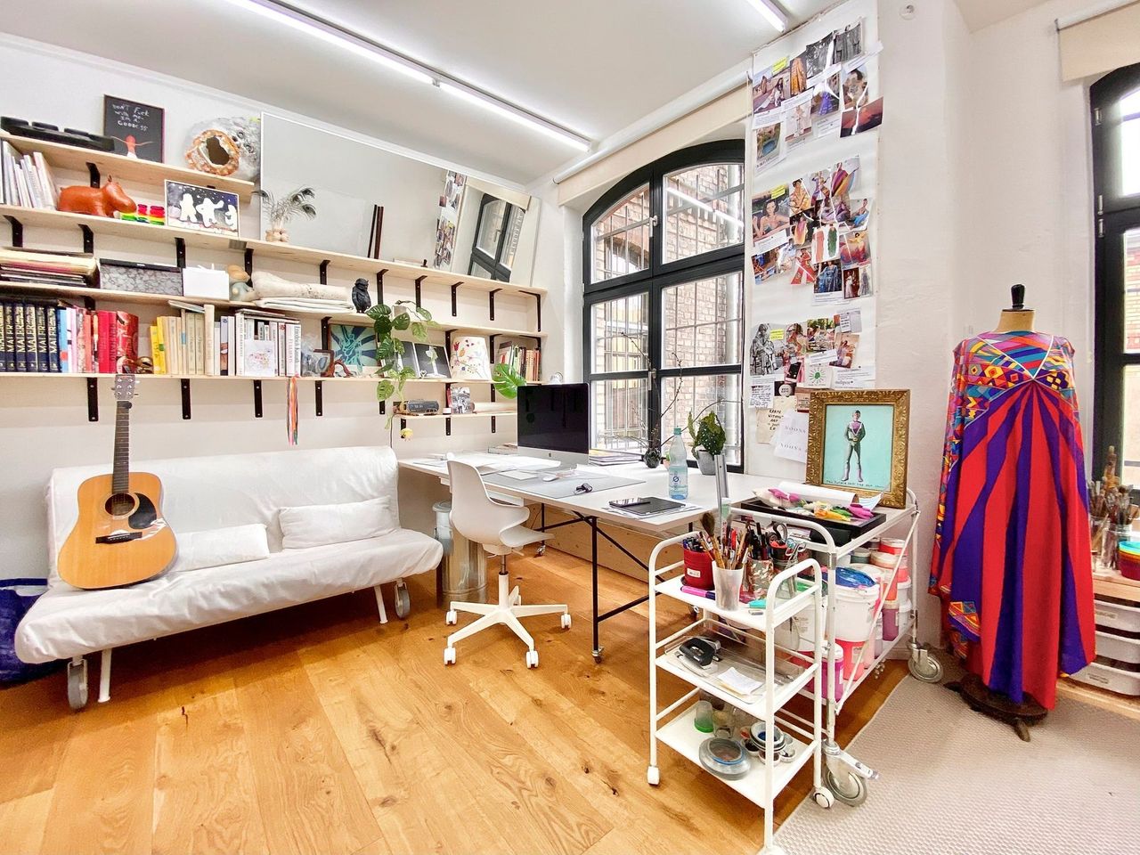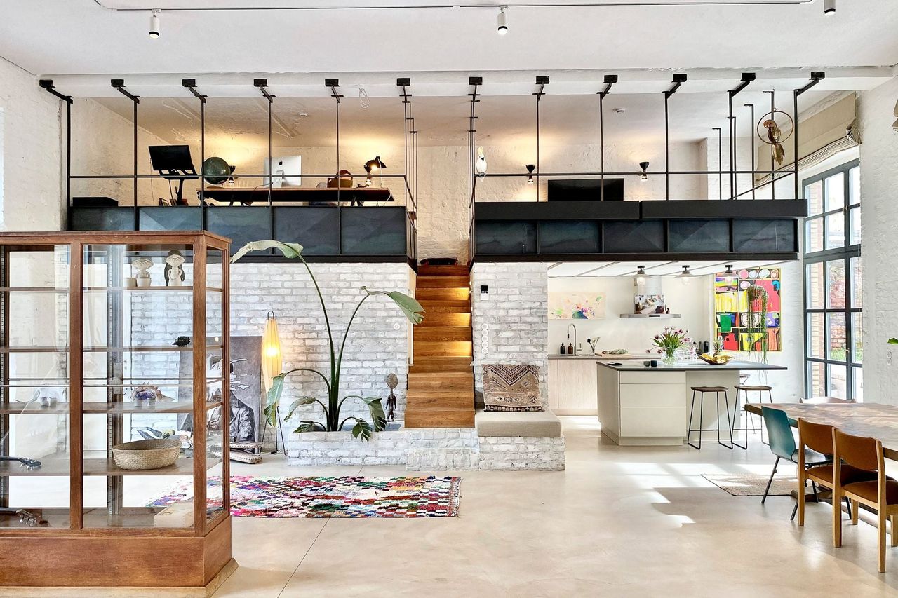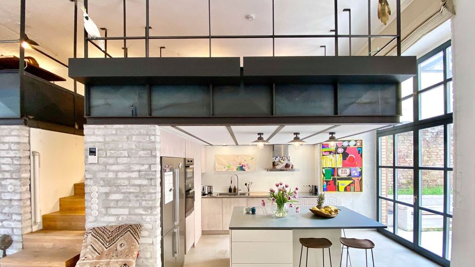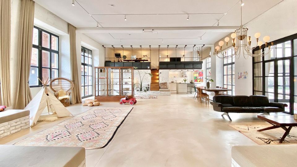 Loftwohnung mit erlesener Einrichtung auf 280 qm im Erdgeschoss. Die Terrasse misst 30 qm. Die Decke ist 4,40 Meter hoch und mit Akustikelementen versehen. Sie verfügt über zwei individuell gestaltete Bäder und eine Sauna.