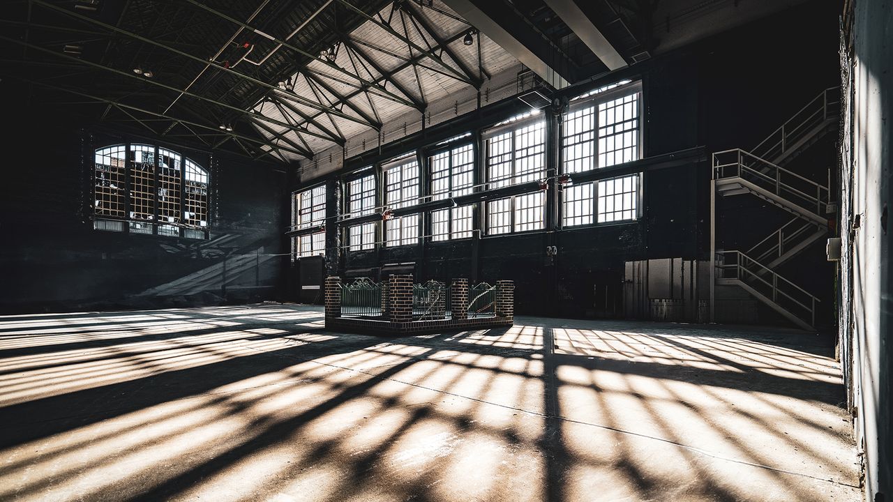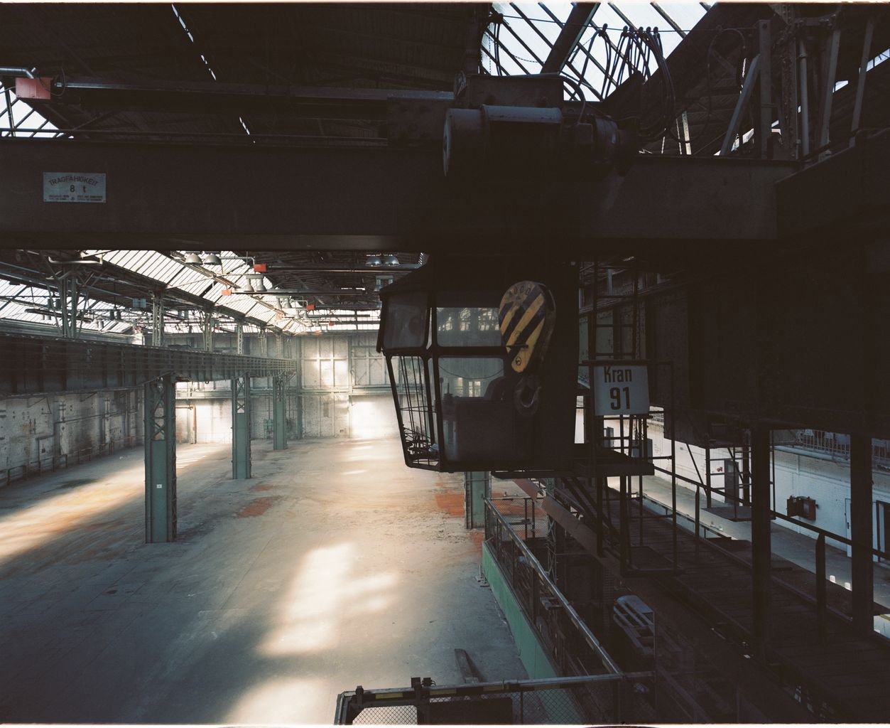 Das Herz des Gebäudes verfügt über 2,800 m2 Industriehalle mit einer Raumhöhe von mehr als 12 Metern. Der Stahlskeletbau mit seinen 4 fahrbaren Kränen präsentiert sich geradezu monumental gegenüber dem Betrachter.